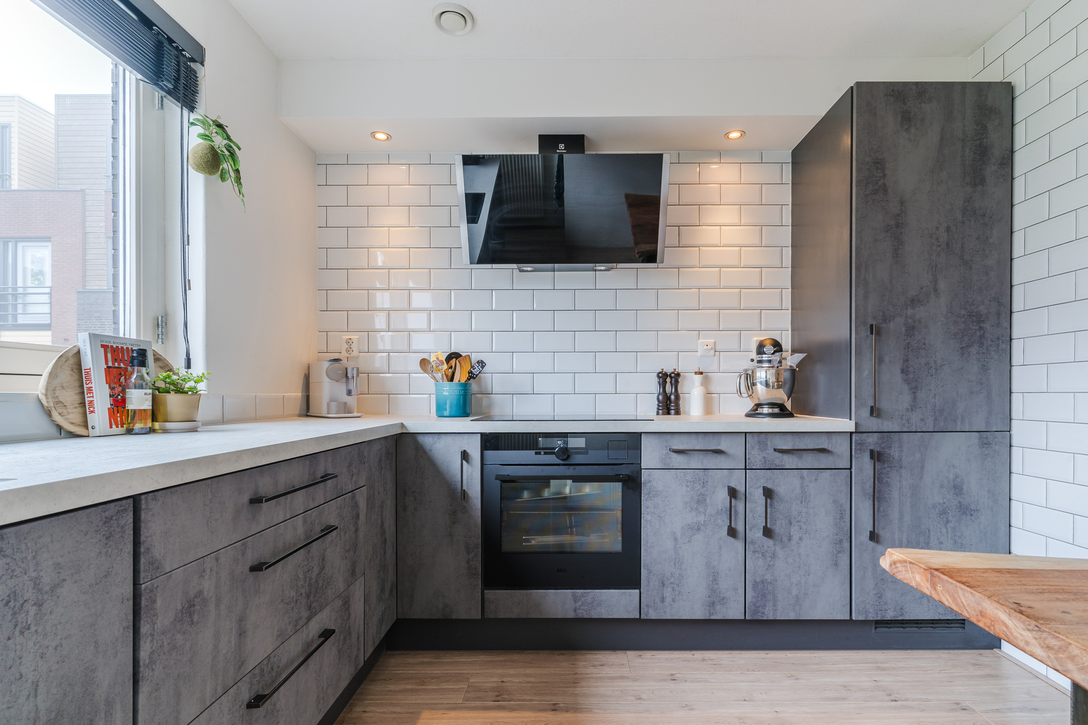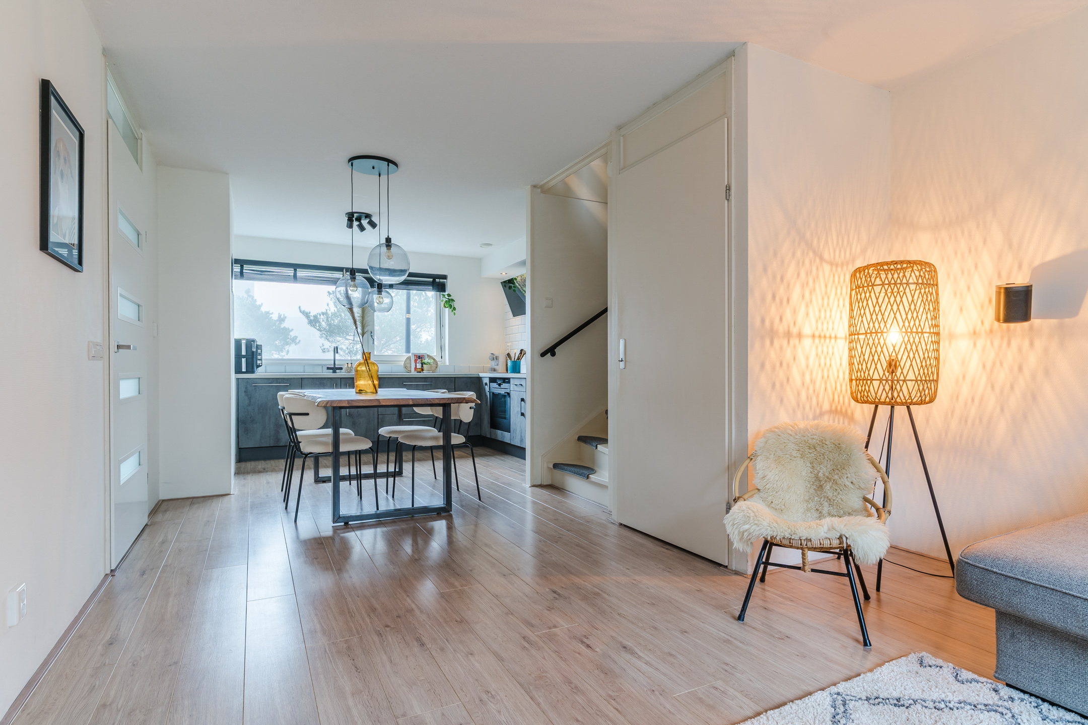 Entree met hal, meterkast, modern betegelde toiletruimte voorzien van wandcloset met fonteintje 2025, tuingerichte woonkamer, open trap, moderne keuken in hoekopstelling. De begane grond beschikt ten slotte over een mooie laminaatvloer in houtlook.