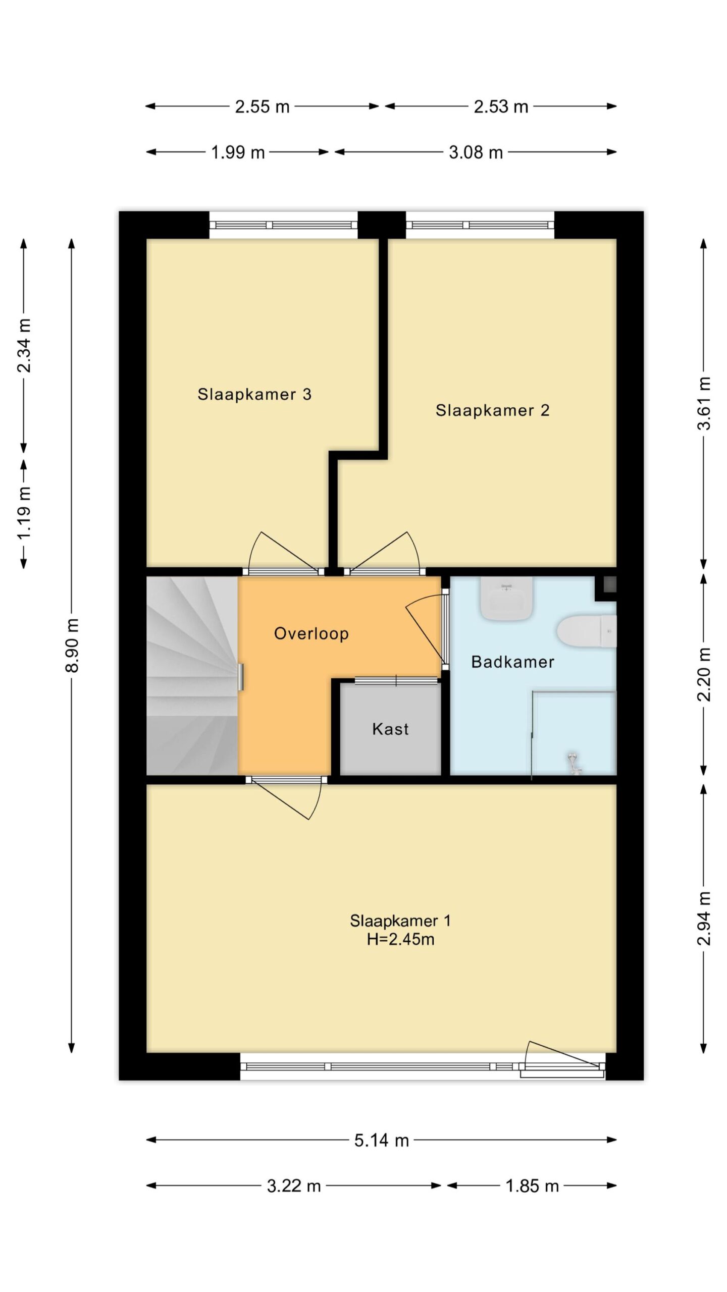 De overloop geeft toegang tot 3 slaapkamers, kast voor de cv-opstelling (2023), alsmede tot een moderne badkamer die is uitgerust met een inloopdouche, wastafelmeubel en 2e toilet.