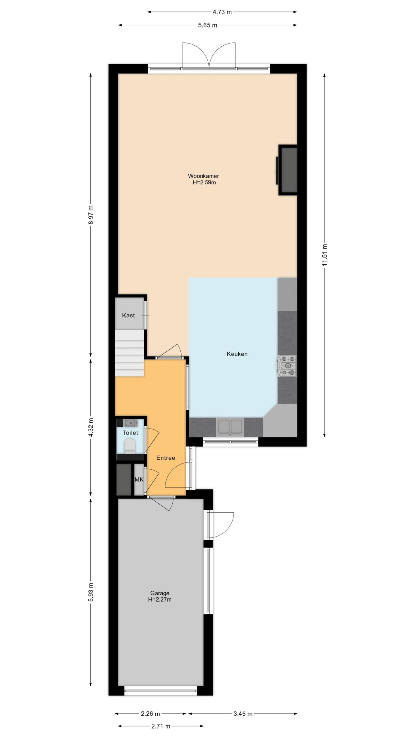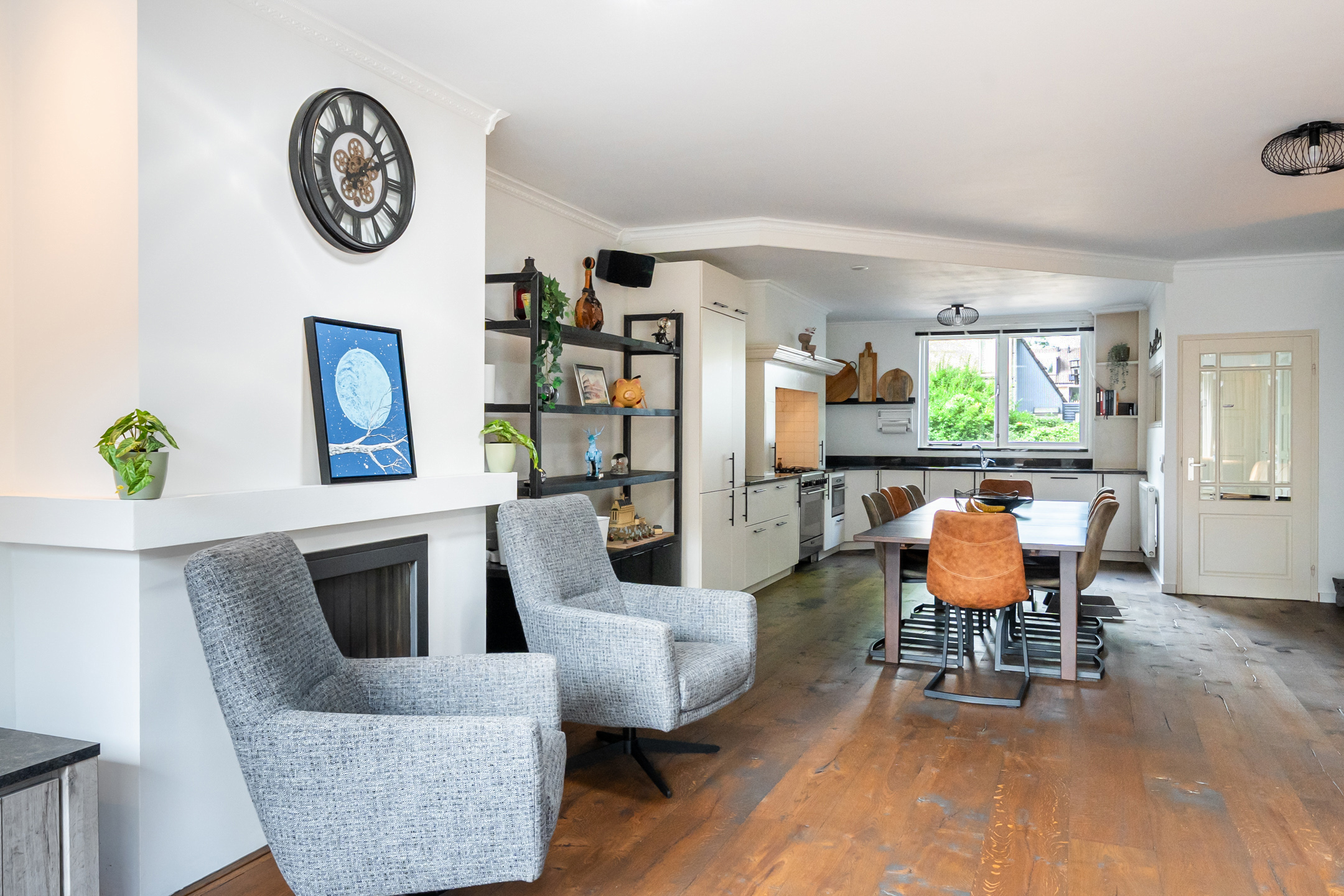 Entree, ruime hal, meterkast, doorgang naar garage, trap, moderne toiletruimte voorzien van wandcloset en fonteintje. De uitgebouwde woonkamer met openslaande deuren is v.v. een gashaard, is tuingericht en geeft u een mooi zicht op een robuuste overkapping, die gesitueerd is over de volle breedte van de achtertuin. De keuken bevindt zich aan de voorzijde, is ruim en v.v. inbouwapparatuur. De gehele begane grondvloer is v.v. massief houtenvloerdelen en alle wanden zijn strak gestuukt.