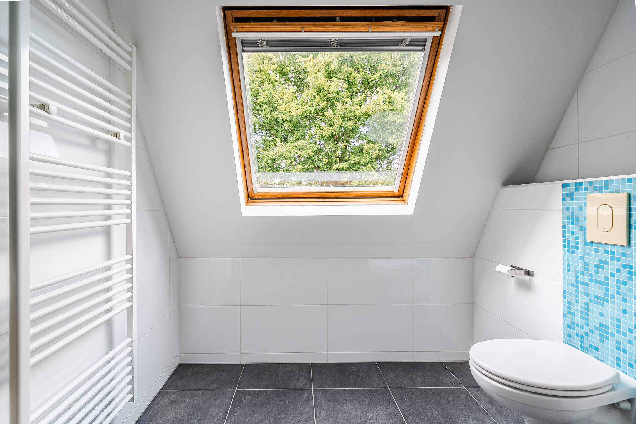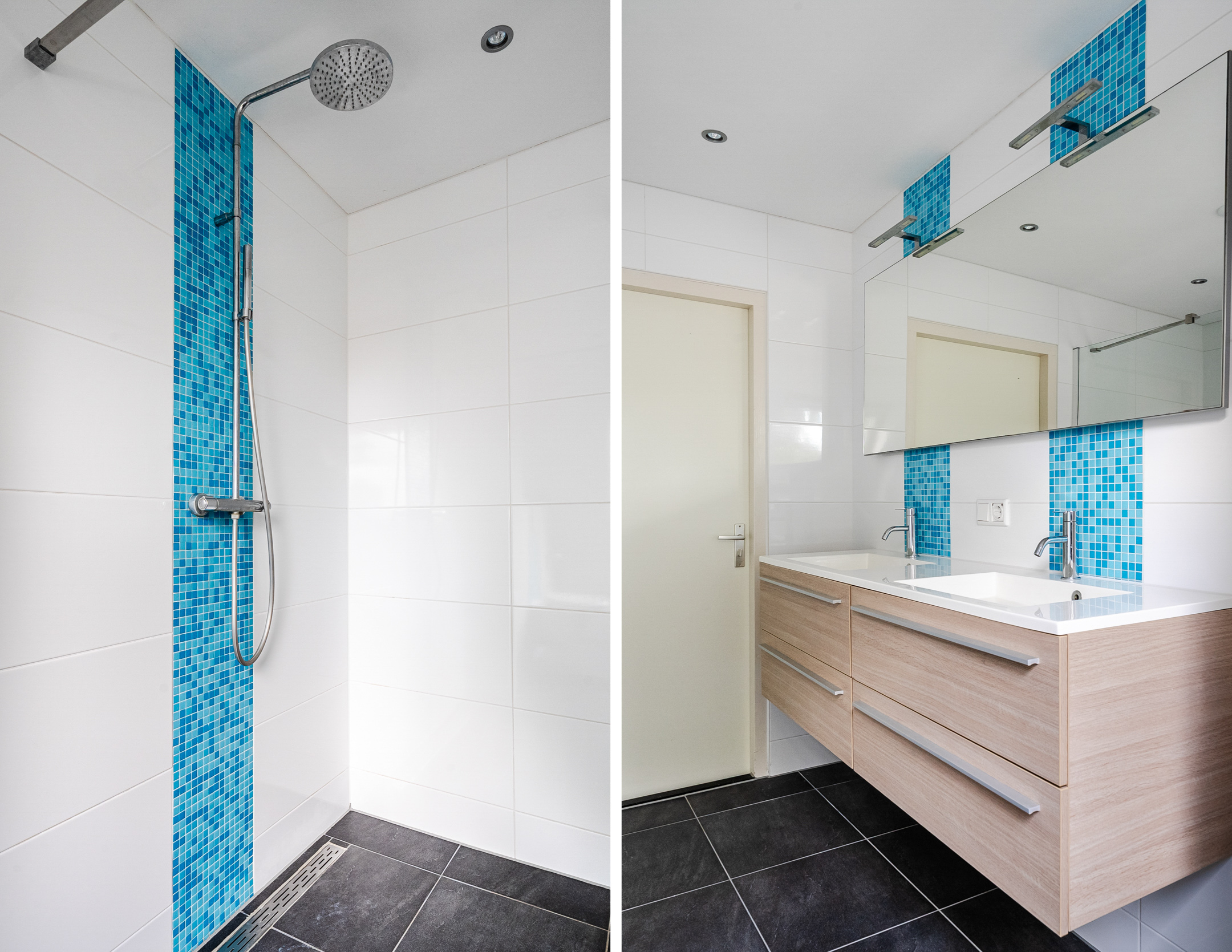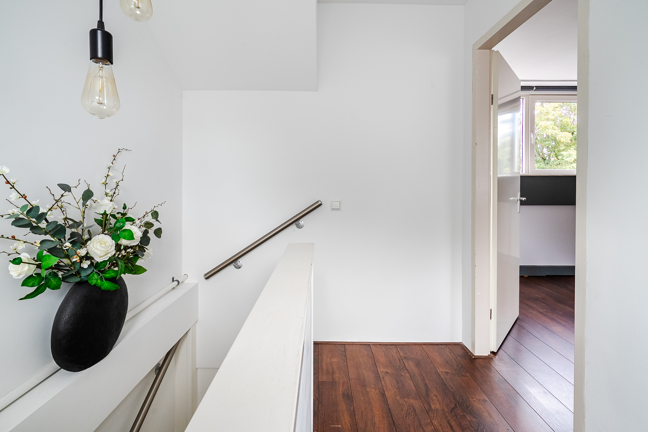 Overloop, 3 goede slaapkamers, alsmede een moderne en geheel betegelde badkamer met inloop douche, dubbel wastafelmeubel, 2e toilet en designradiator. De verdieping is afgewerkt met een knappe laminaatvloer en ook hier zijn alle wanden strak gestuukt.