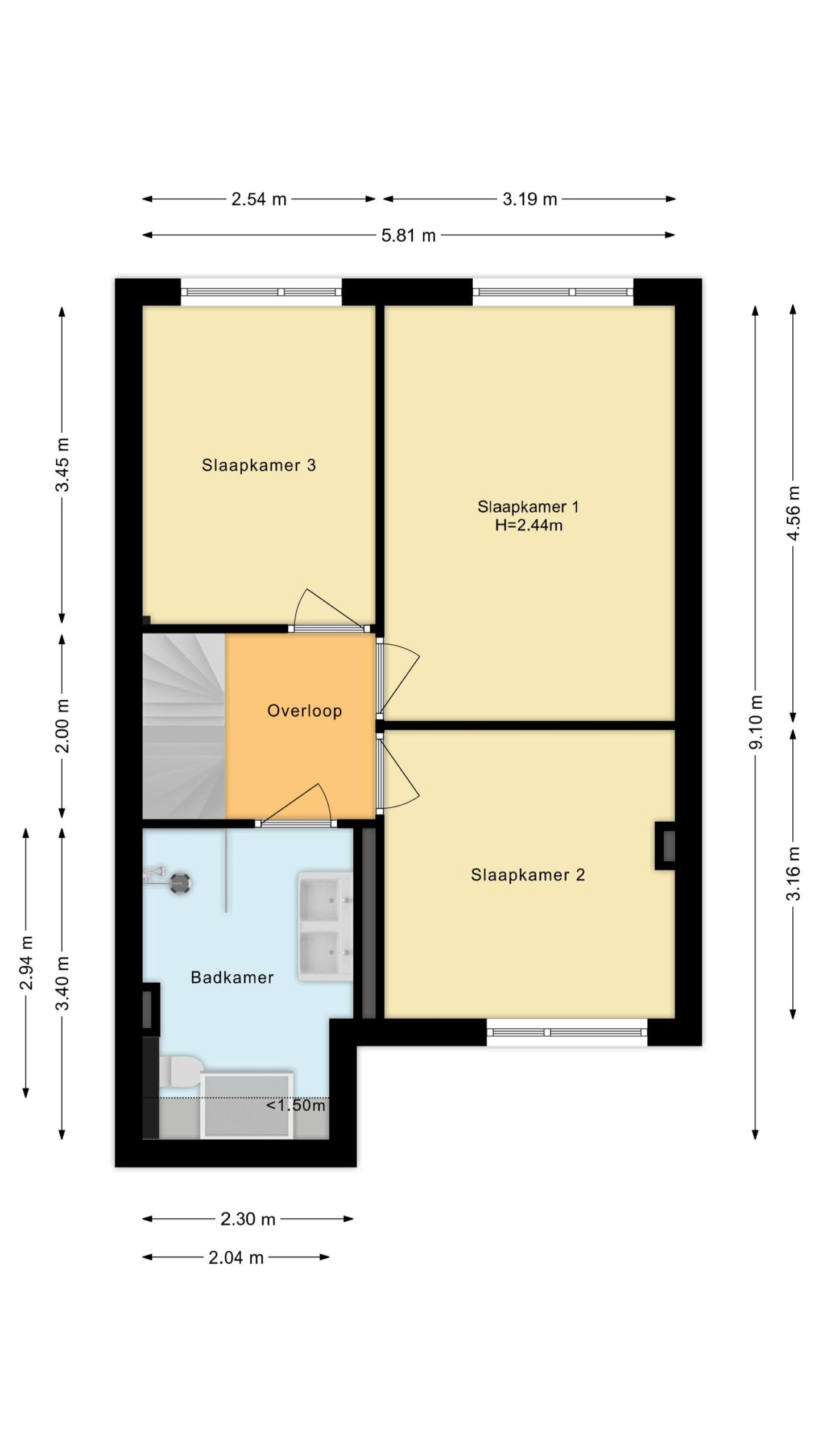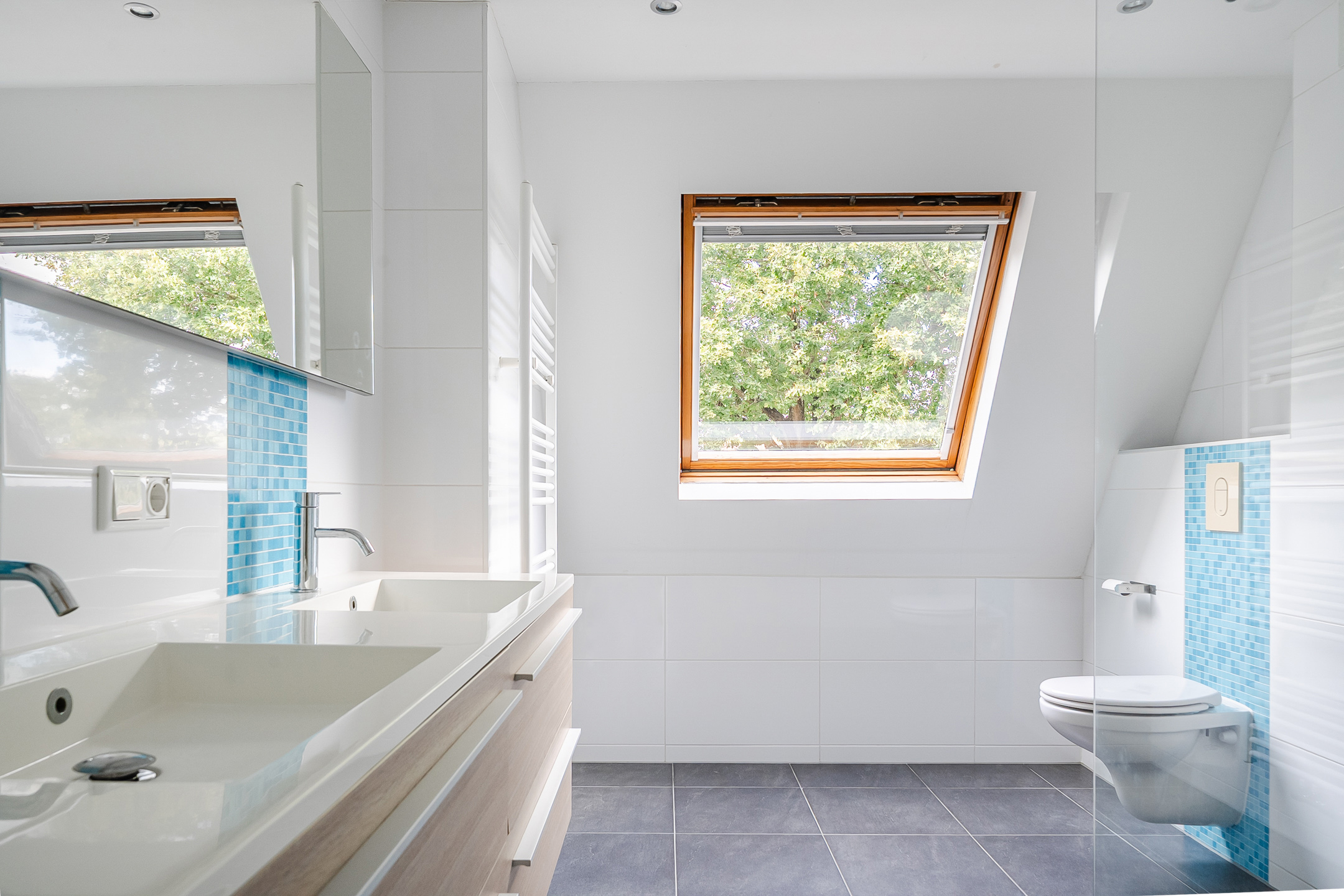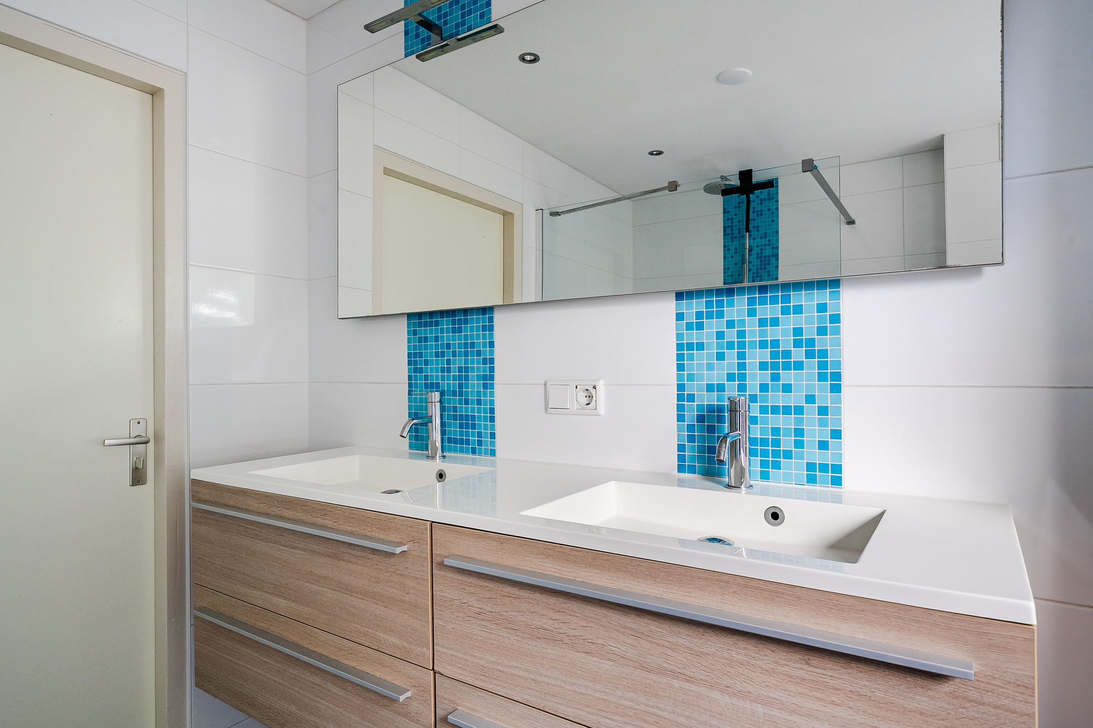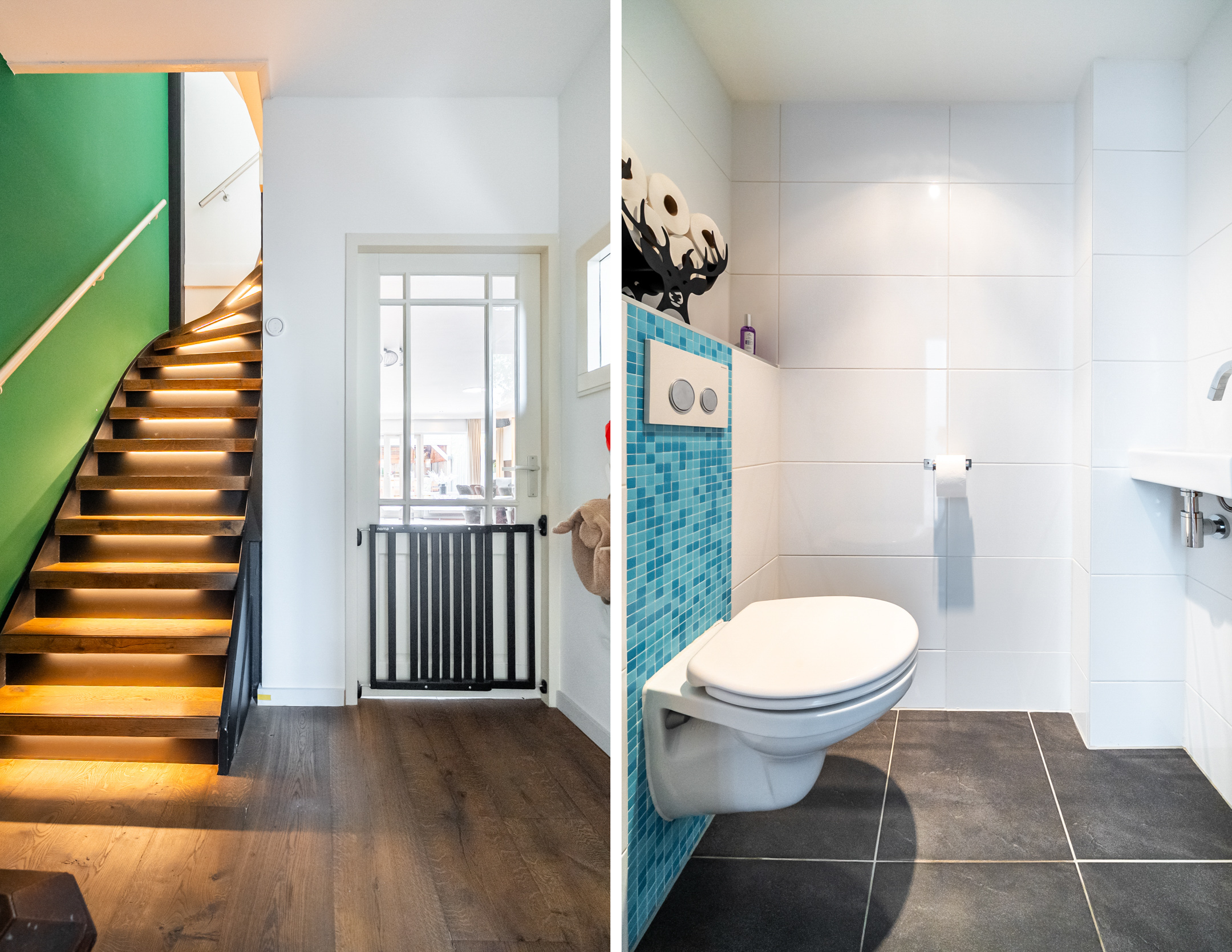 Overloop, 3 goede slaapkamers, alsmede een moderne en geheel betegelde badkamer met inloop douche, dubbel wastafelmeubel, 2e toilet en designradiator. De verdieping is afgewerkt met een knappe laminaatvloer en ook hier zijn alle wanden strak gestuukt.
