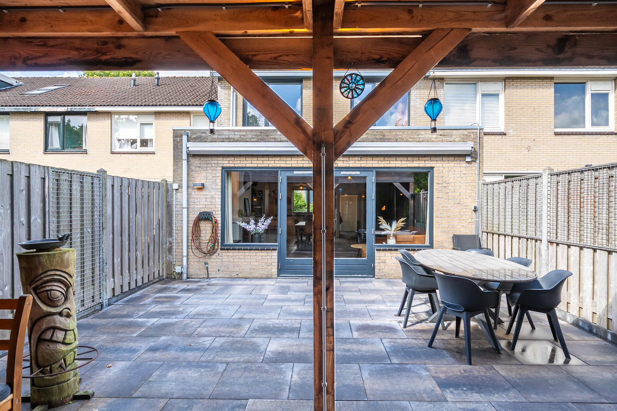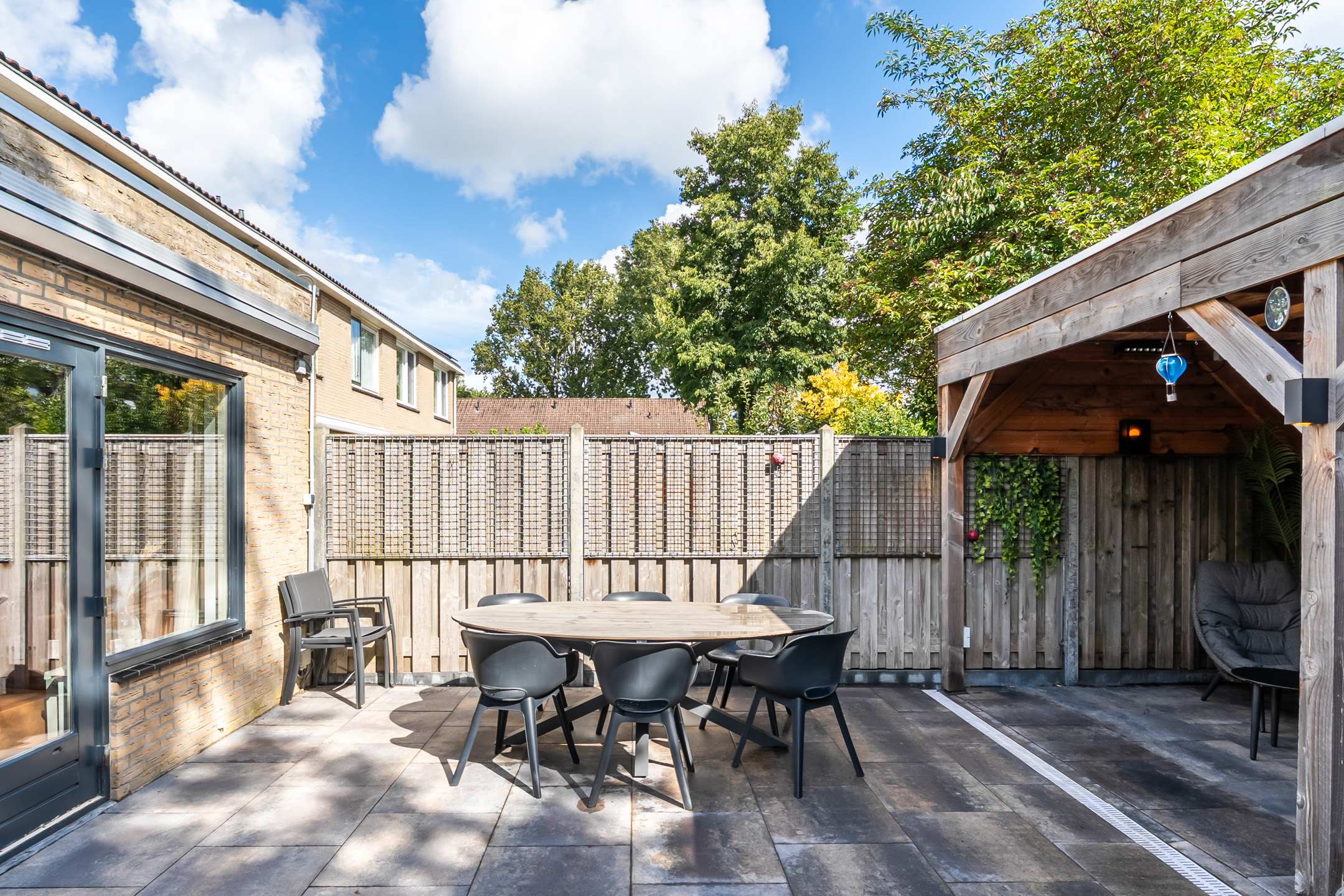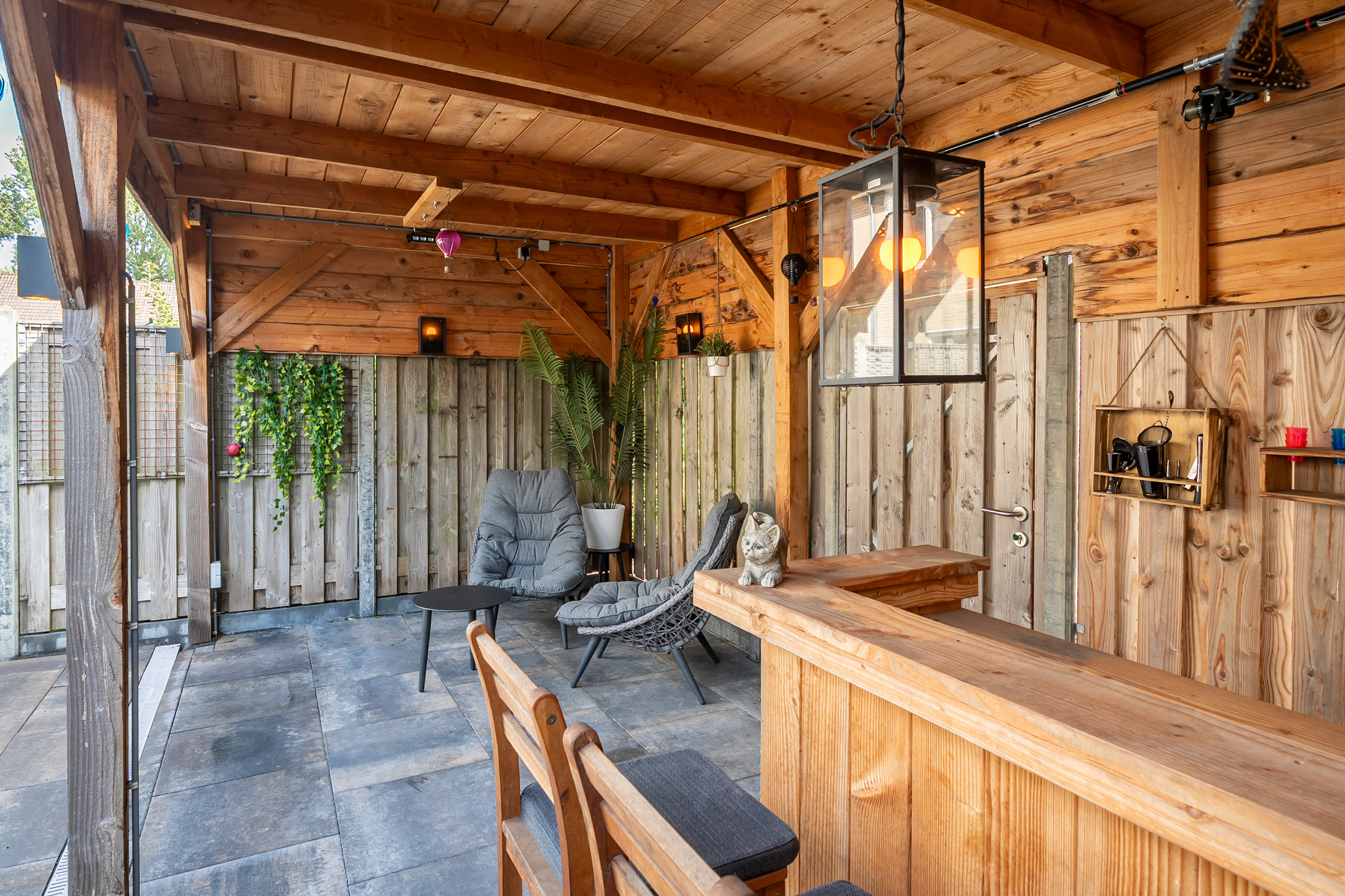 Zowel de voor- , als achtertuin zijn volledig bestraat, dus daar heeft u geen groene vingers voor nodig. In de achtertuin staat nog een stoere overkapping om gezellig te kunnen zitten.