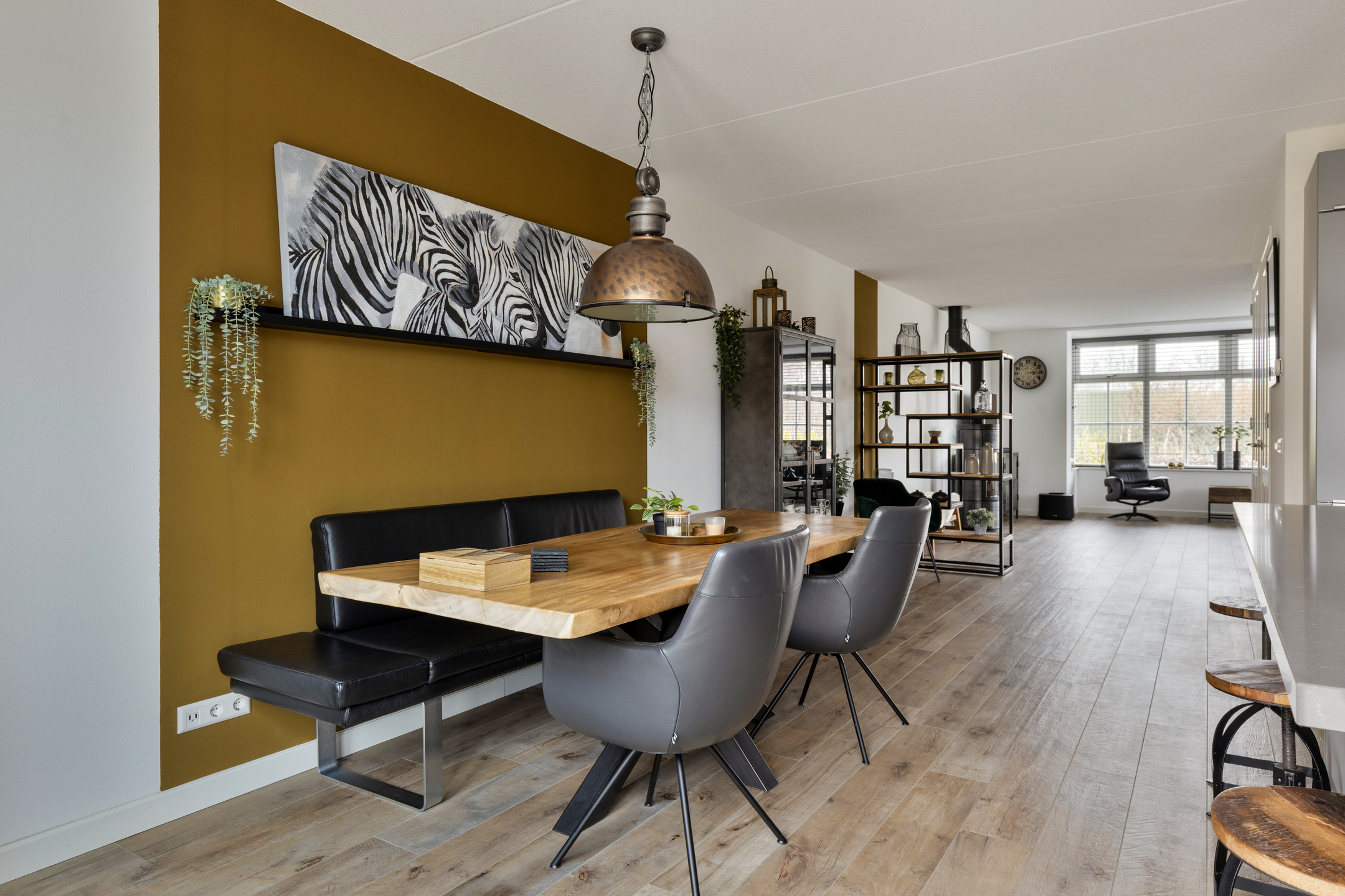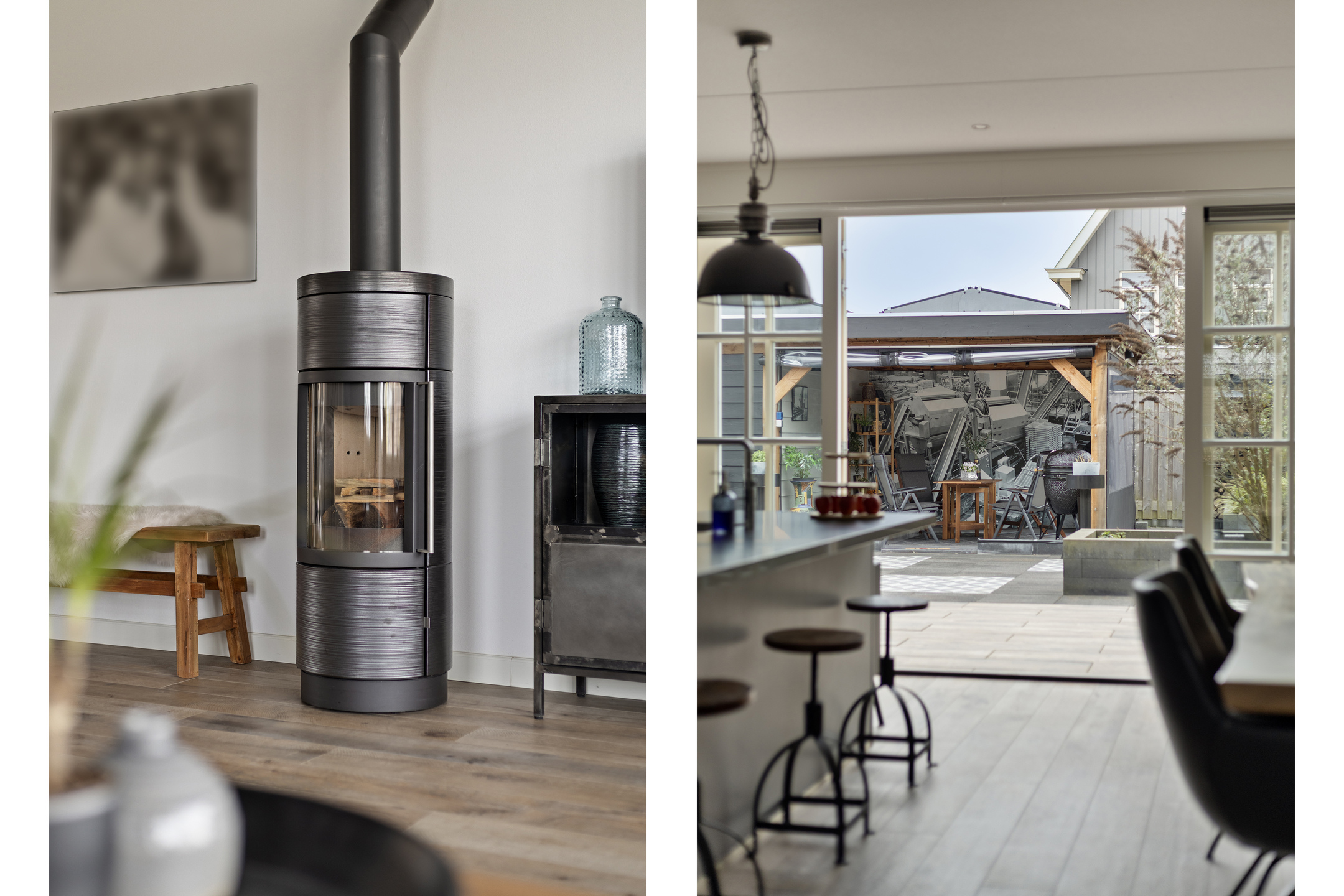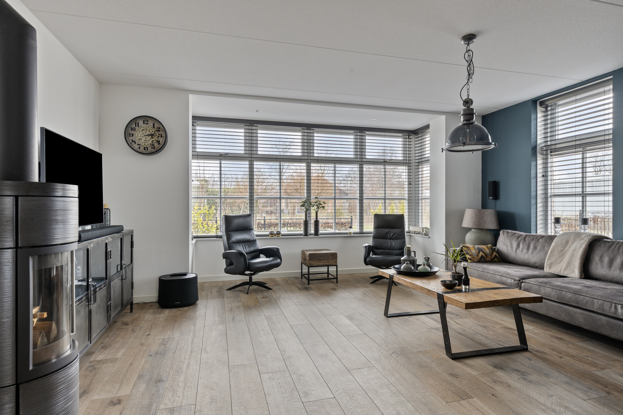Via de entree kom je binnen in de hal met meterkast, trapopgang, modern toilet met fonteintje en toegang tot de woonkamer. De uitgebouwde woonkamer is ruim opgezet en prachtig afgewerkt met gestuukte wanden en houtlook tegelvloer met vloerverwarming. De grote raampartijen en de erker aan de voorzijde zorgen voor een heerlijke lichte woning. De luxe houtkachel vormt hier een sfeervol en functioneel middelpunt.
