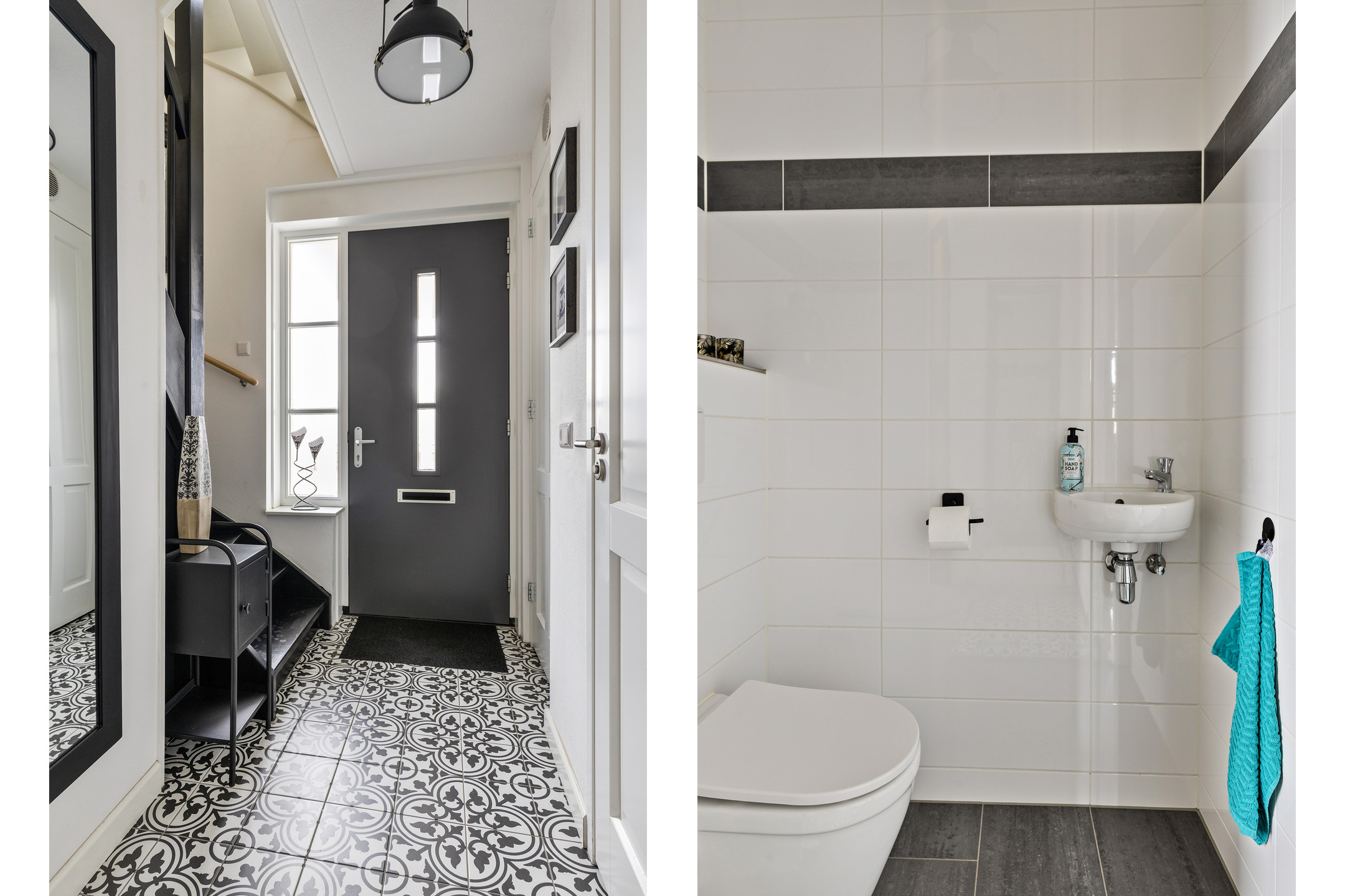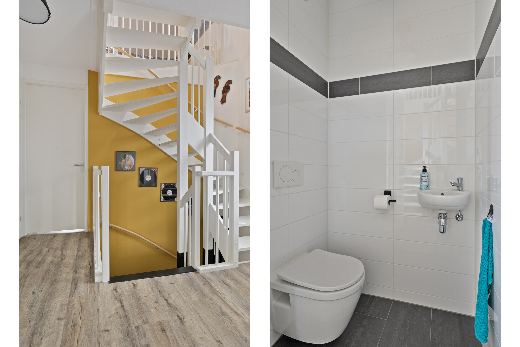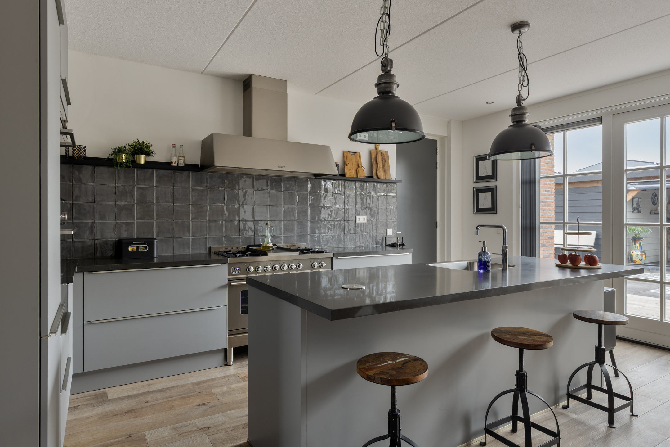 Via de entree kom je binnen in de hal met meterkast, trapopgang, modern toilet met fonteintje en toegang tot de woonkamer. De uitgebouwde woonkamer is ruim opgezet en prachtig afgewerkt met gestuukte wanden en houtlook tegelvloer met vloerverwarming. De grote raampartijen en de erker aan de voorzijde zorgen voor een heerlijke lichte woning. De luxe houtkachel vormt hier een sfeervol en functioneel middelpunt.