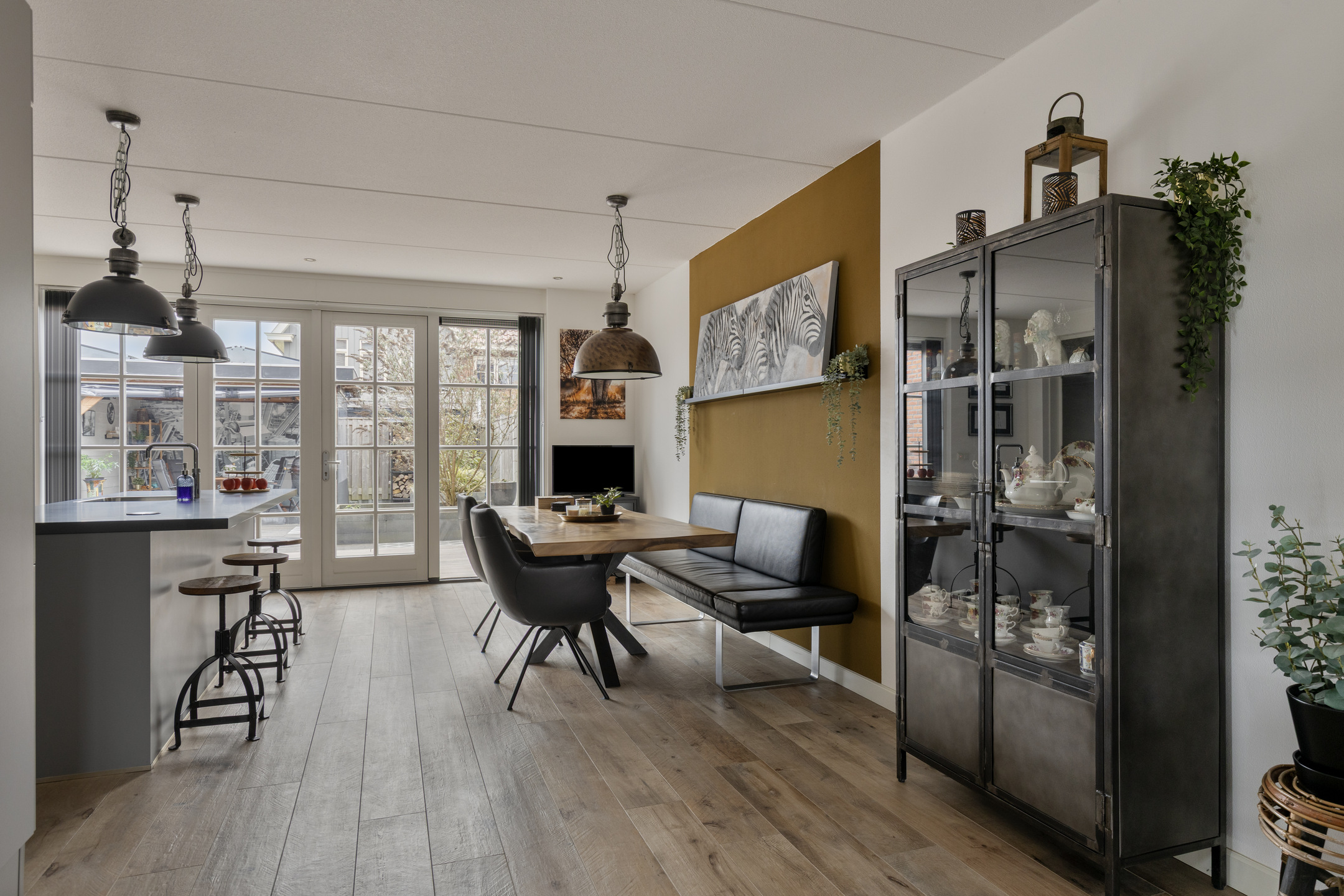 Aansluitend aan de woonkamer ligt de open keuken met kookeiland, voorzien van hoogwaardige apparatuur (breed Boretti gasfornuis met grillplaat en dubbele oven, afzuigkap, combi-oven (met magnetron), combi-oven (met stoom), vaatwasser, grote koelkast, 3 laden vriezer en Quooker), en veel werk- en bergruimte. Openslaande deuren verlenen directe toegang tot de achtertuin. Vanuit de keuken is de eerste slaapkamer bereikbaar; deze heeft een moderne badkamer en suite, uitgerust met een inloopdouche, wastafelmeubel, hangkast en wandcloset. De kamer zelf heeft aan de voorzijde openslaande deuren richting de oprit, en aan de achterzijde een loopdeur naar de achtertuin.