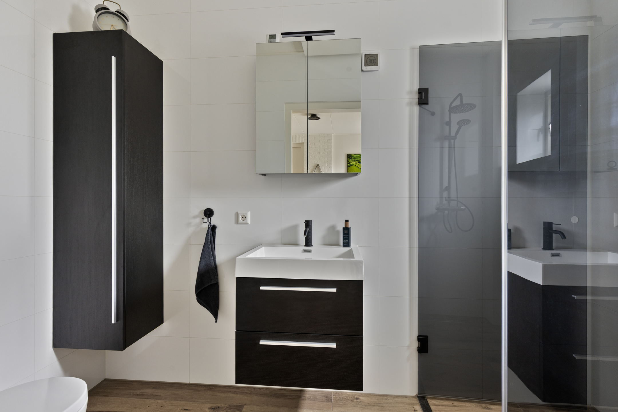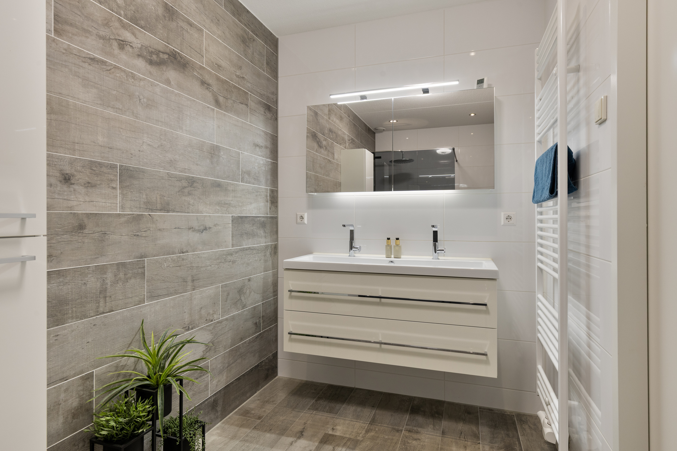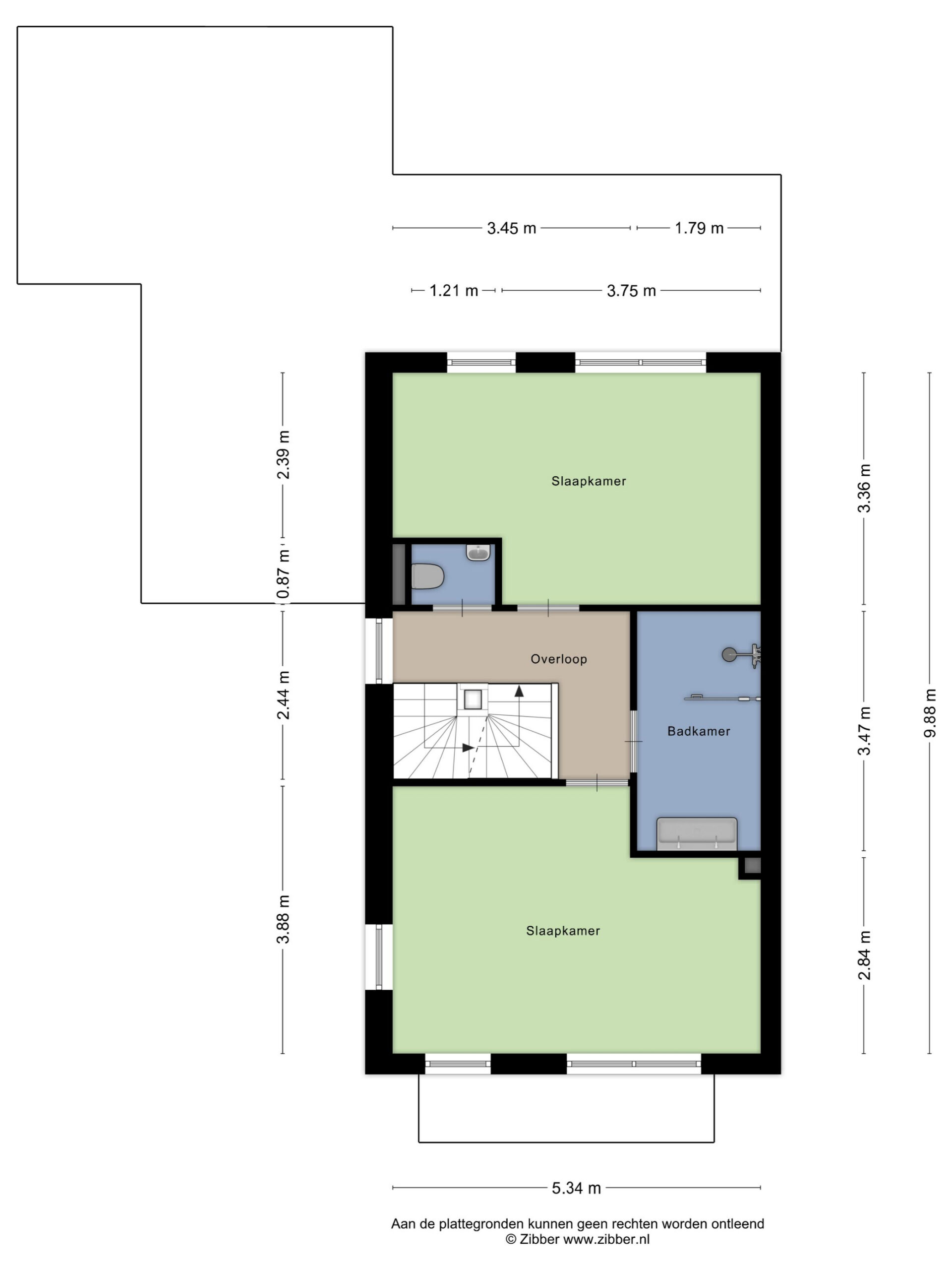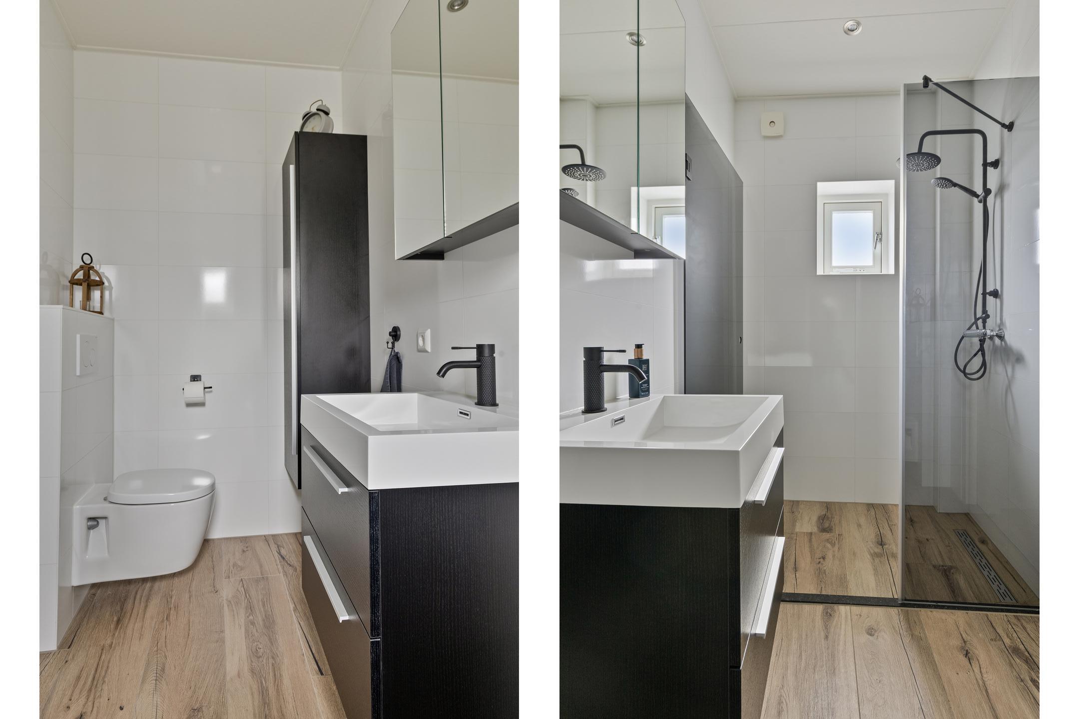 Op de eerste verdieping bevinden zich twee (voorheen 3) ruime slaapkamers (3,36 x 5,34 en 3,88 x 5,34), beide met voldoende daglicht en een praktische indeling. Daarnaast is er een modern uitgevoerde badkamer met inloopdouche (inclusief regendouche), een dubbele wastafel met meubel, hangkast en spiegelkast. Aan de overloop grenst tevens een separate toiletruimte, voorzien van wandcloset en fonteintje.