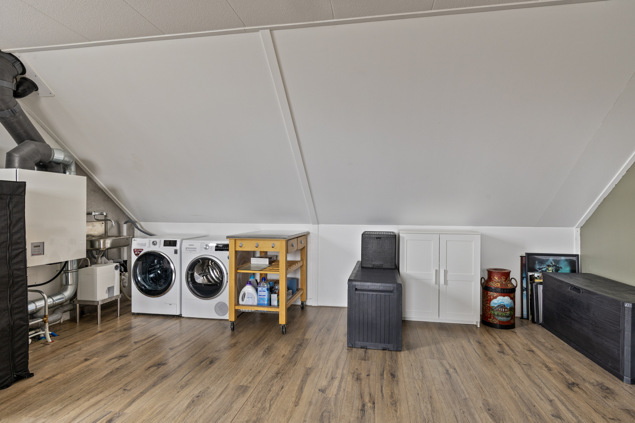 Deze verrassende tweede verdieping is ingericht als een royale slaapkamer met extra bergruimte achter de knieschotten. Ook de witgoedaansluitingen en de technische installaties zijn op deze verdieping gesitueerd. Deze verdieping is eenvoudig geschikt te maken als slaapkamer, maar ook goed te gebruiken als werk- of hobbyruimte. Er is een wastafel met close in boiler aanwezig. Middels een vlizotrap is de bergzolder bereikbaar, voor nog meer opbergruimte.