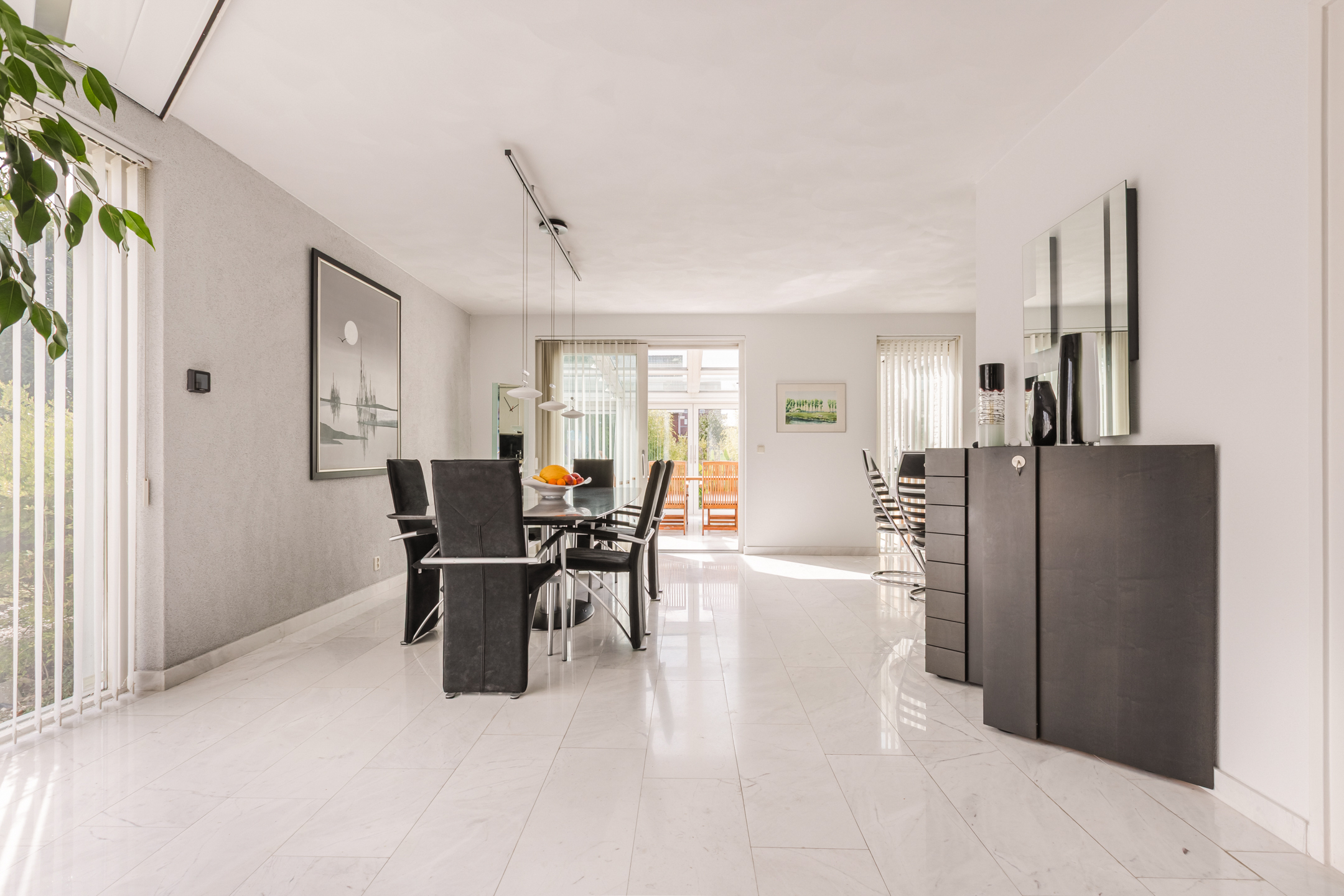 Zij-entree, royale hal met trap, vide, meterkast, garderobekast, toiletruimte met wandcloset en fonteintje, openslaande (glas)deuren naar de L-vormige woonkamer (55 m2), open keuken in hoekopstelling geplaatst met granieten werkblad en inbouwapparatuur (2010), in 2004 aangebouwde serre met schuifdak en zonwering, bijkeuken met aansluitend de eerste garage (afmeting circa 3,23 meter breed x circa 6,60 meter diep); de opstelling van de cv-installatie/warmtepomp bevindt zich in deze garage. Aangebouwde (carport)garage (afmeting circa 2,94 breed x 4,54 meter diep) en tuinberging. De begane grond is grotendeels afgewerkt met een marmeren en granieten vloer.