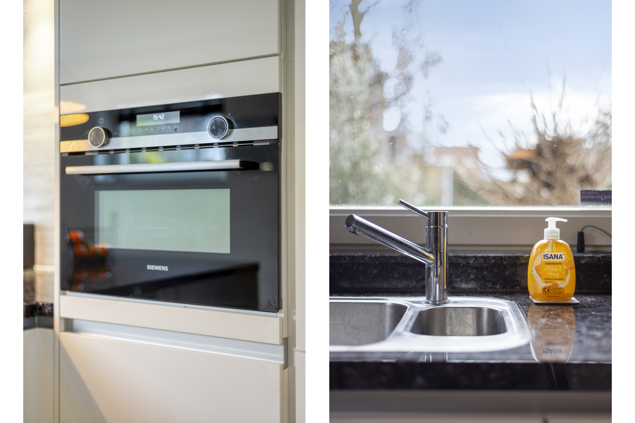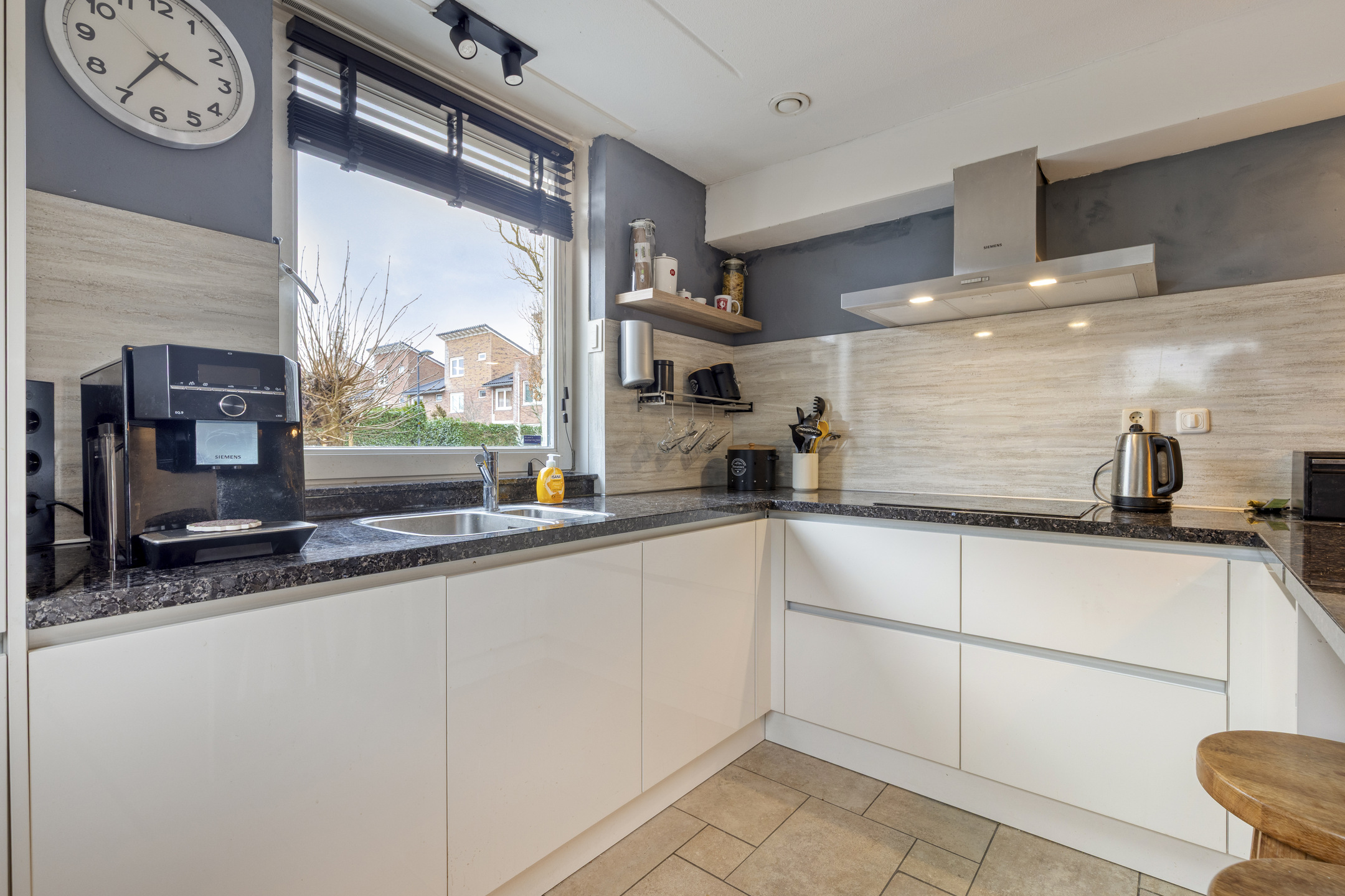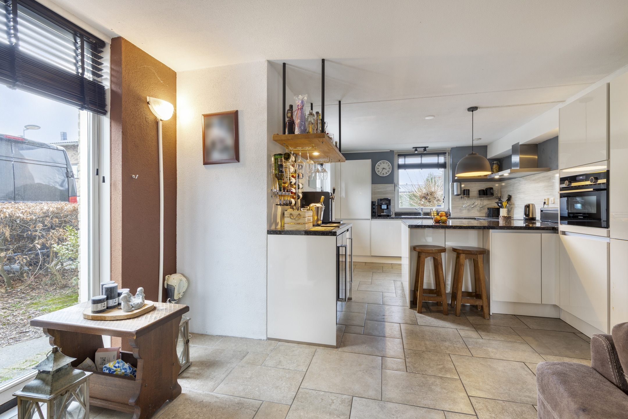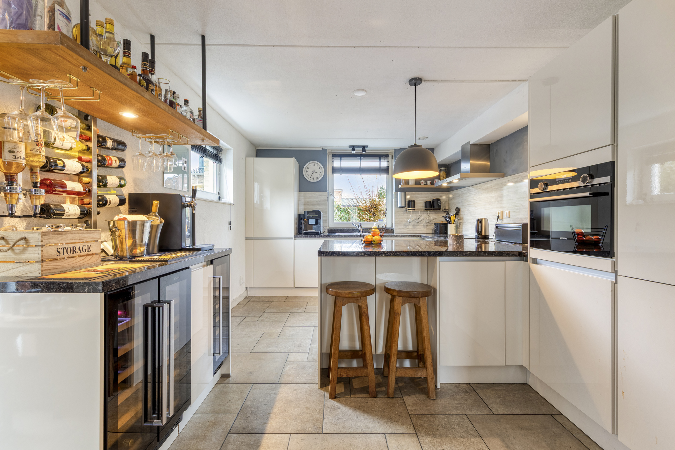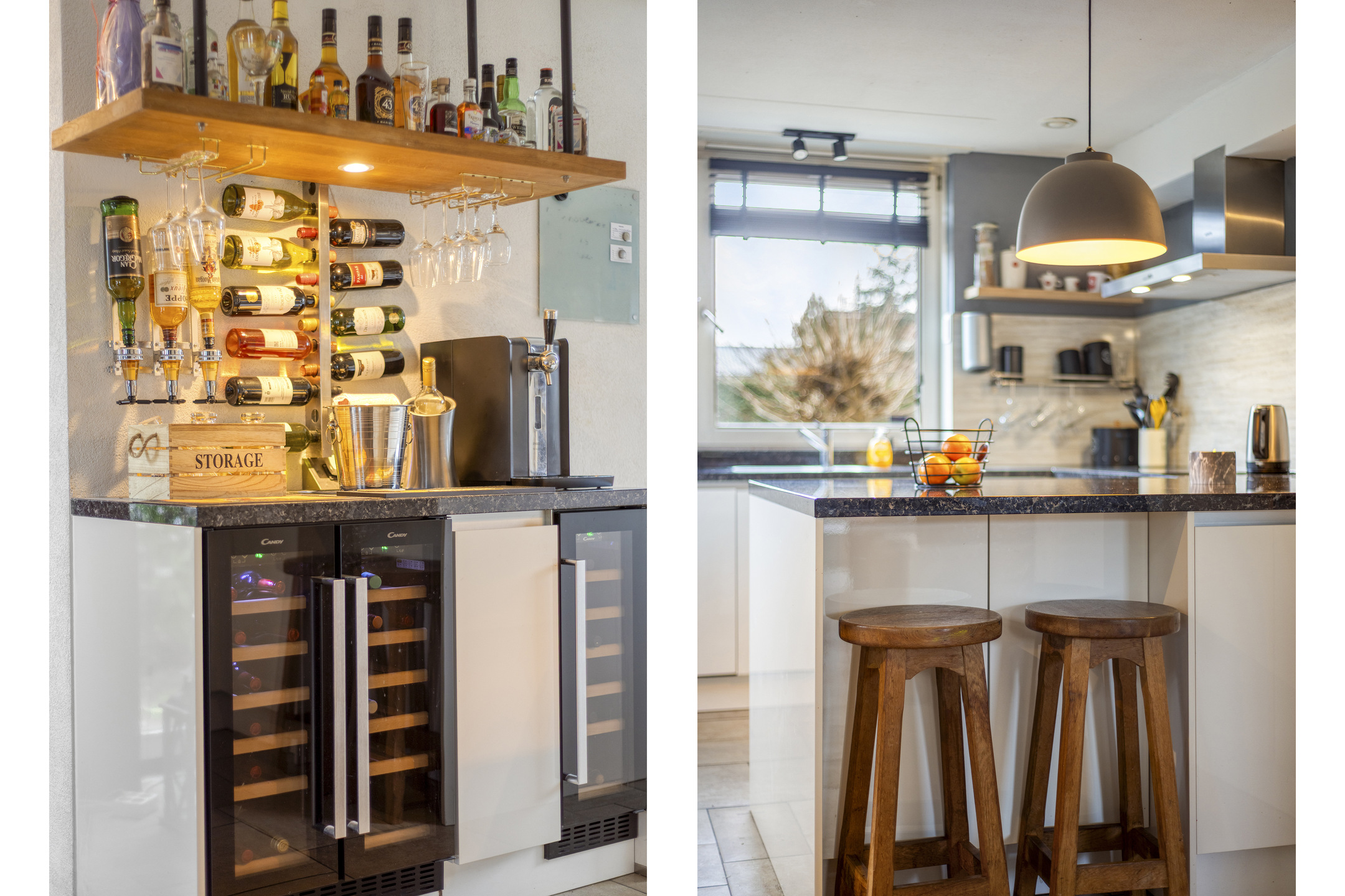 Aan de voorzijde van de woning bevindt zich de open keuken. Deze heft een L-vormig aanrecht met een barretje. Een gezellige plek om snel samen te komen. De keuken is modern afgewerkt en voorzien van een inductiekookplaat met afzuigkap, spoelbak, ingebouwde ovencombinatie, koelkast, vaatwasmachine en volop opbergruimte. De klimaatkast maakt het geheel compleet.