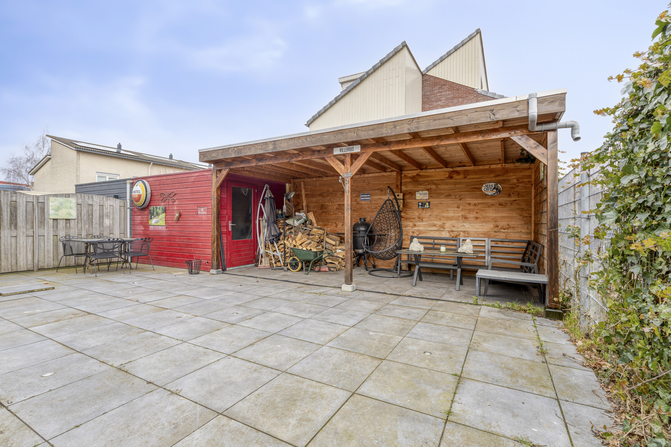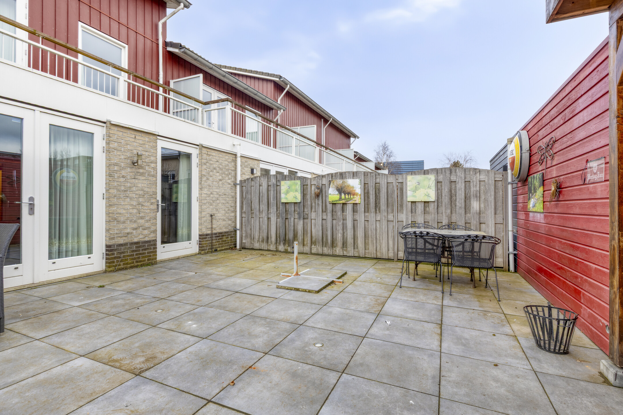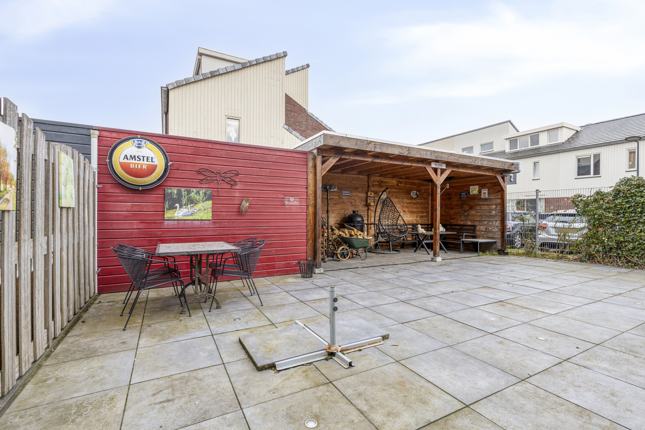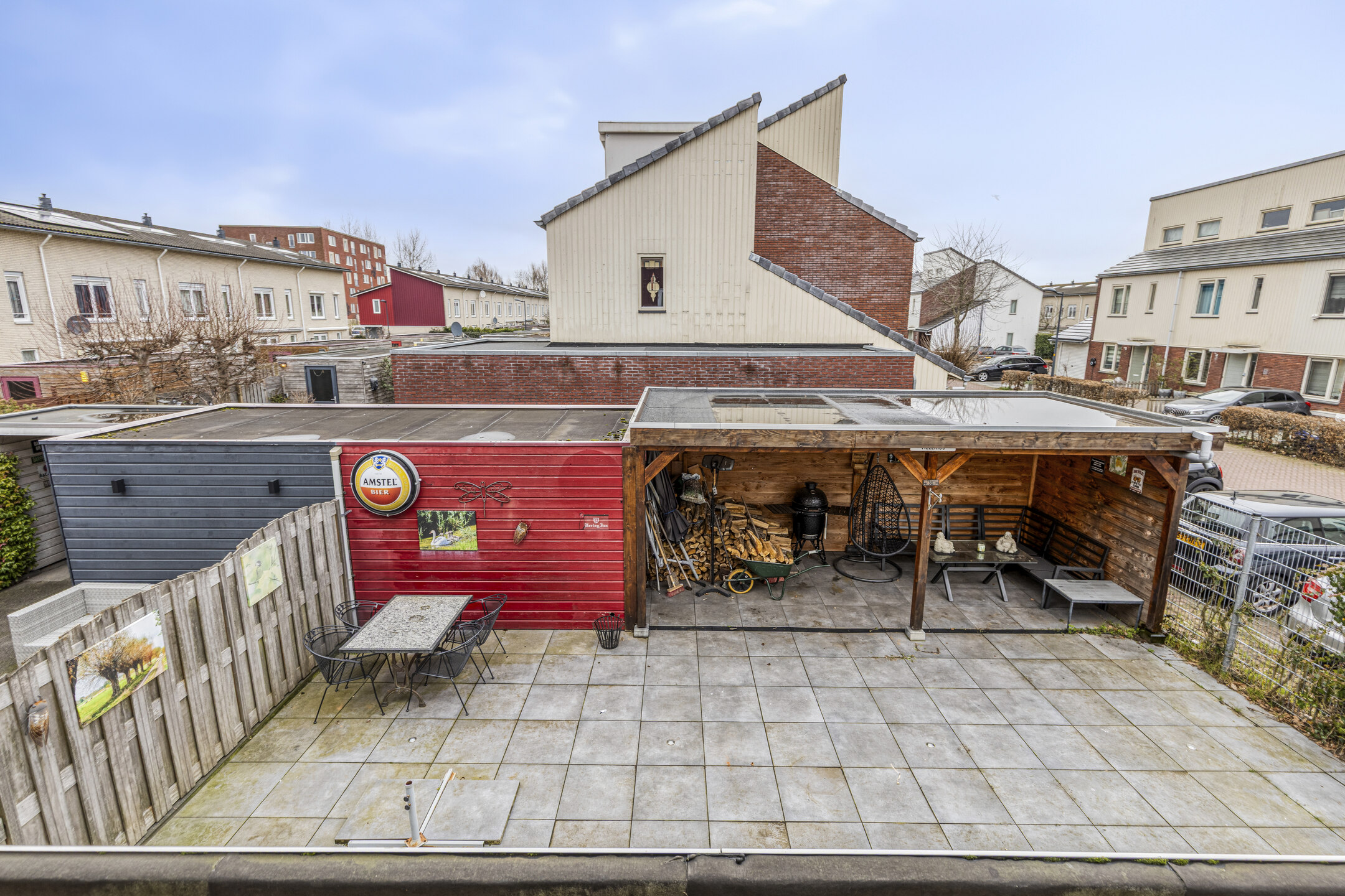 De achtertuin is bereikbaar via de openslaande deuren in de woonkamer. De tuin is bestraat en daardoor onderhoudsarm, terwijl de open ligging zorgt voor veel zonuren. Er is voldoende ruimte voor een royaal terras waar u met familie en vrienden kunt genieten van lange zomeravonden. Achterin de tuin vindt u een overkapping en een praktische berging, ideaal voor fietsen en tuinspullen. Dankzij de achterom is de tuin ook gemakkelijk bereikbaar.
