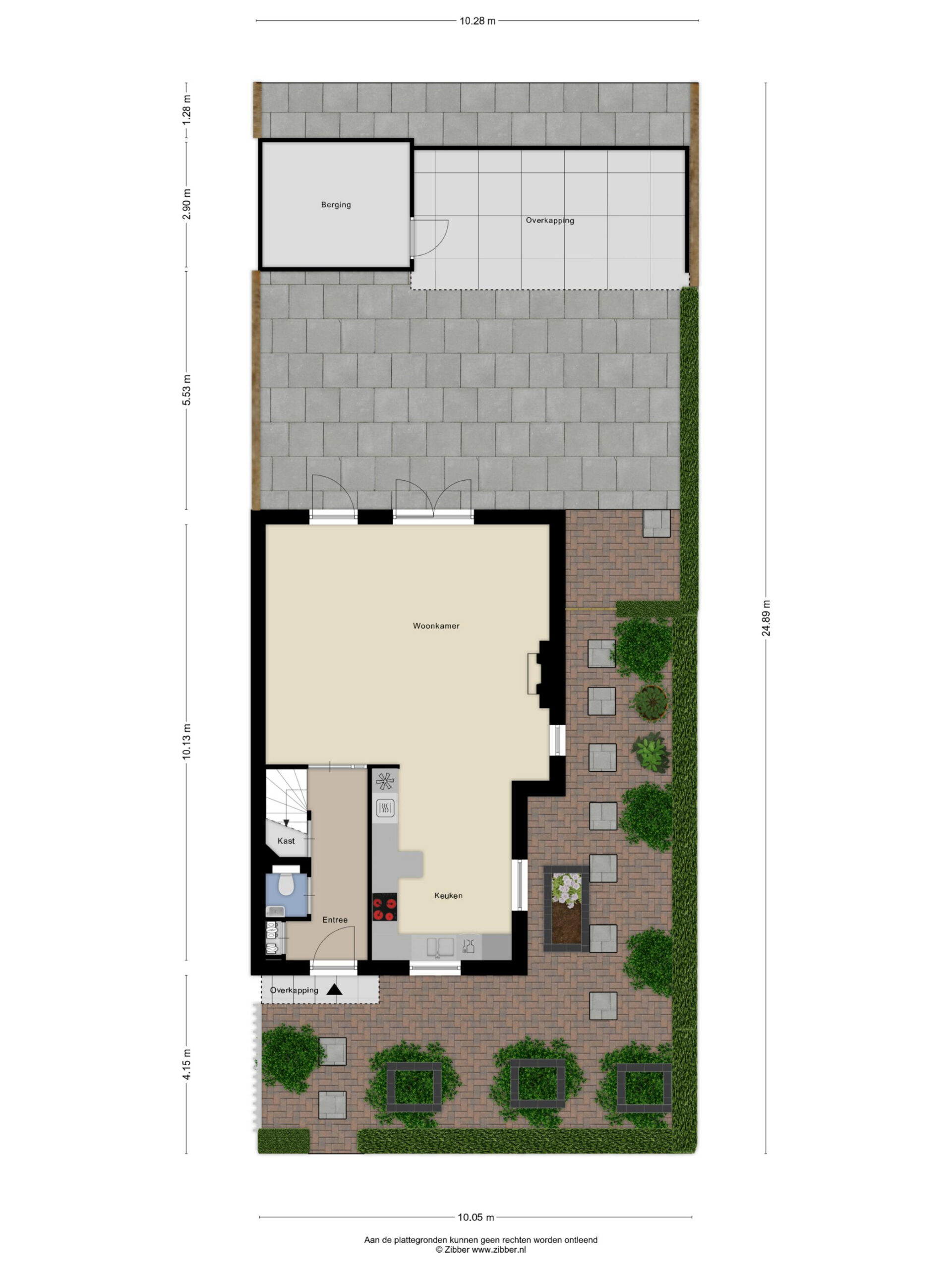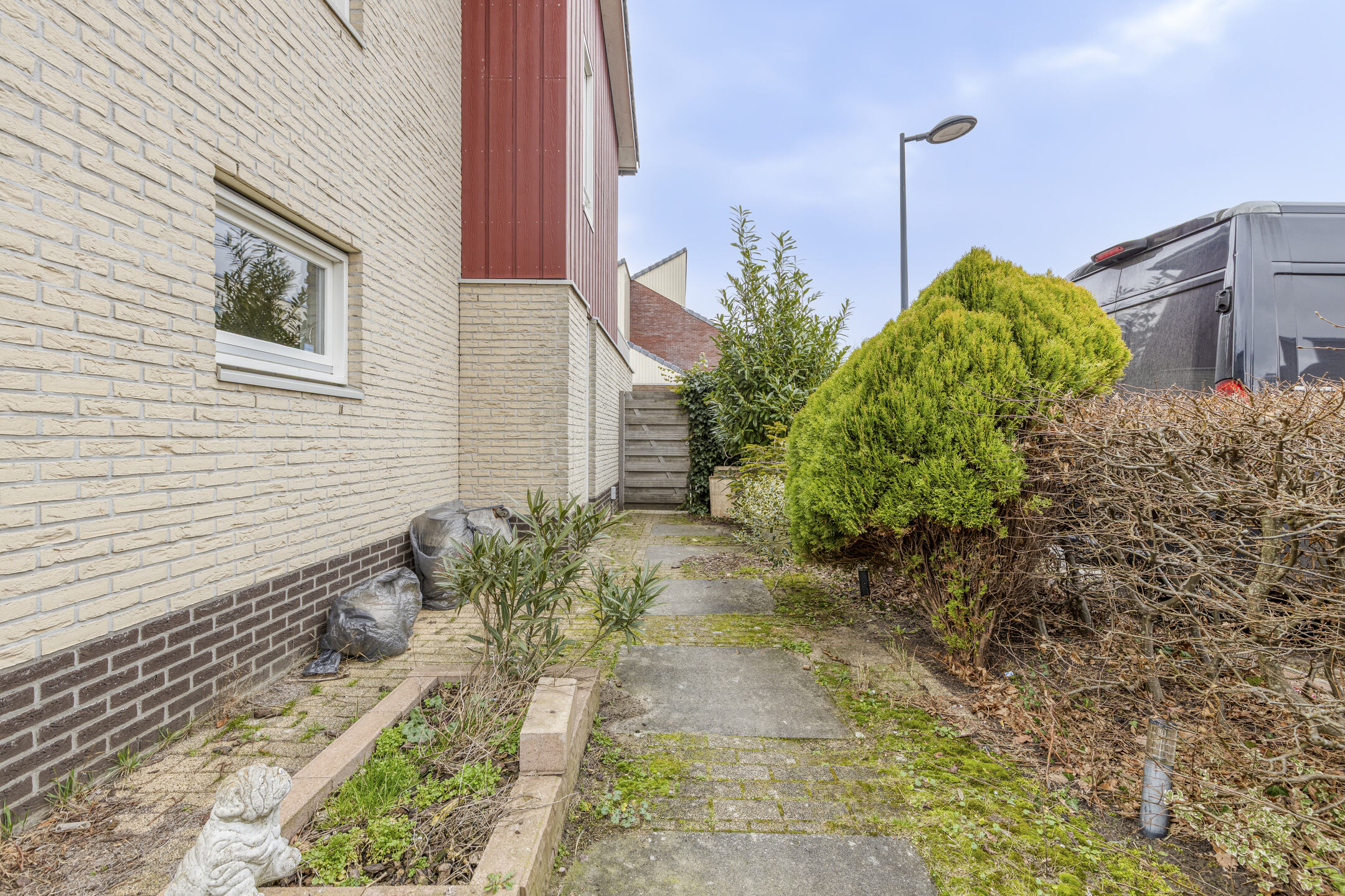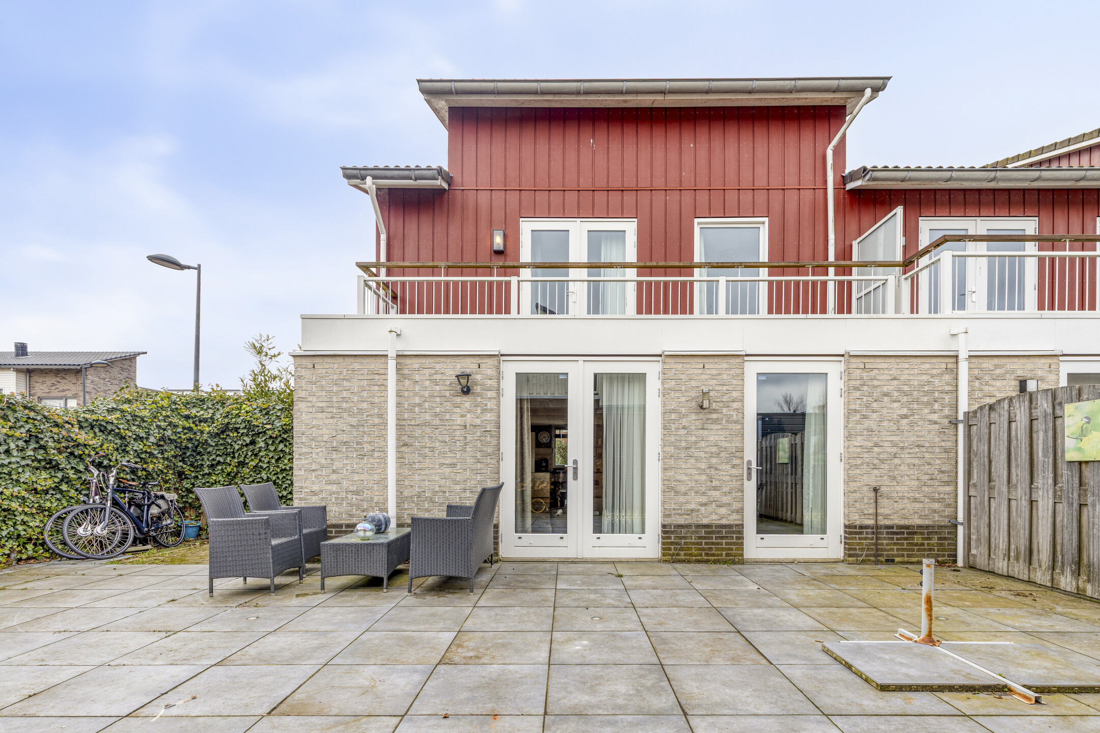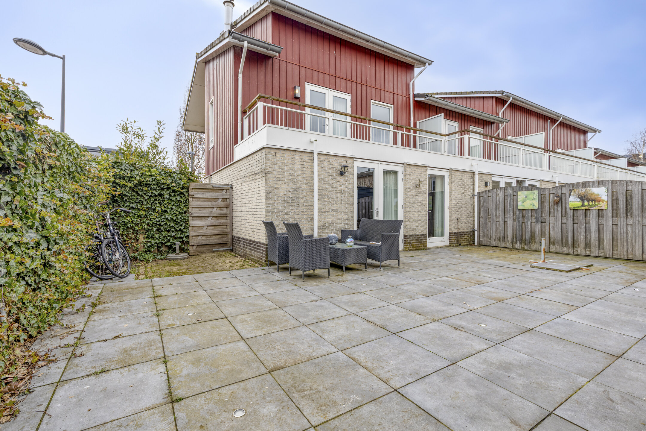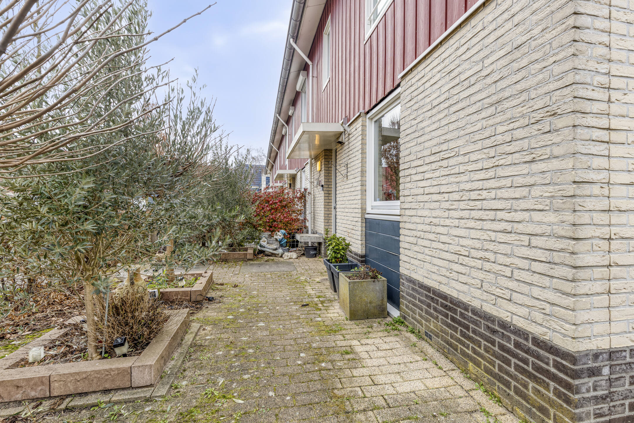 De achtertuin is bereikbaar via de openslaande deuren in de woonkamer. De tuin is bestraat en daardoor onderhoudsarm, terwijl de open ligging zorgt voor veel zonuren. Er is voldoende ruimte voor een royaal terras waar u met familie en vrienden kunt genieten van lange zomeravonden. Achterin de tuin vindt u een overkapping en een praktische berging, ideaal voor fietsen en tuinspullen. Dankzij de achterom is de tuin ook gemakkelijk bereikbaar.