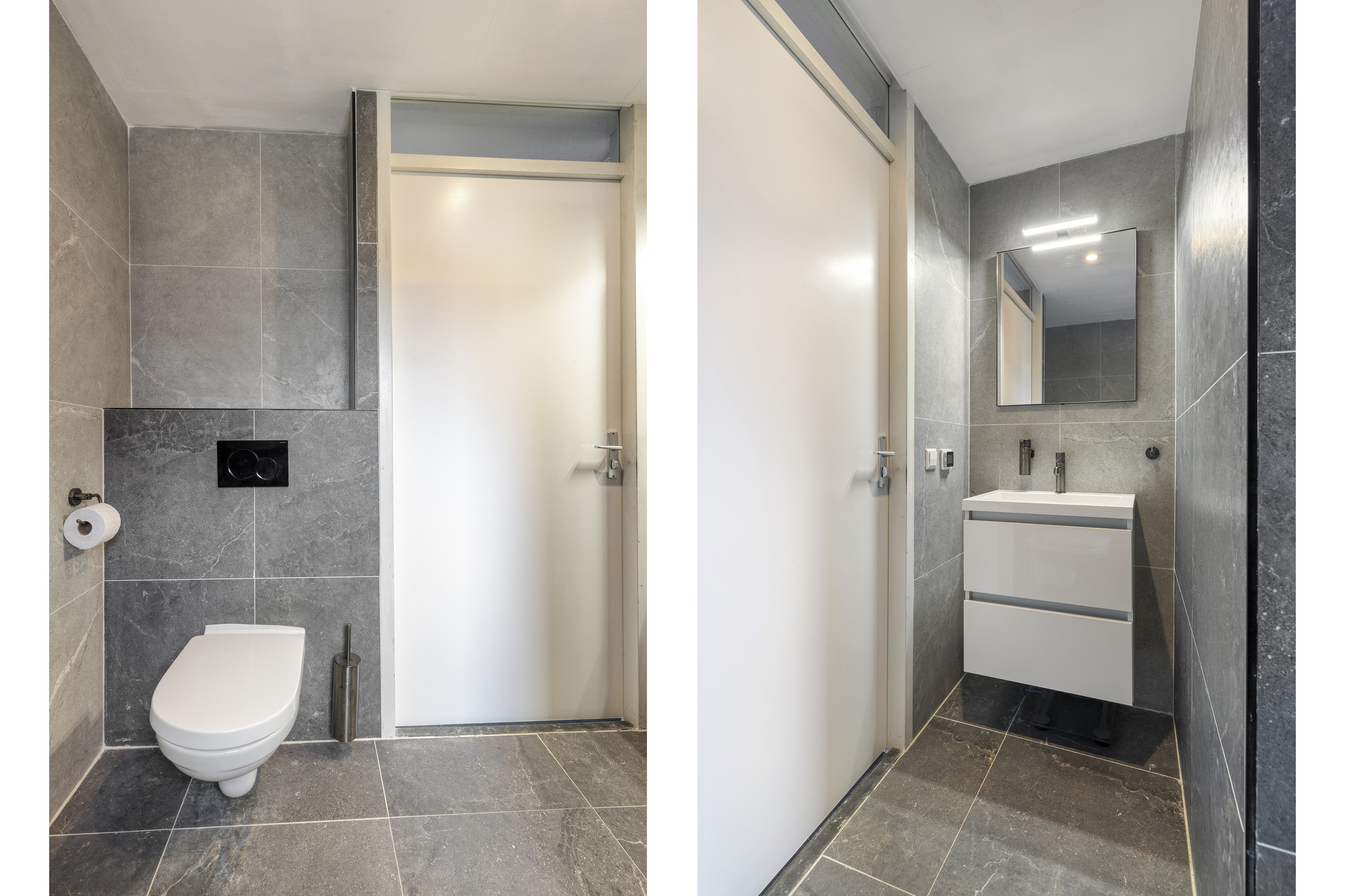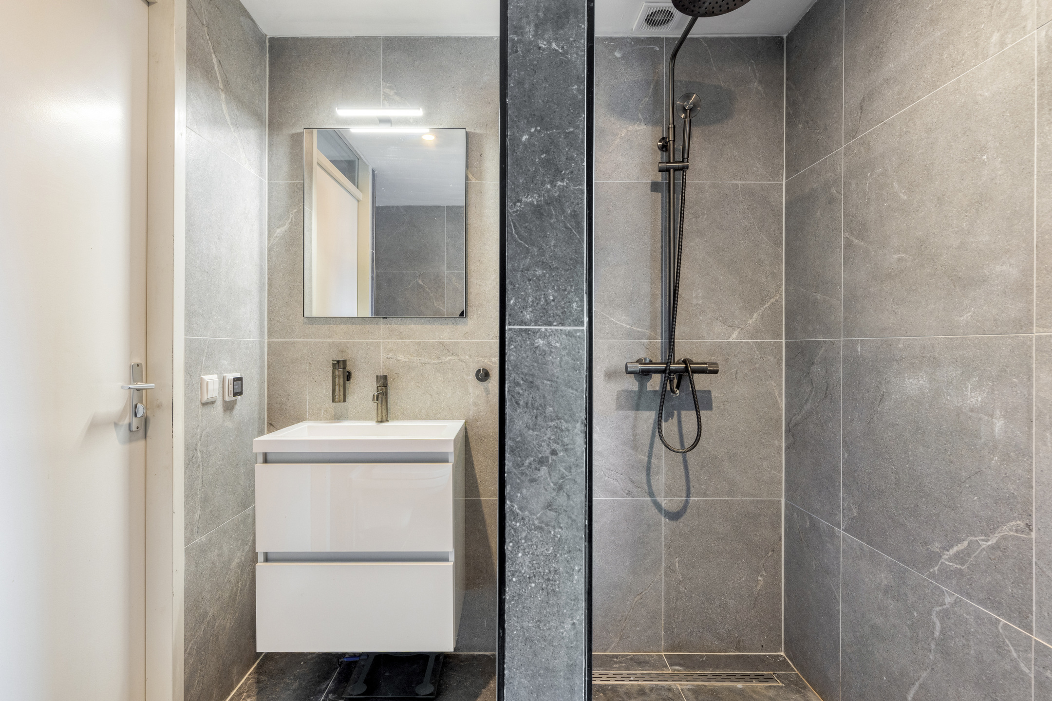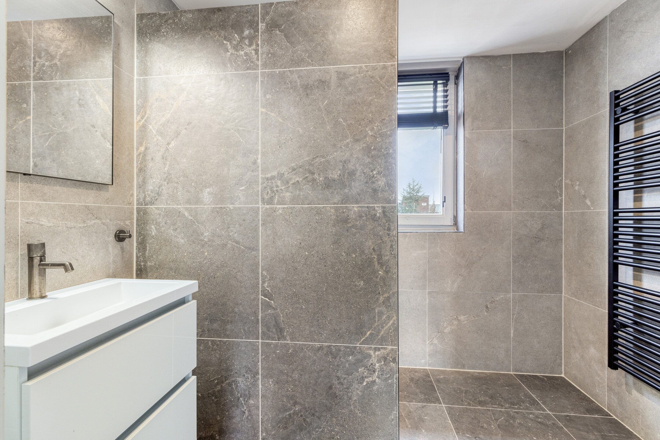 De moderne, volledig betegelde badkamer grenst aan de overloop. Hier beschikt u over een ruime inloopdouche, een wastafel met spiegel en opbergruimte, een handdoekradiator en een zwevend toilet. De afwerking is strak en eigentijds, waardoor u hier geniet van comfort en rust in ƩƩn ruimte.
