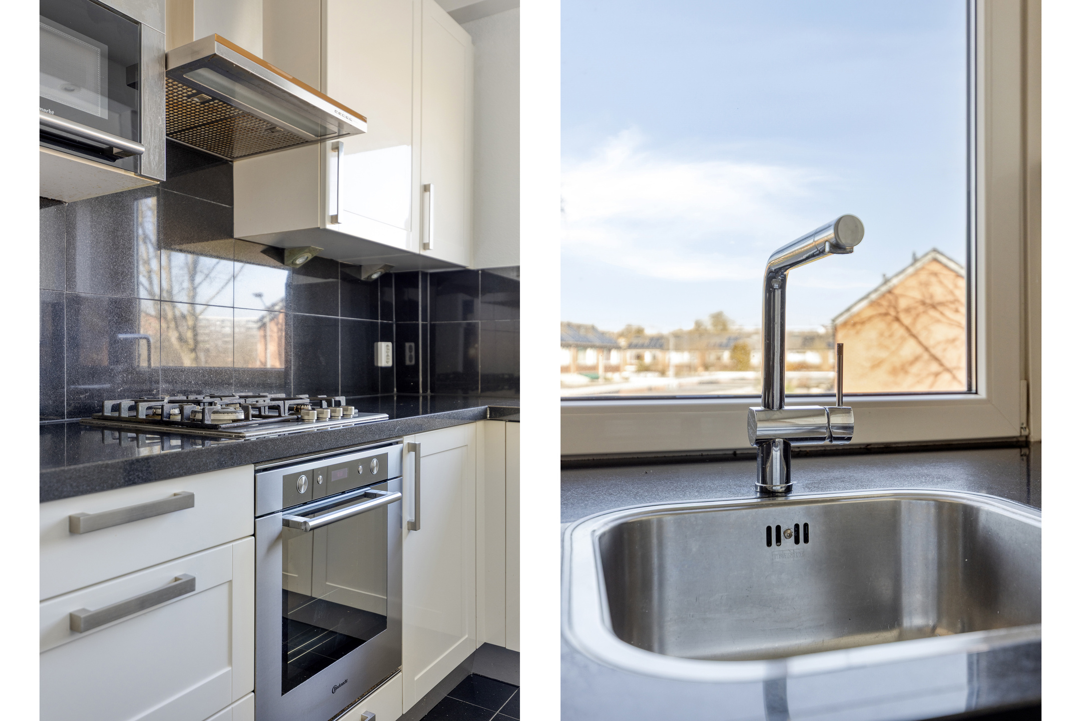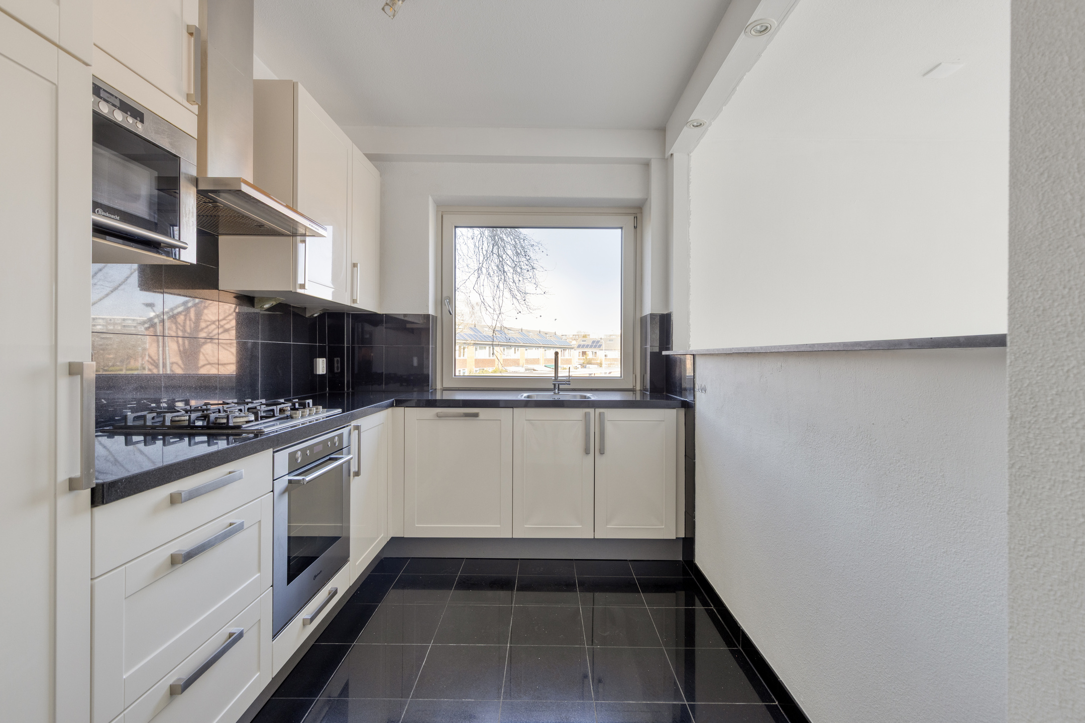 De keuken grenst aan de hal en staat tevens in verbinding met de woonkamer, wat zorgt voor een praktische en open opzet. Het L-vormige aanrechtblad biedt voldoende werkruimte en is voorzien van diverse inbouwapparatuur, waaronder een gasfornuis met afzuigkap, een spoelbak, koelkast, vaatwasser en een ingebouwde ovencombinatie. Daarnaast beschikt de keuken over voldoende opbergruimte. De keuken verkeert in goede staat.