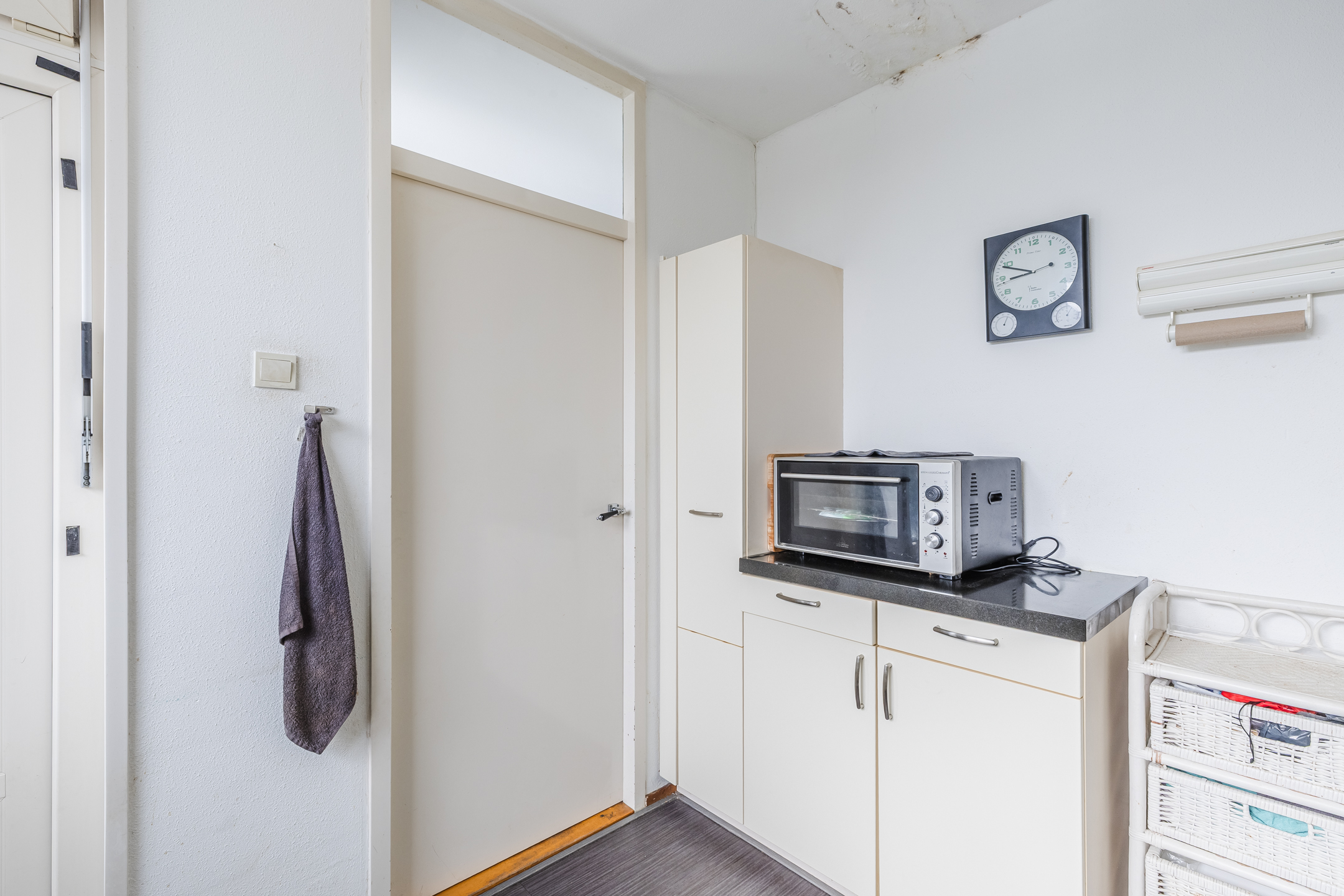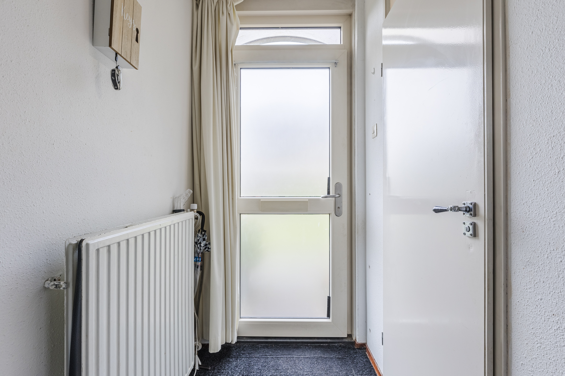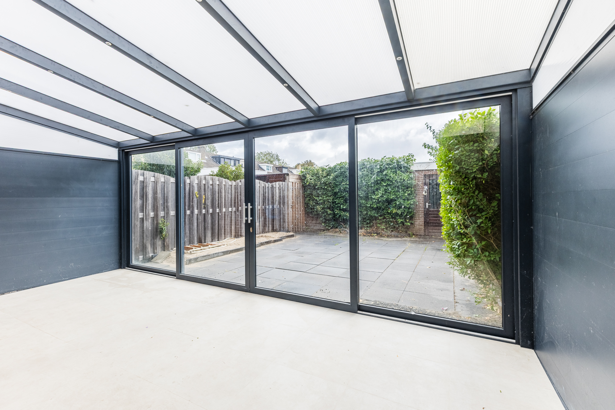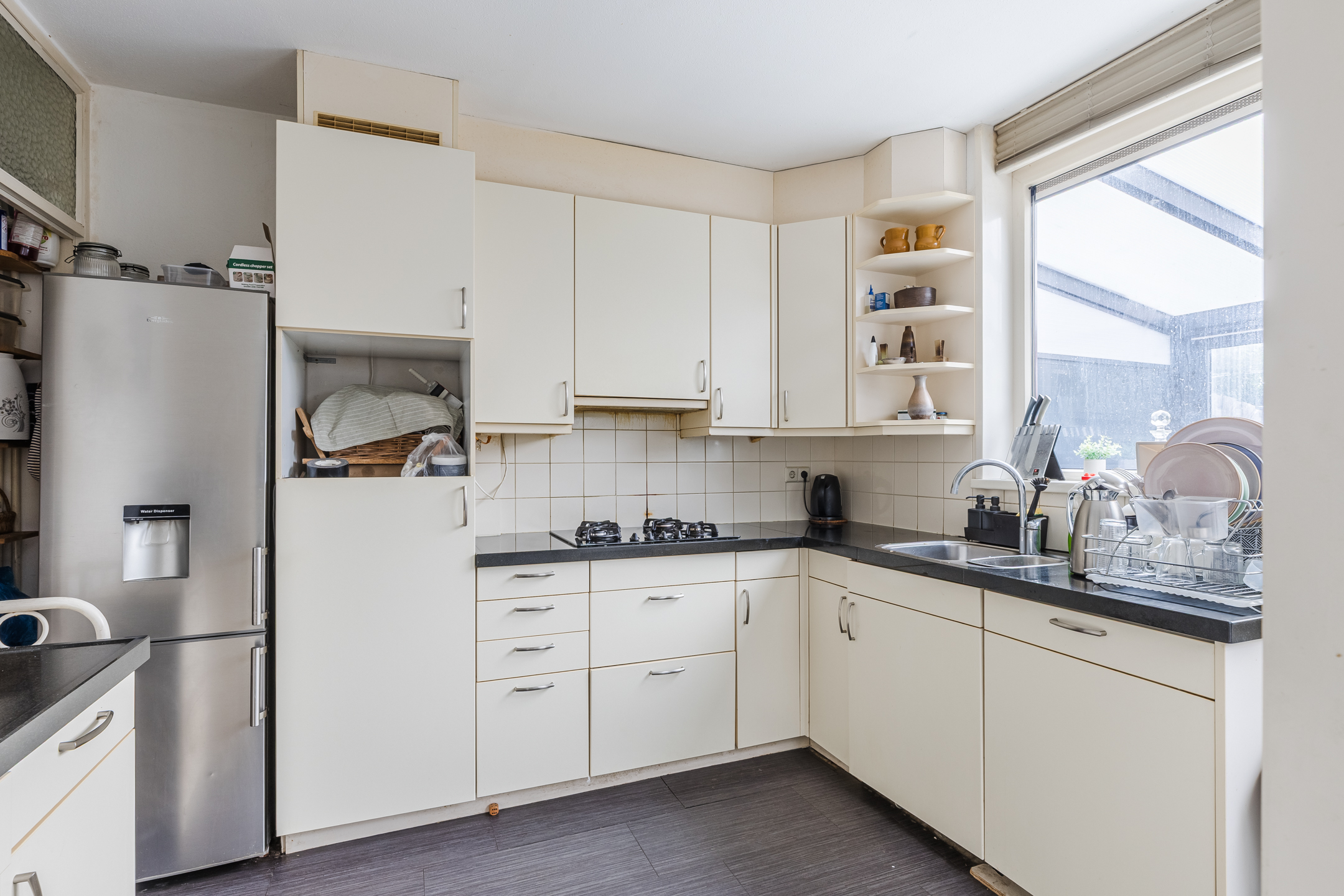 De keuken bevindt zich in een aparte ruimte aan de tuinzijde van het huis en beschikt over een gasfornuis, koelkast, vriezer en een vaatwasser. In de keuken zit ook een handige voorraadkast (onder de trap), alsmede de achterdeur naar de tuin aangebouwde glazen serre met dubbele schuifwanden die helemaal opengezet kunnen worden. Een heerlijke uitbreiding op de leefruimte waar je het hele jaar door van het buitenleven kunt genieten.