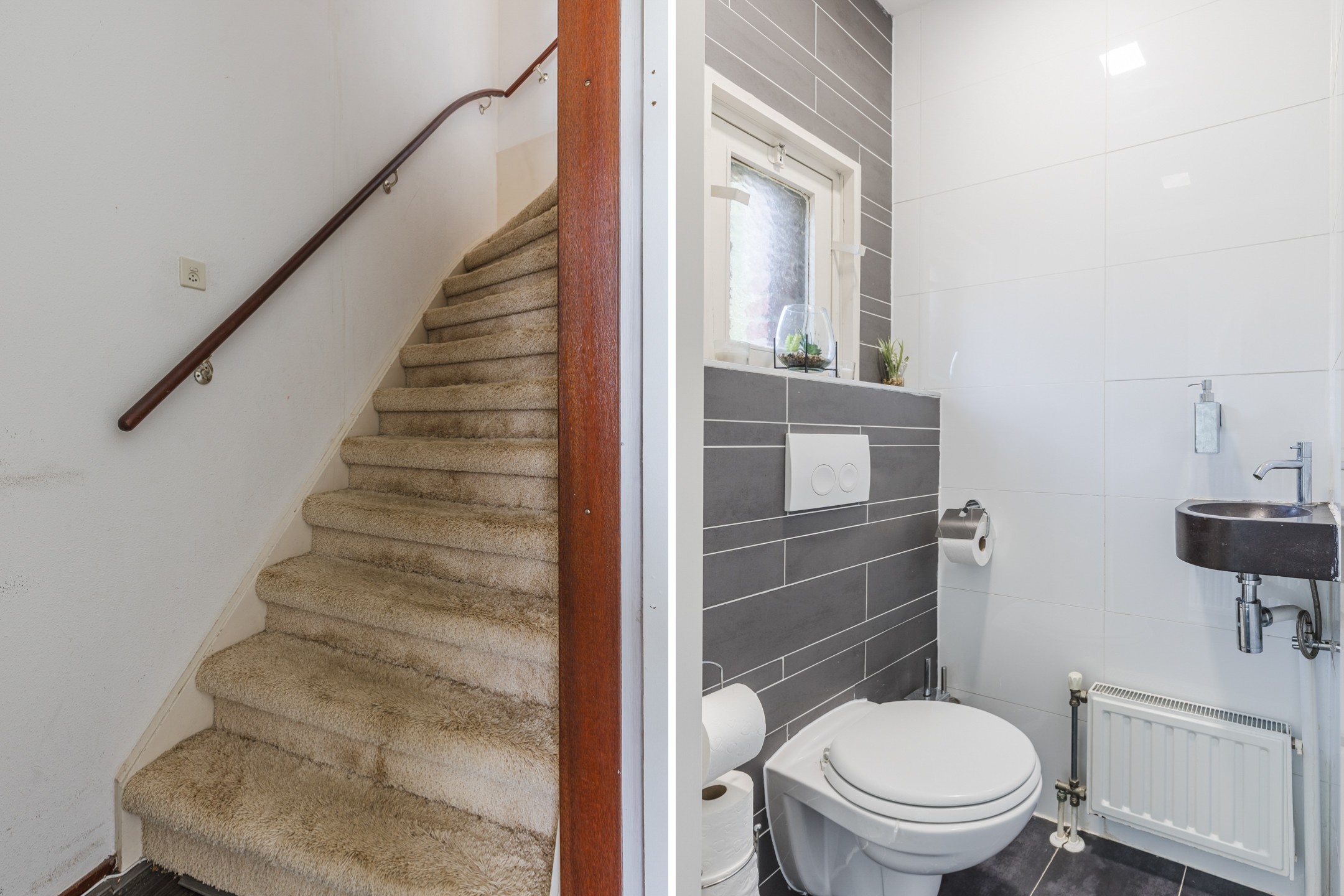 Achter de voordeur vinden we de entreehal met garderobe, meterkast, gastentoilet met fonteintje, trapopgang naar de eerste verdieping en de toegang tot de royale woonkamer.