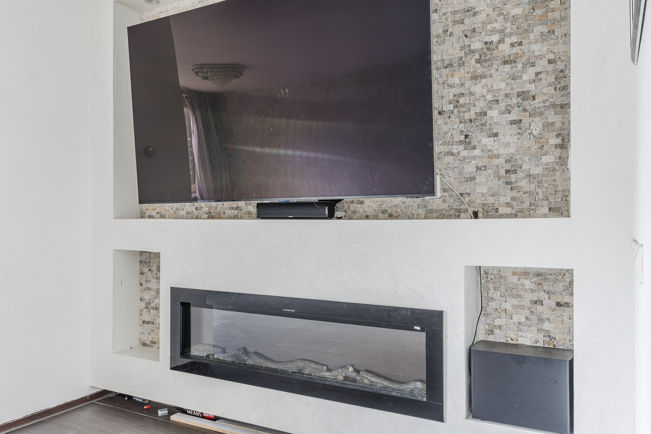 De lichte doorzonwoonkamer strekt zich uit over de gehele lengte van het huis en is netjes afgewerkt met een PVC-laminaatvloer. Centraal in de ruimte is de fraaie mediawall met tv-uitsparing en gashaard.