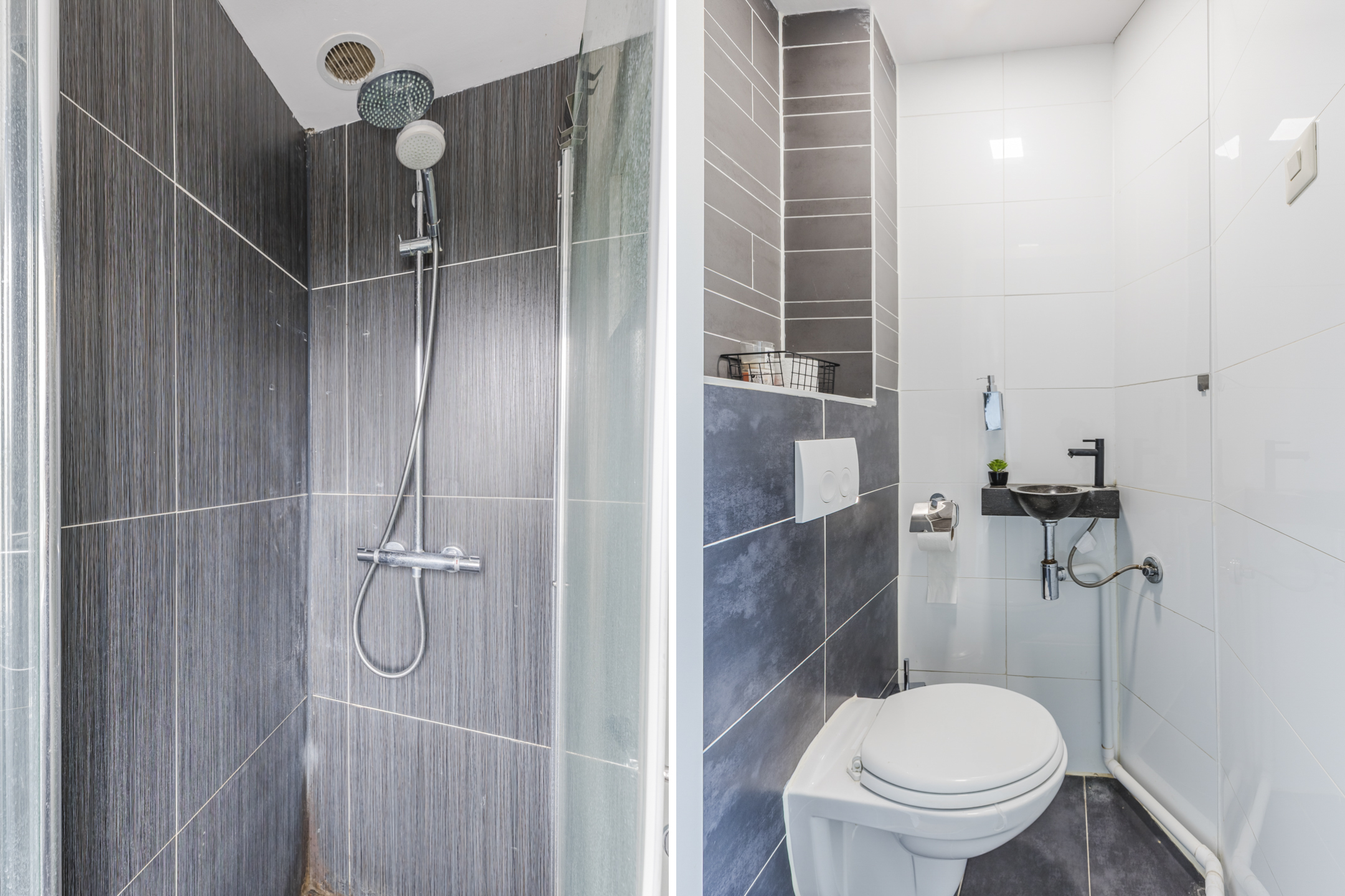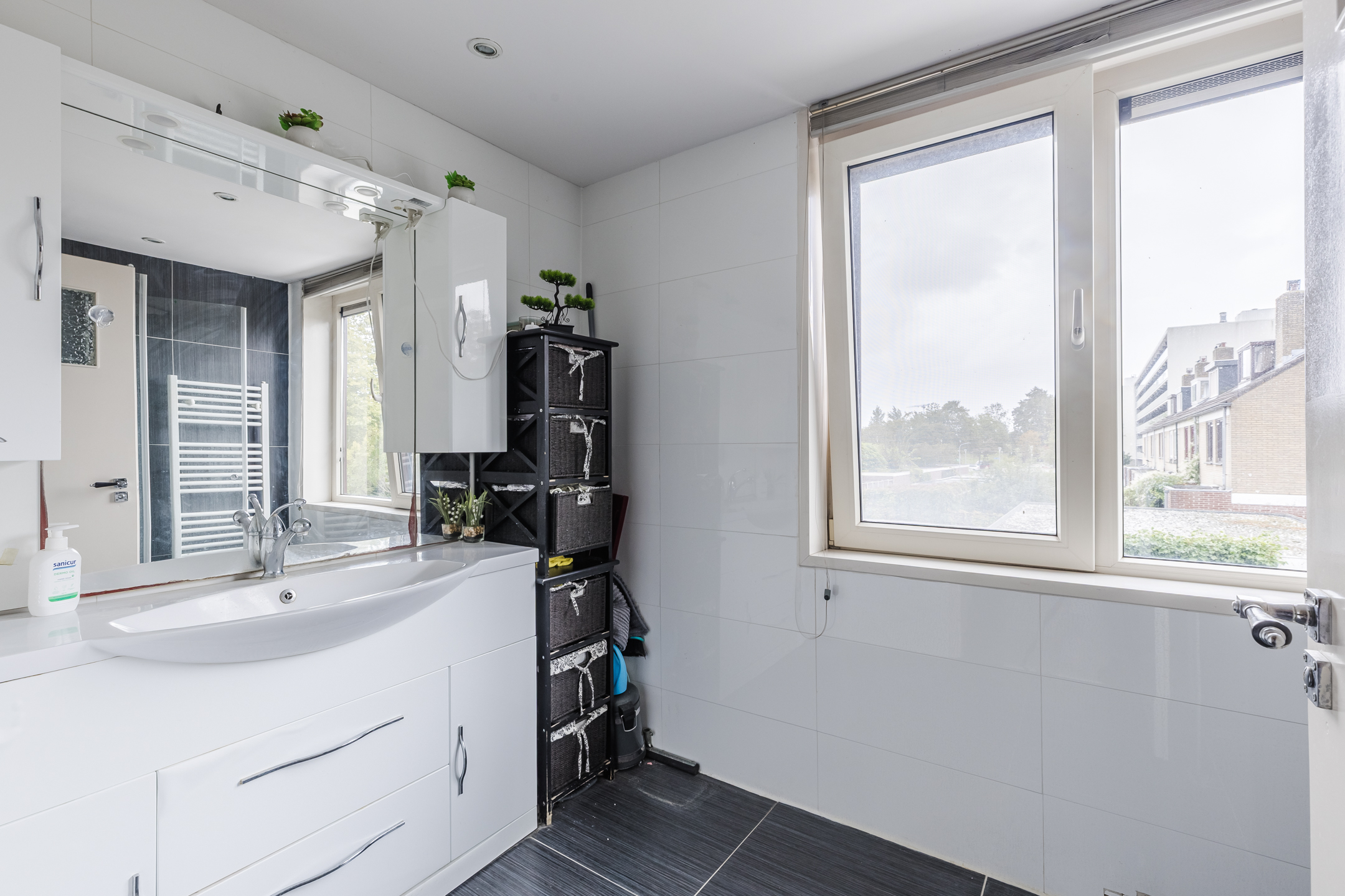 Op deze verdieping vinden we ook de nette en complete badkamer welke is voorzien van inbouwspots, een wastafel met meubel en een inloopregendouche. Een separaat toilet met fonteintje bevindt zich naast de badkamer.