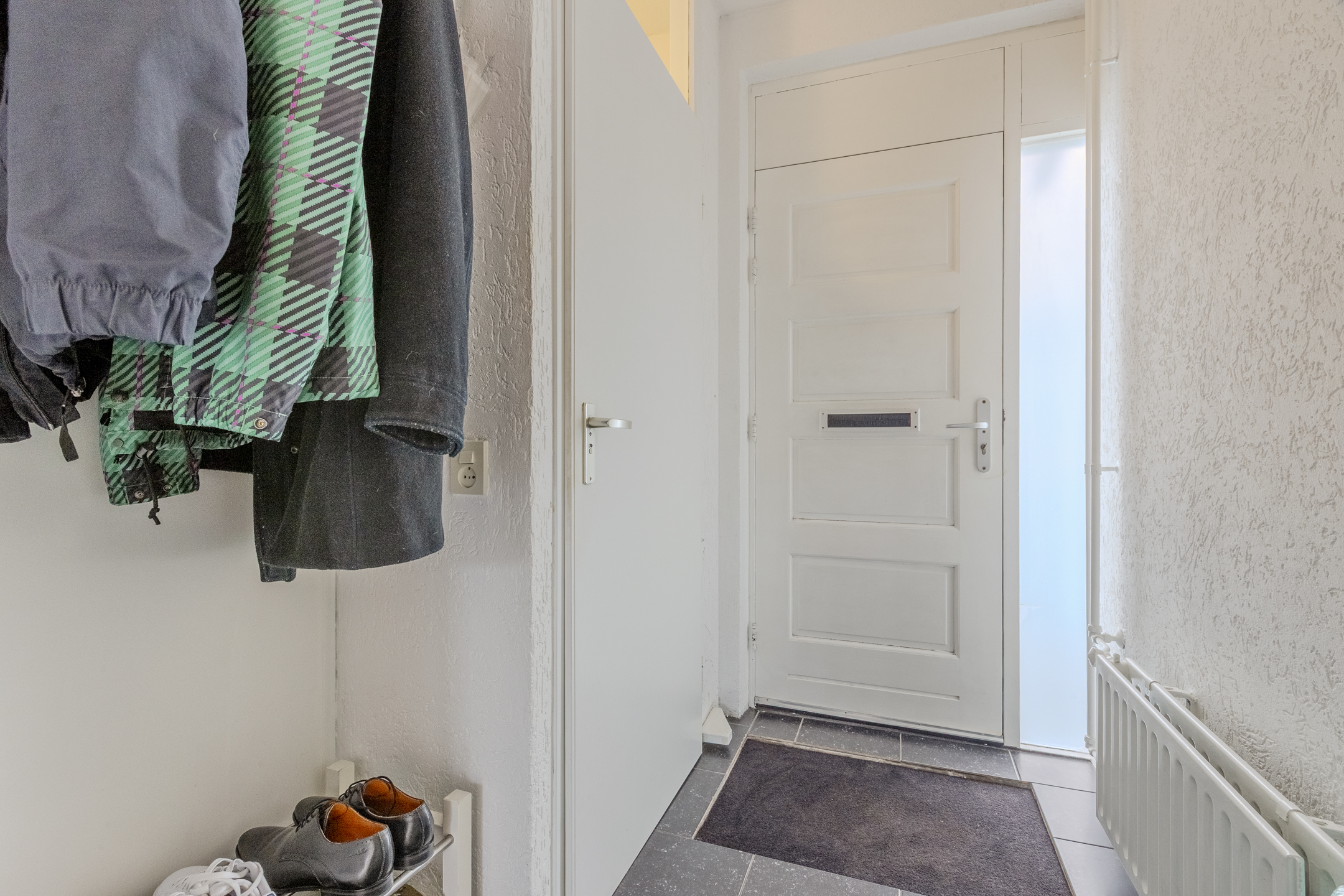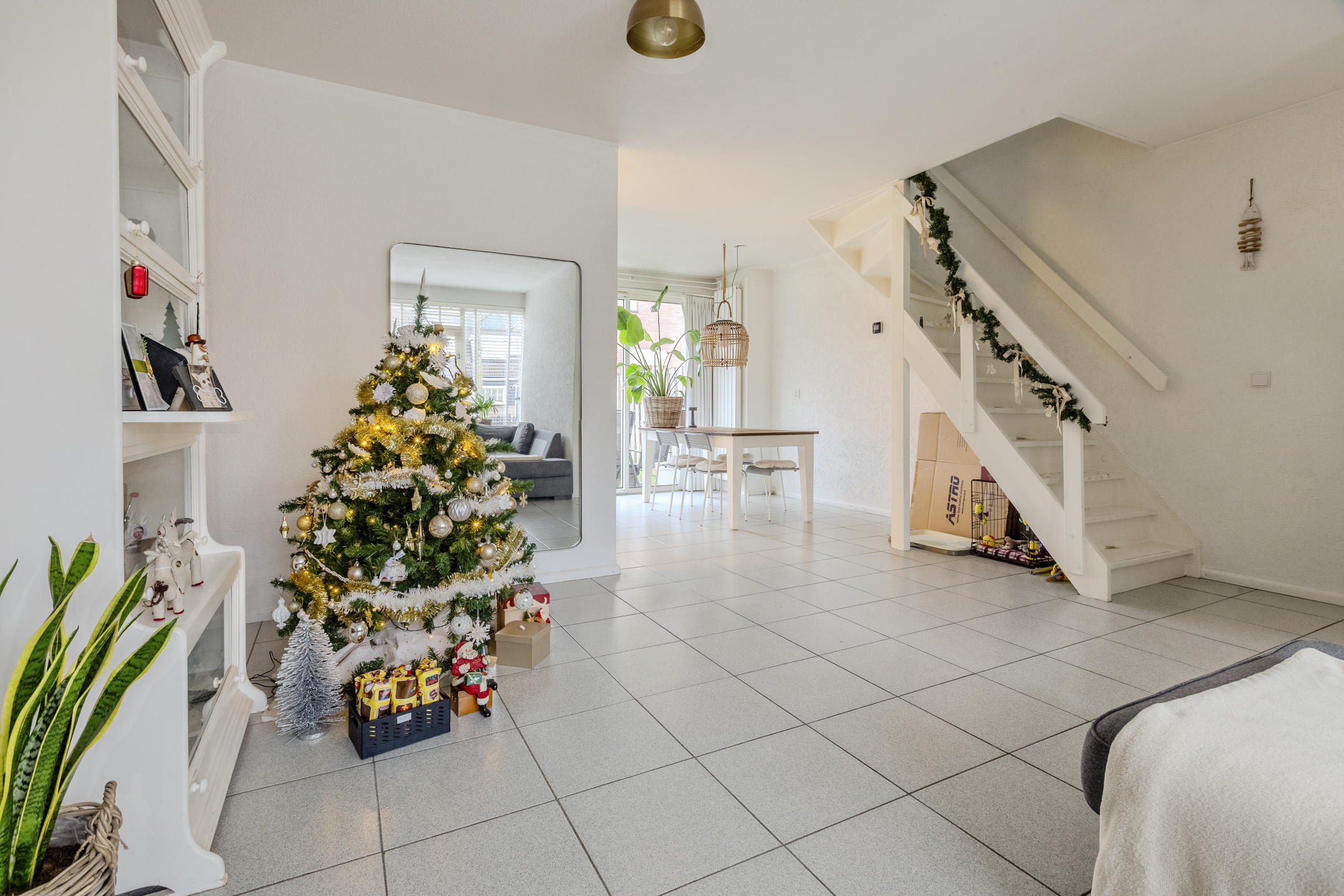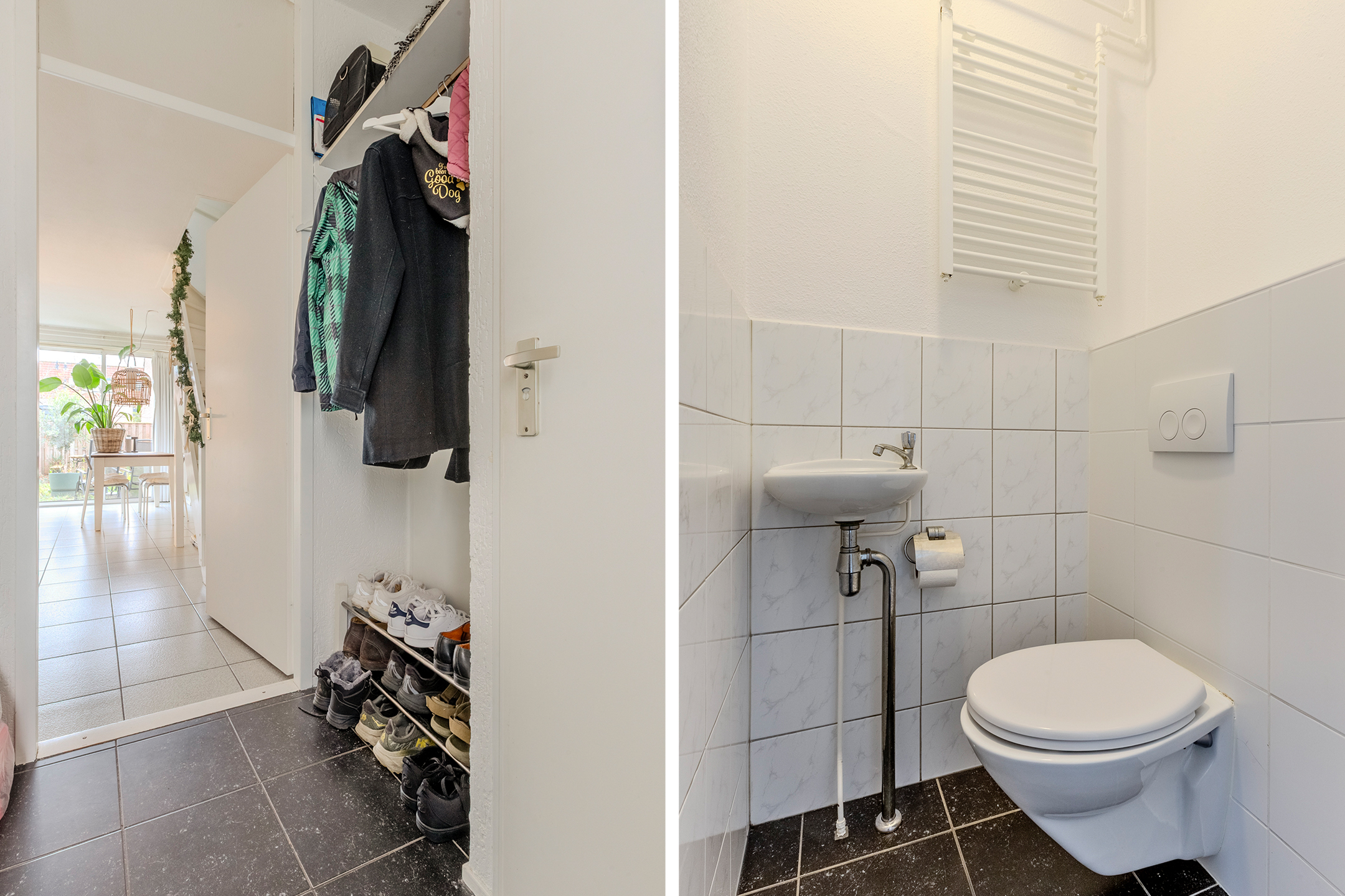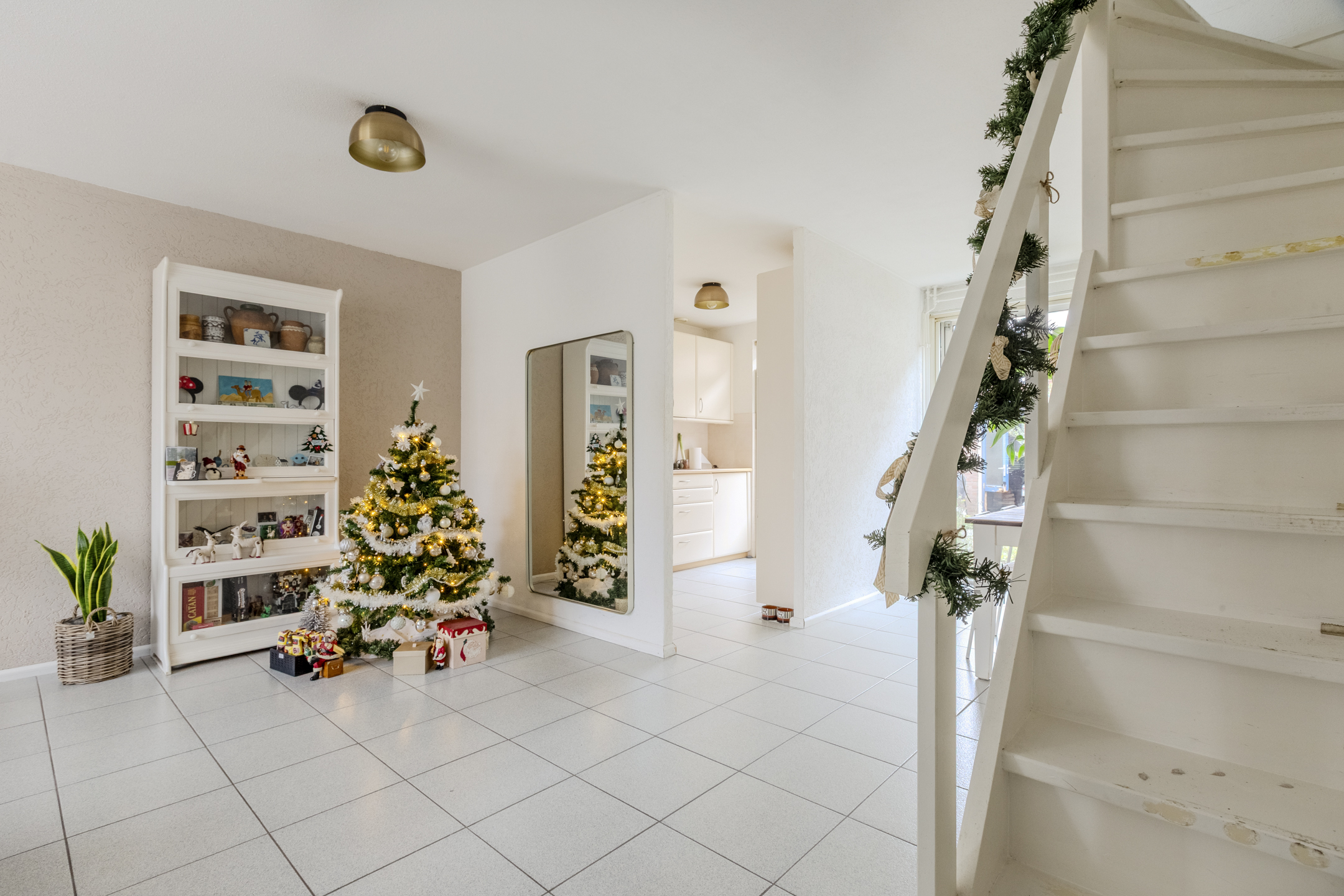 Via de ruime voortuin met groene haag en een betegeld terras, bereiken we de voordeur van de woning. Achter de voordeur vinden we de entree met garderobe, meterkast, gastentoilet met fonteintje en de toegang tot de sfeervolle woonkamer met open keuken.