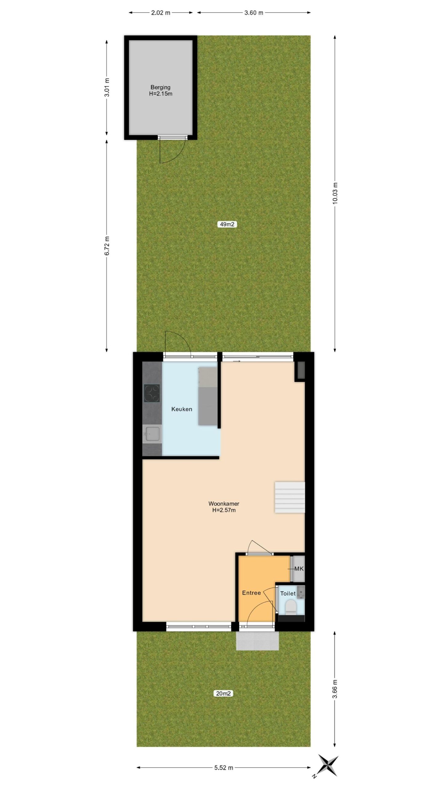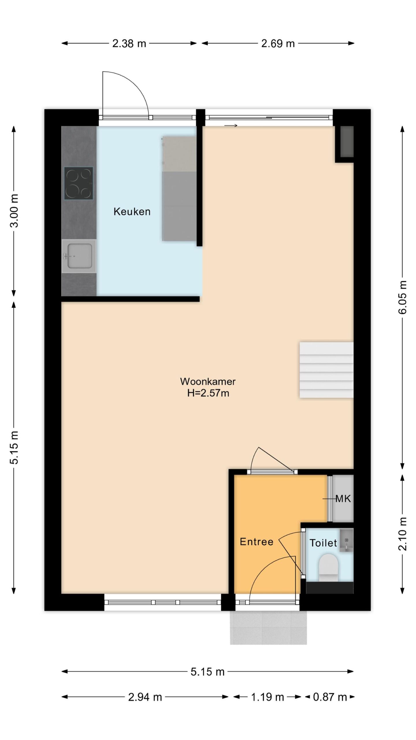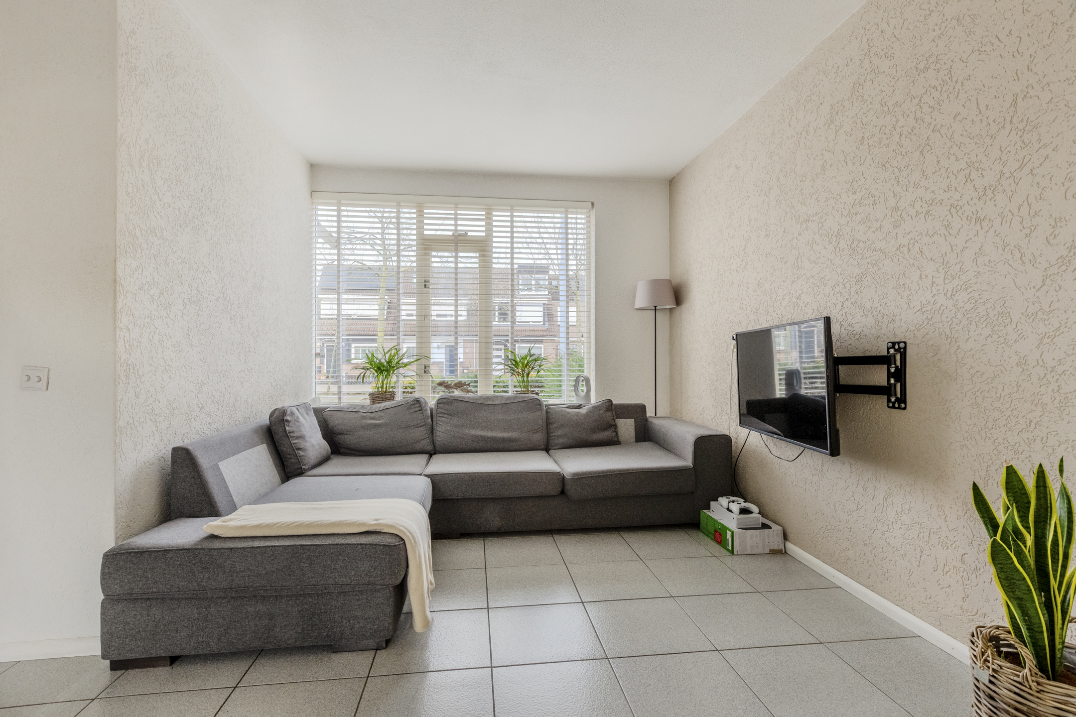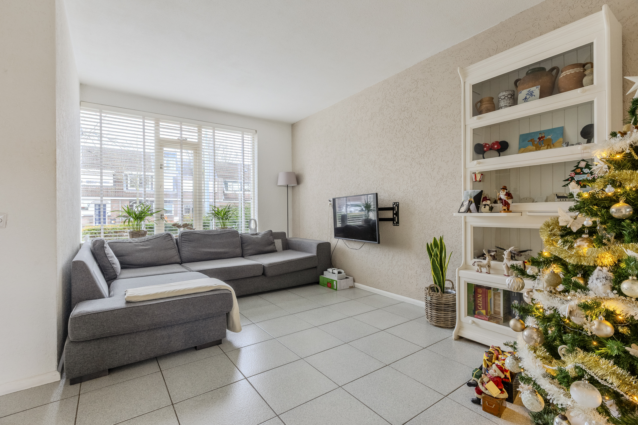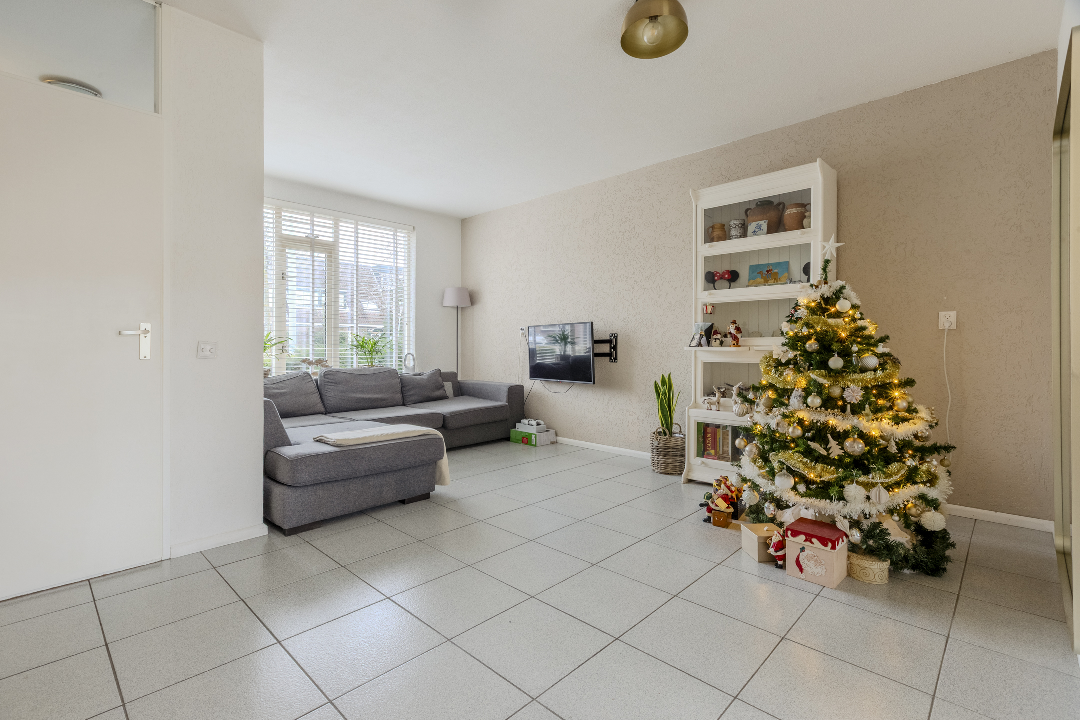 Via de ruime voortuin met groene haag en een betegeld terras, bereiken we de voordeur van de woning. Achter de voordeur vinden we de entree met garderobe, meterkast, gastentoilet met fonteintje en de toegang tot de sfeervolle woonkamer met open keuken.