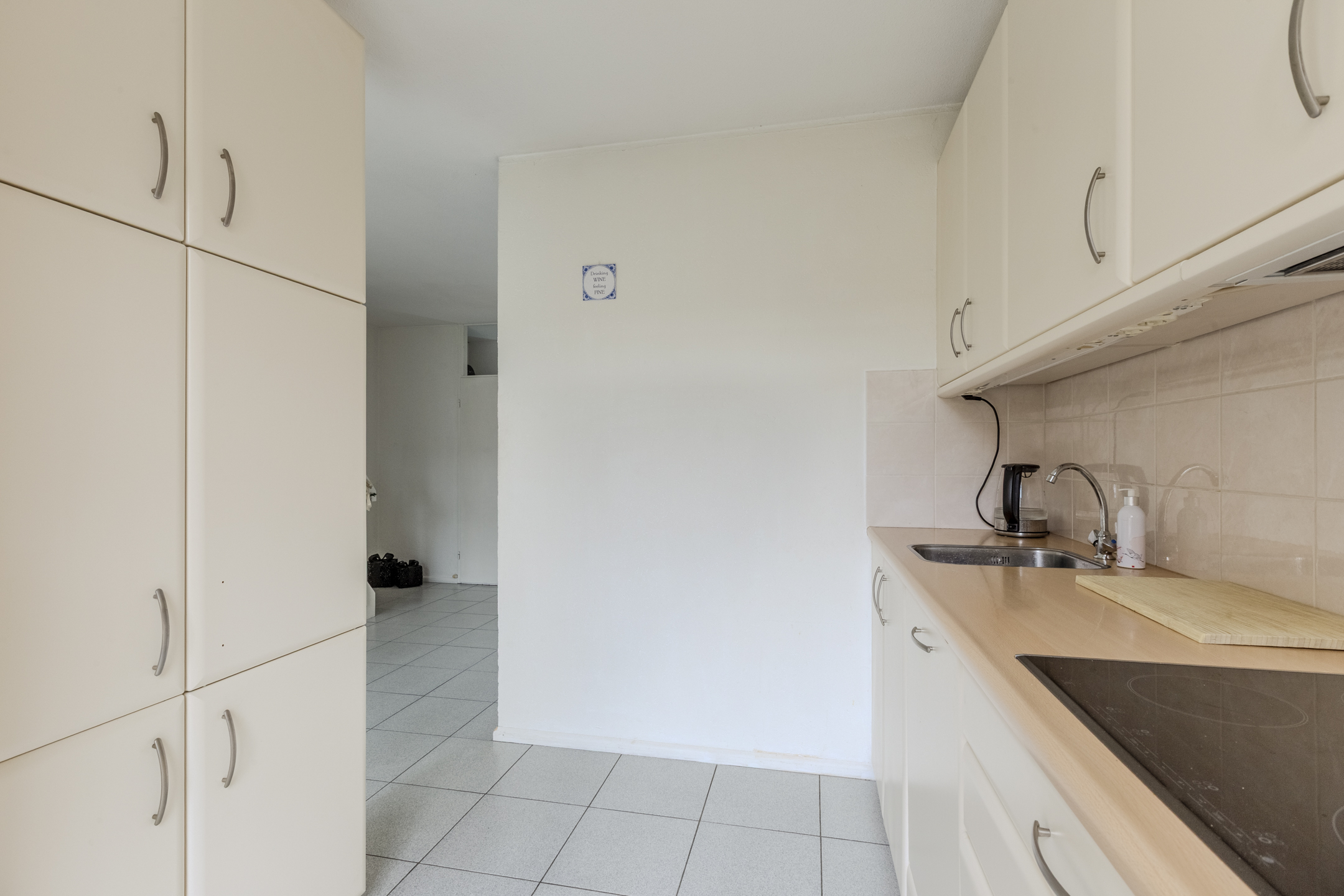De halfopen keuken bevindt zich aan de tuinzijde van de woning en is voorzien van een inductiekookplaat, koelkast, vriezer en een vaatwasser.