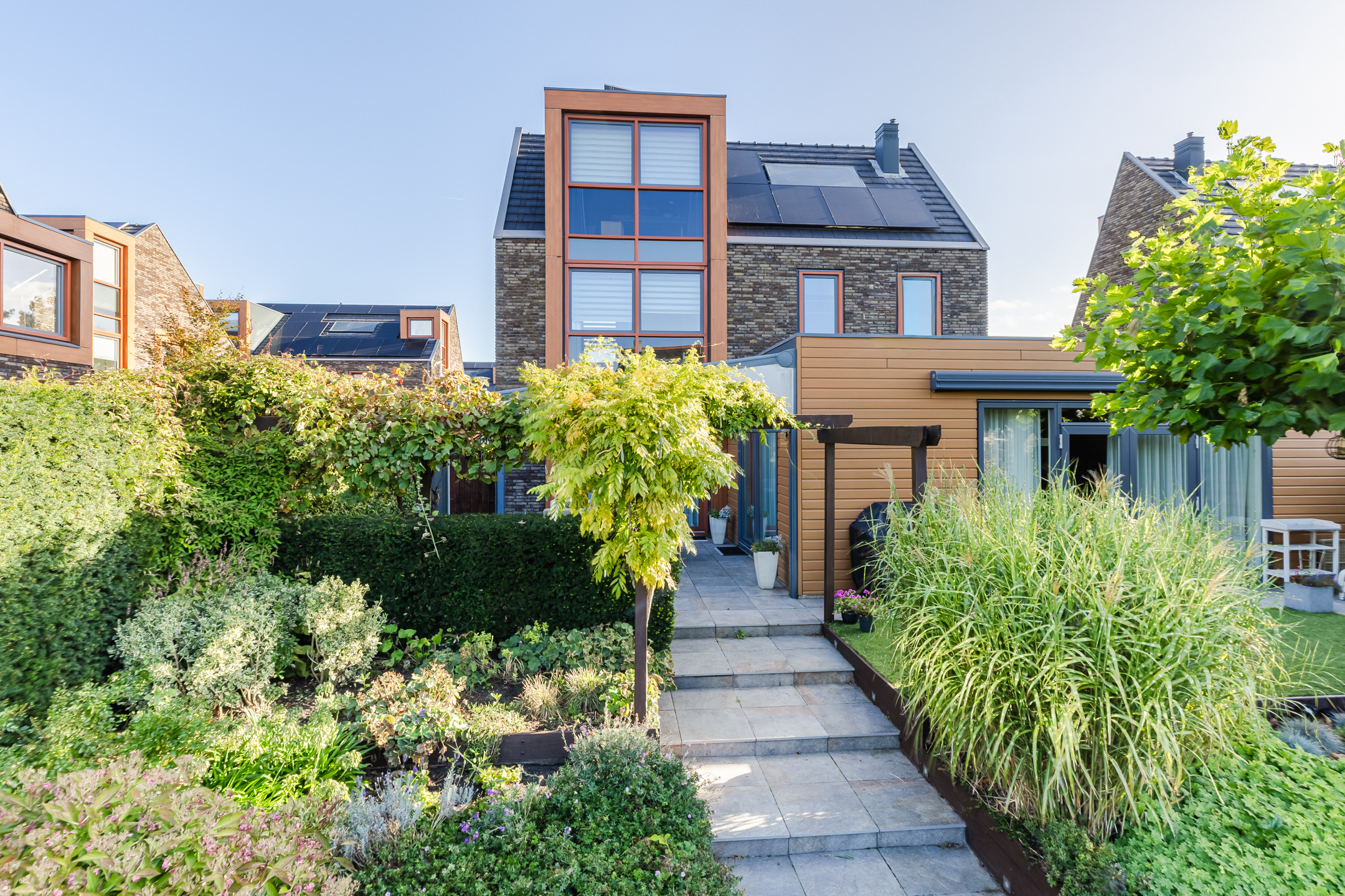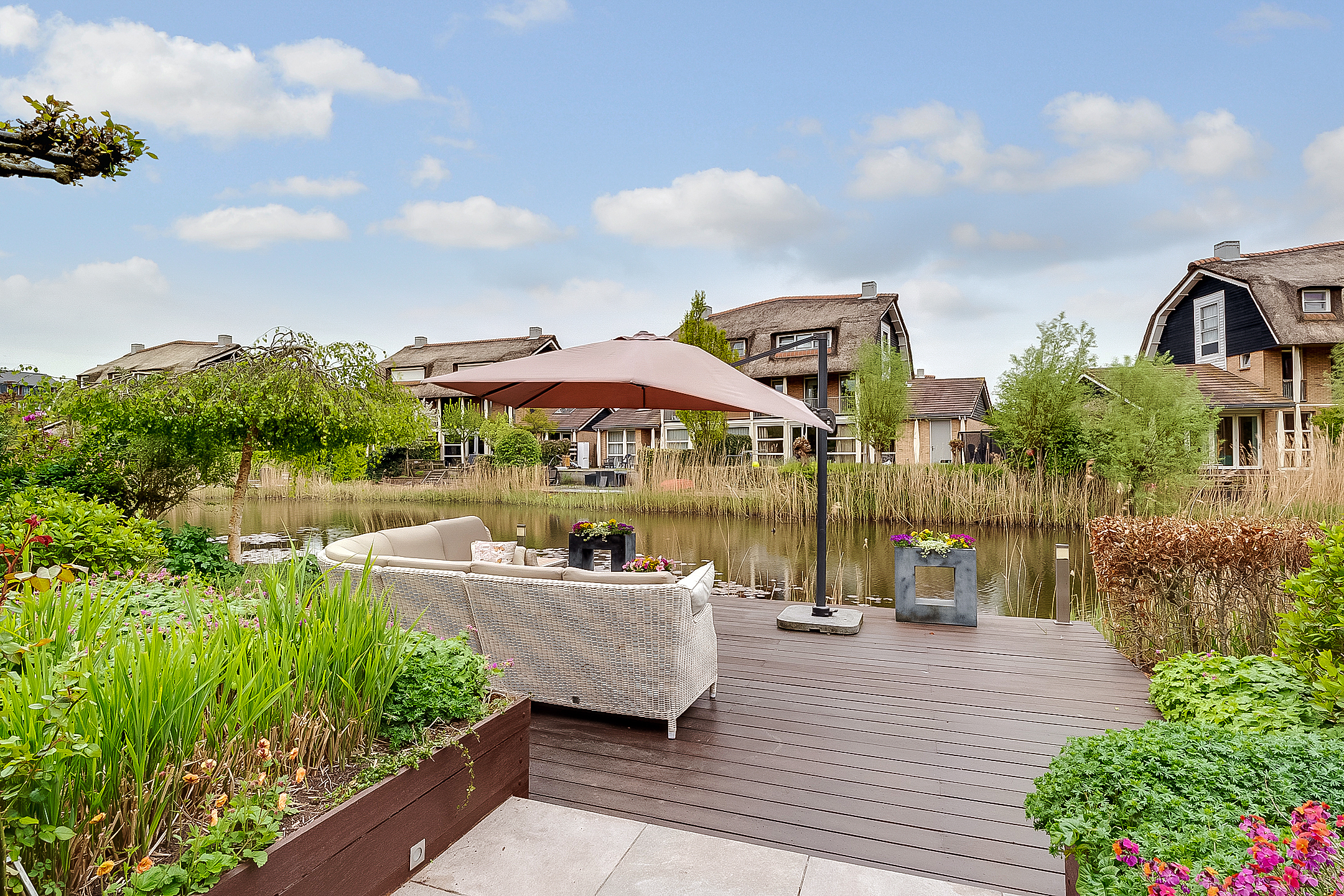 De fraai aangelegde achtertuin op het zuidwesten is een oase van rust, met meerdere zonneterrassen, sfeervolle verlichting en een royaal vlonderterras aan het water. Of u nu in de zon wilt ontspannen of juist verkoeling zoekt in de schaduw onder de luxe Renson Lagune terrasoverkapping.