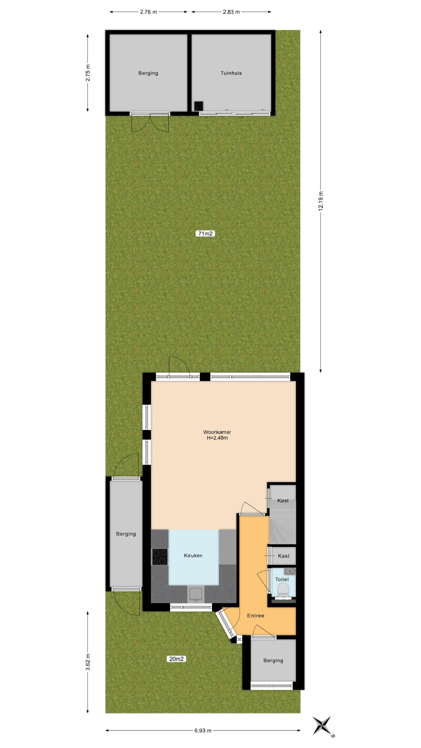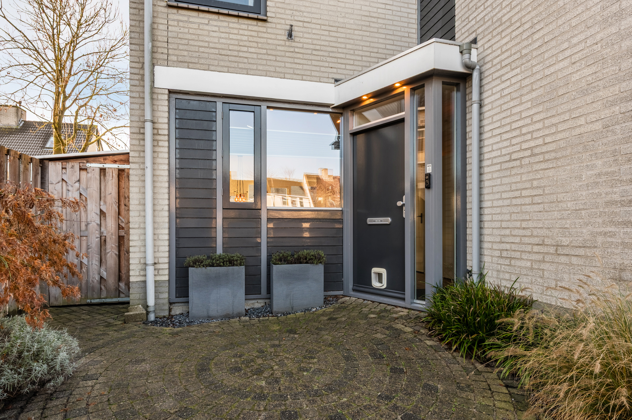 Via de betegelde voortuin bereiken we de voordeur van de woning met links daarvan toegang tot een aan de woning geschakelde houten berging. Een tweede berging is inpandig vanuit de entreehal bereikbaar.