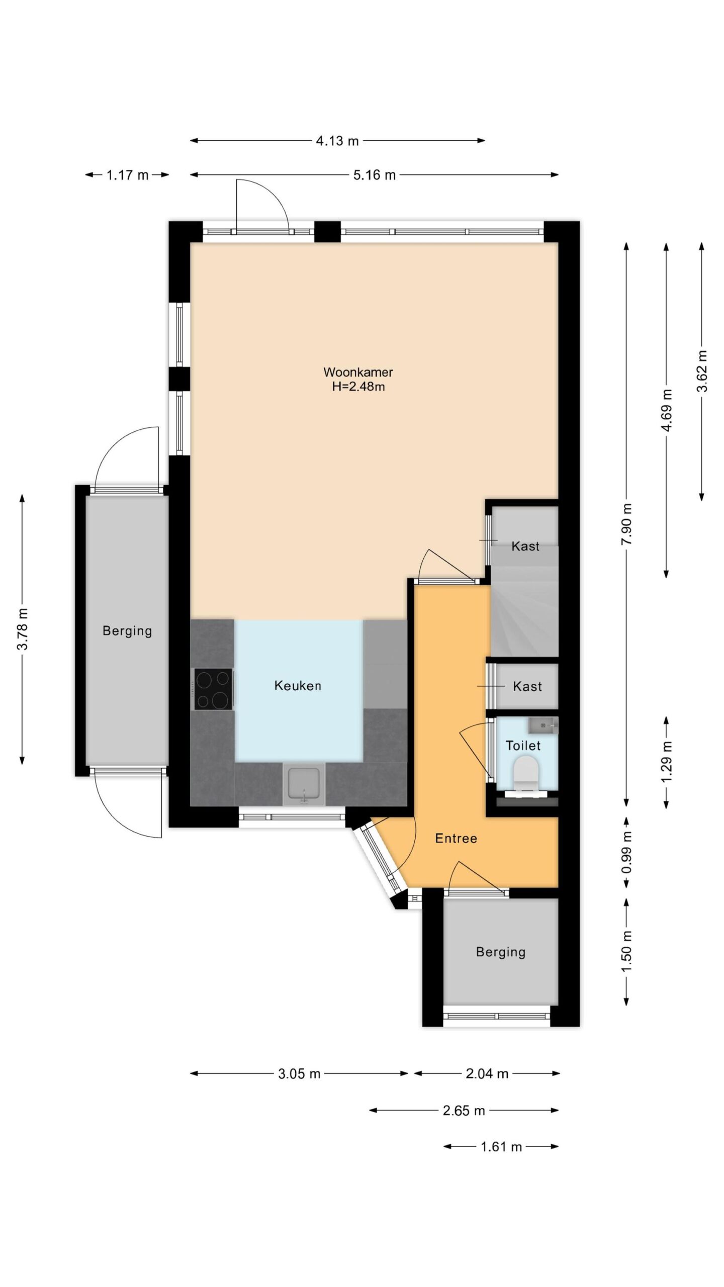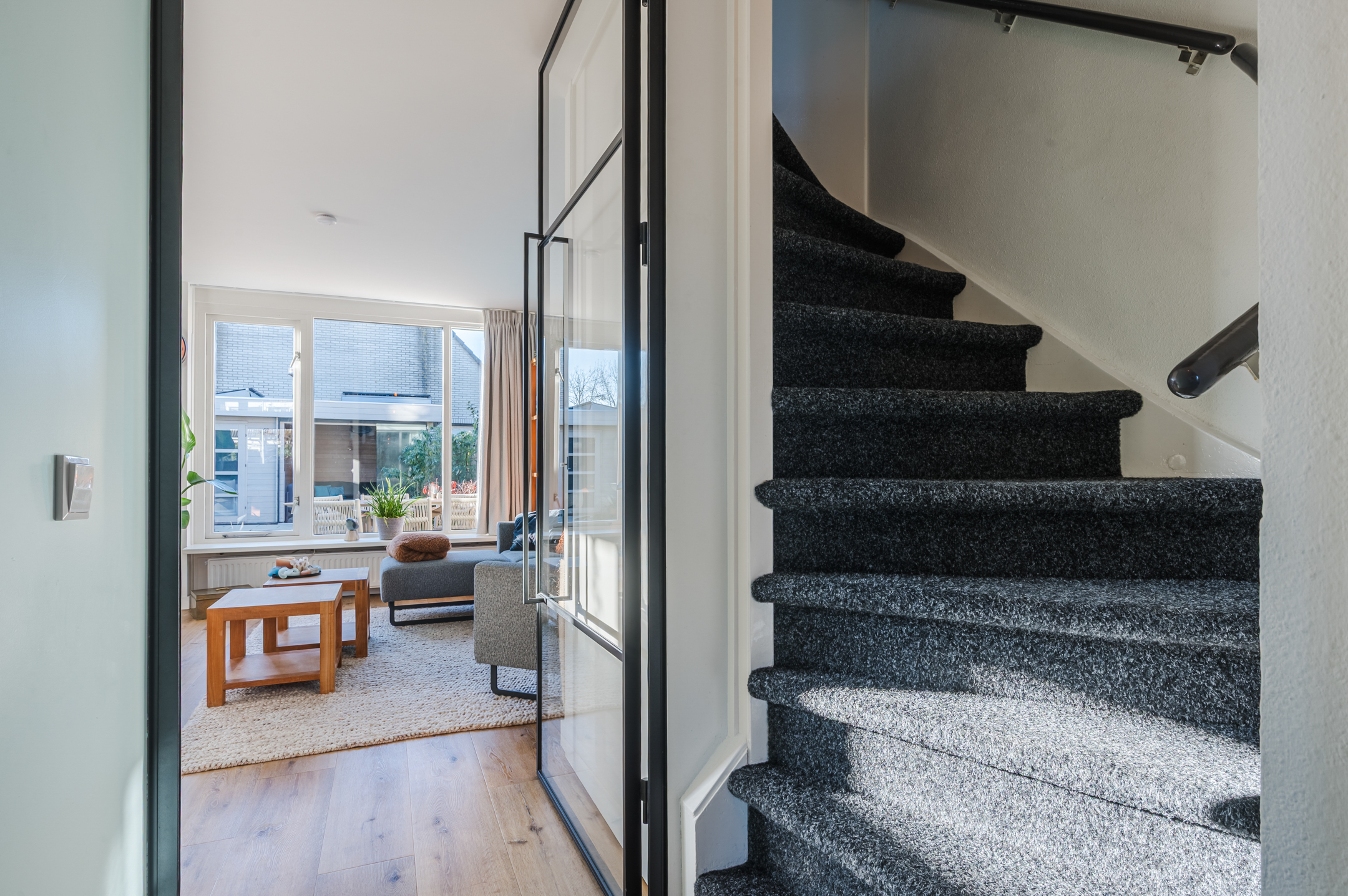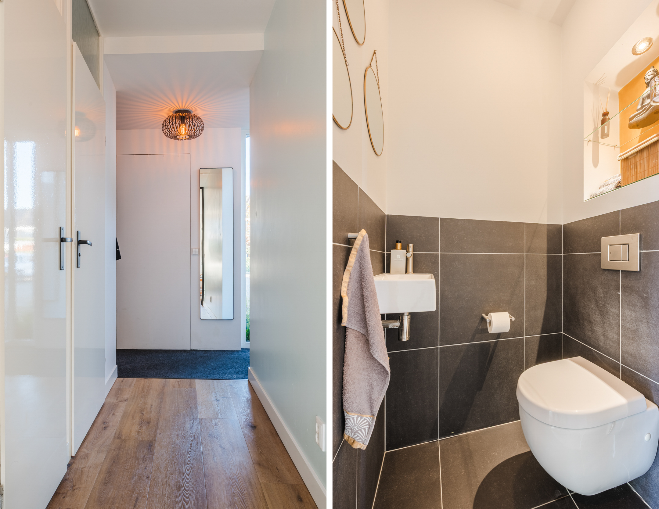 Achter de voordeur vinden we de entreehal met de garderobe, meterkast, toilet met fonteintje, trapopgang naar de eerste verdieping en de toegang tot de woonkamer met open keuken.