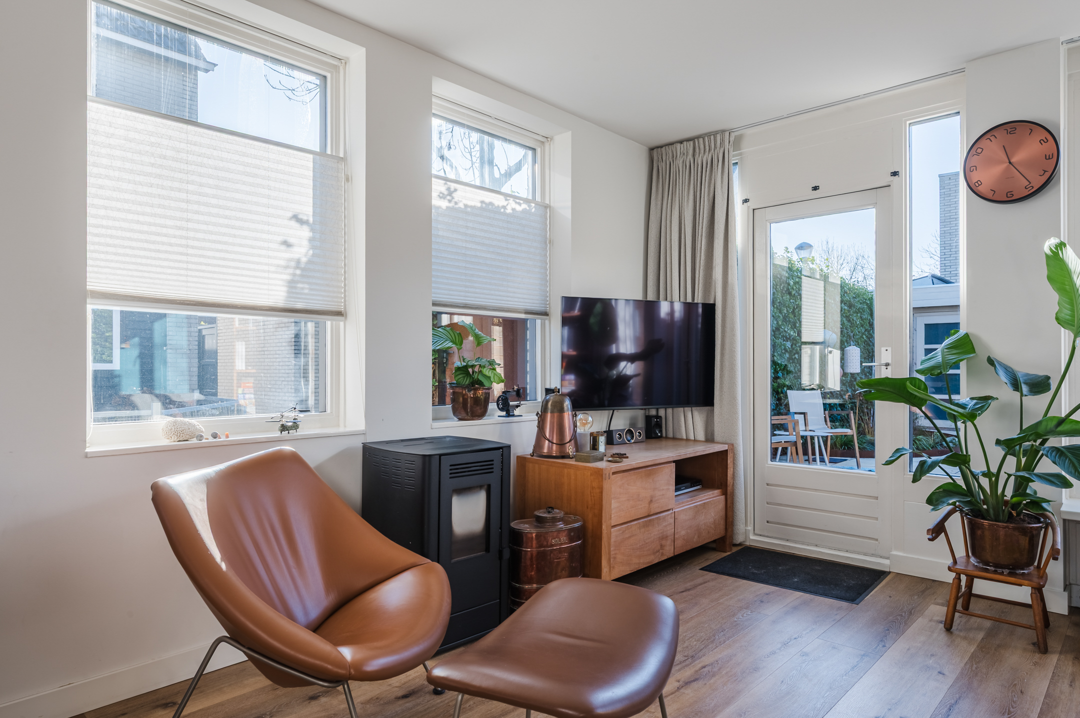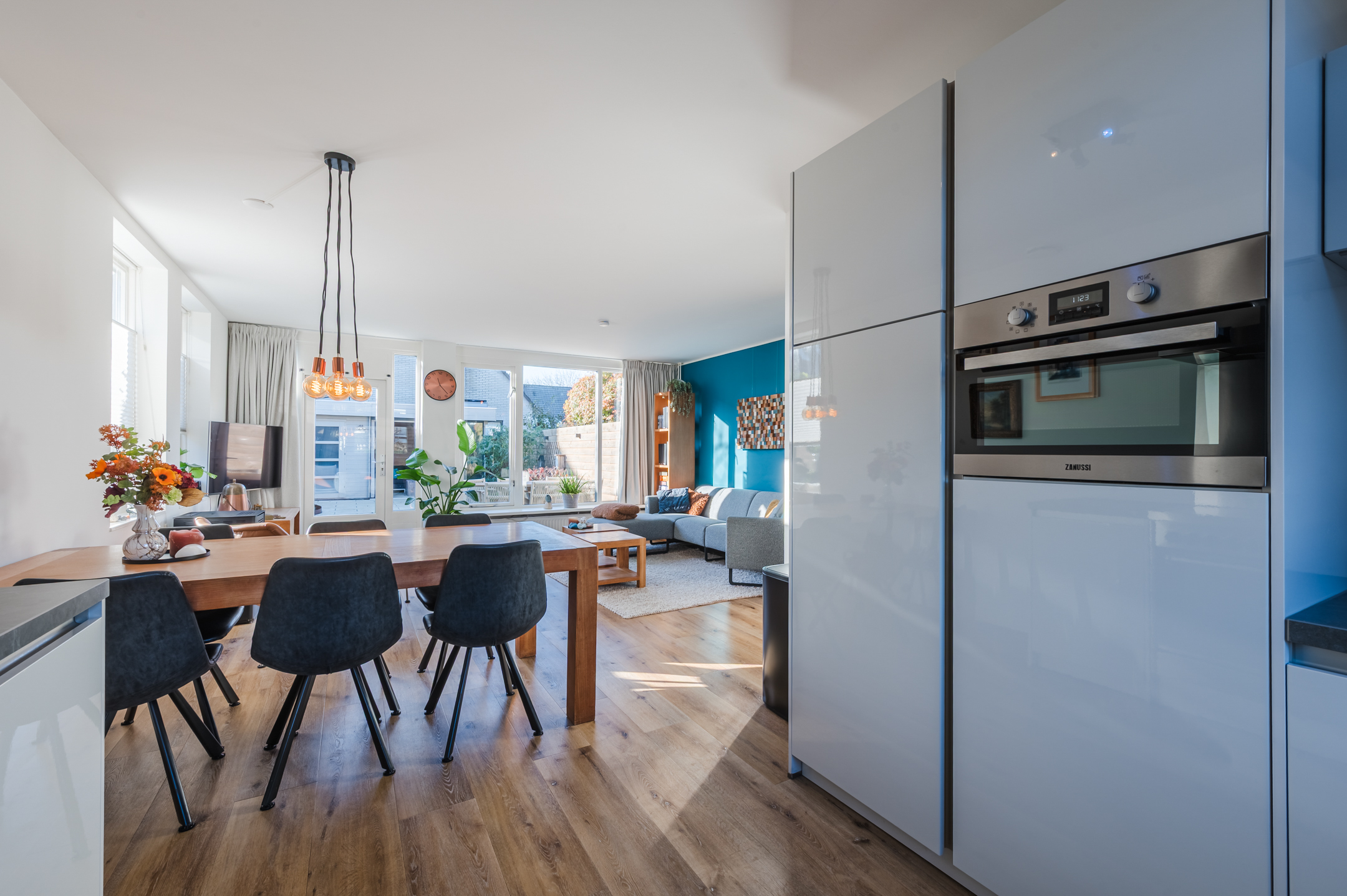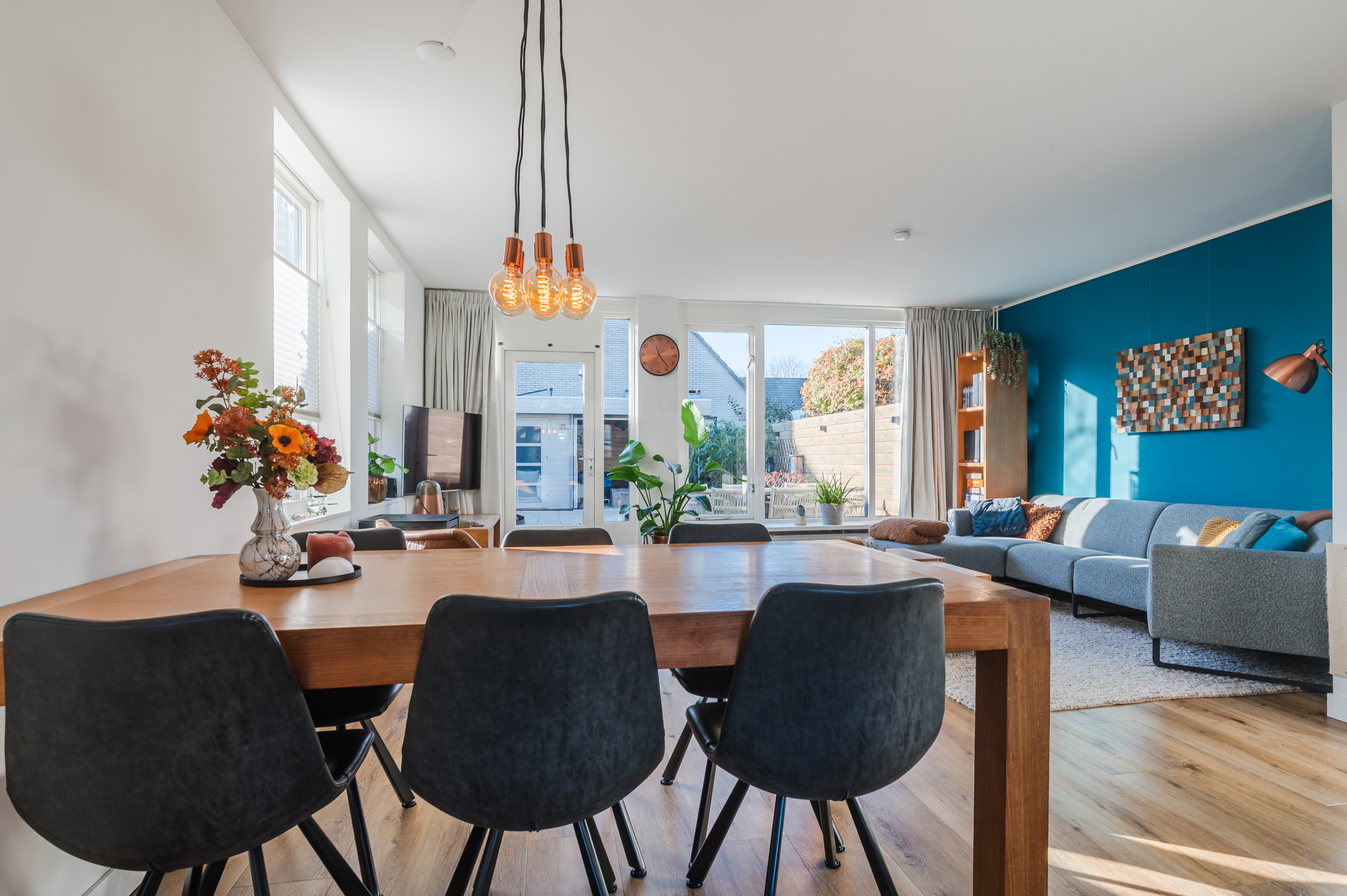 De royale woonkamer is tuingericht en ontzettend breed. De grote raampartijen langs 3 zijden zorgen voor een grote hoeveelheid lichtinval en het geheel is fraai afgewerkt met een PVC-laminaatvloer. Middels een achterdeur is er toegang tot de tuin.