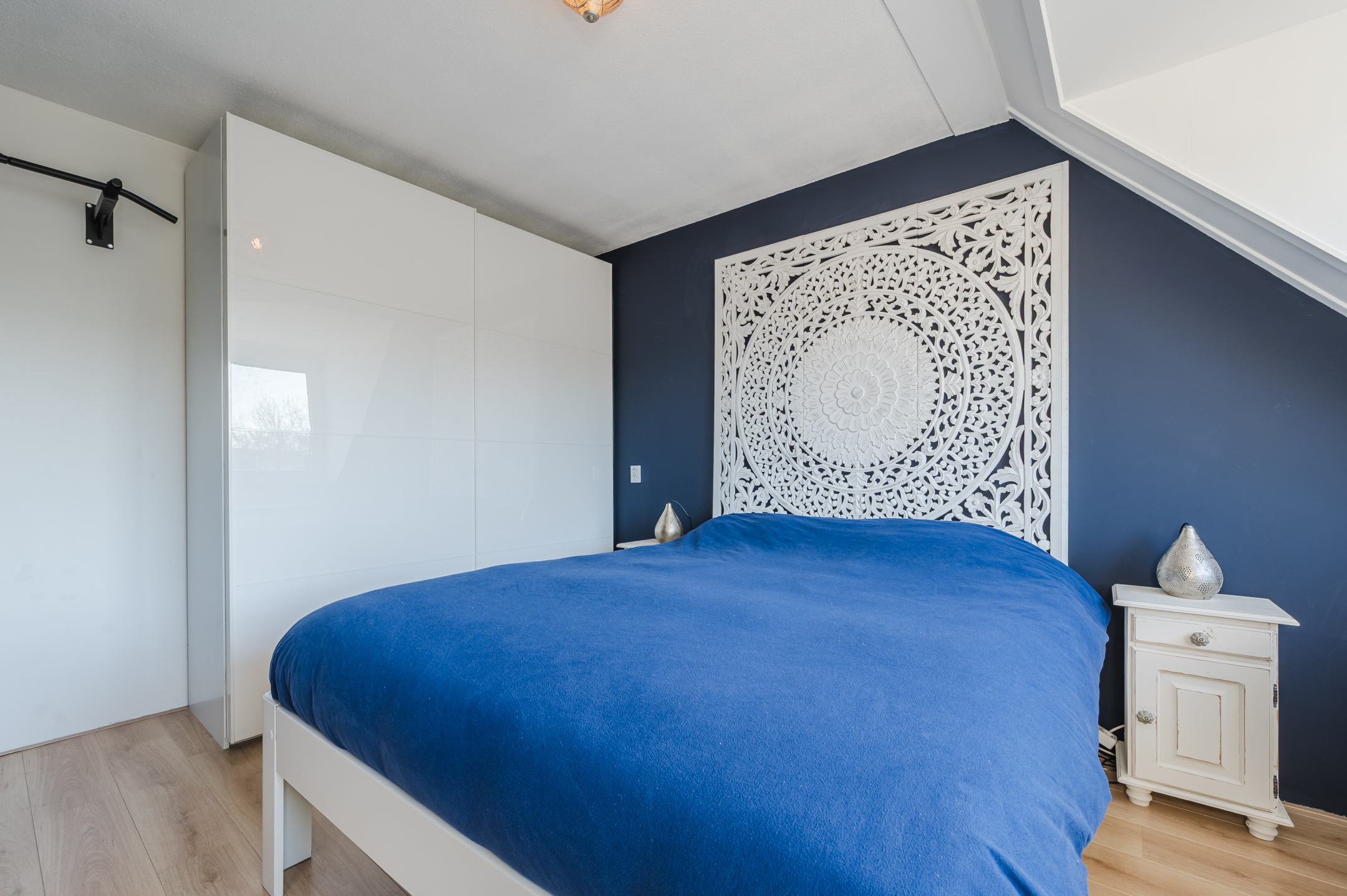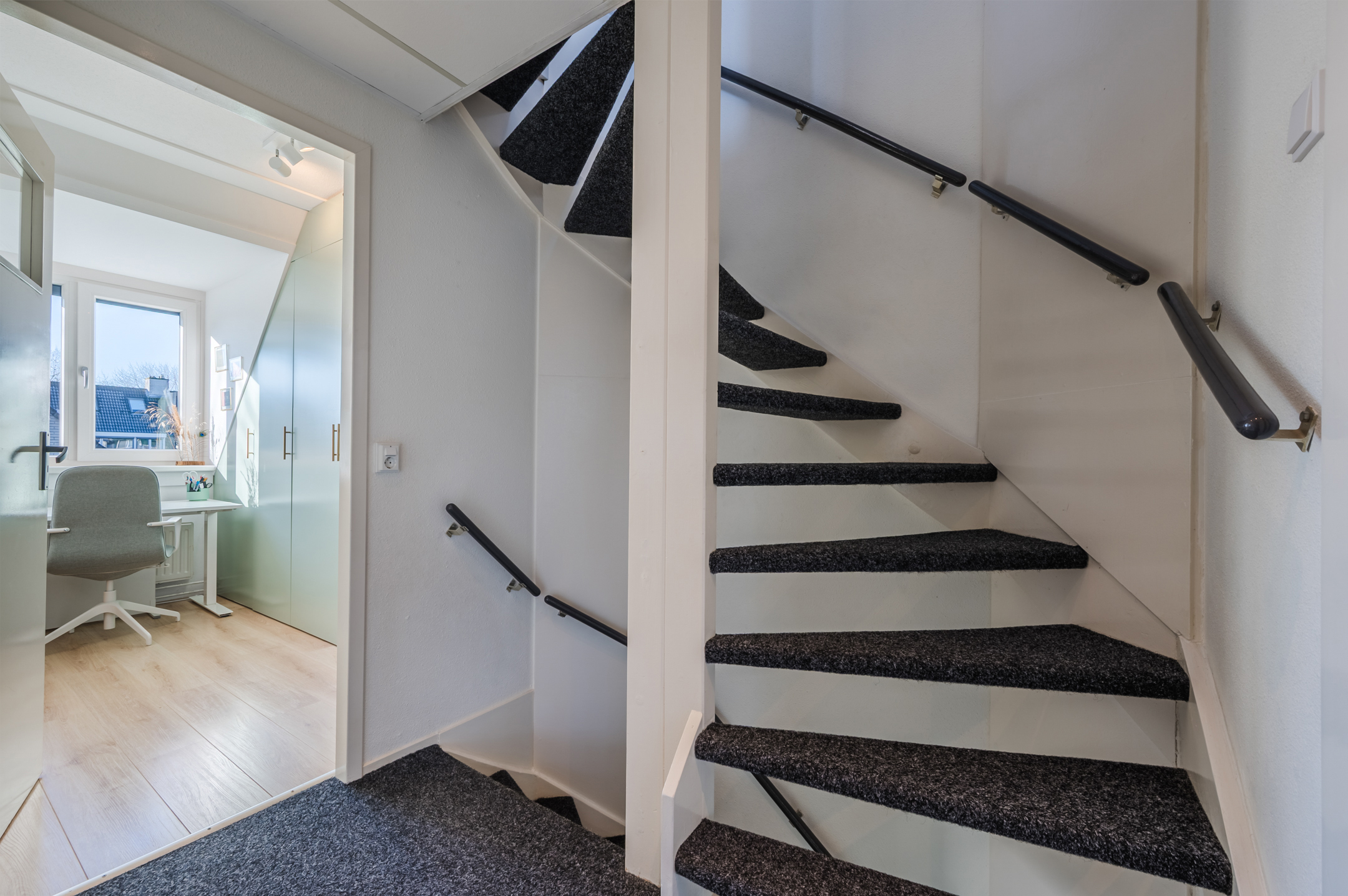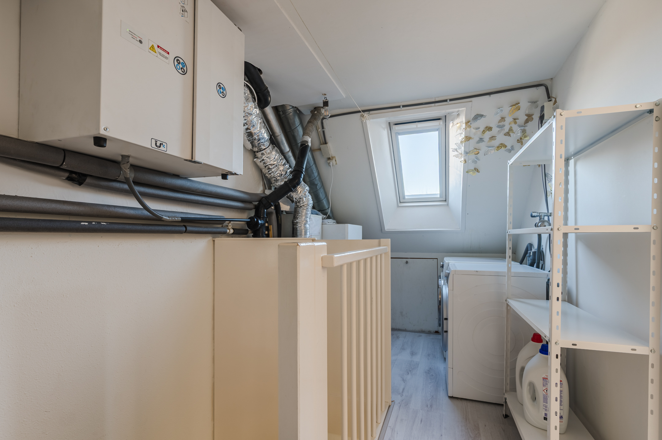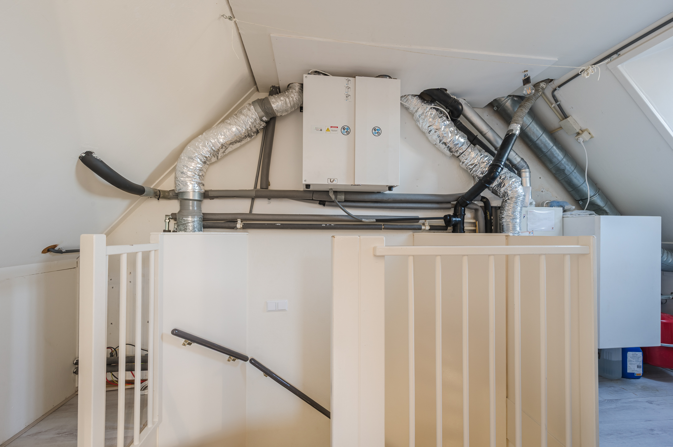 Via de vaste trap op de eerste verdieping bereiken we de ruime tweede verdieping met overloop en 4e slaapkamer. De aansluitingen voor de witgoedopstelling bevinden zich op de overloop en er is onder het schuine dak veel bergruimte achter knieschotten aanwezig.