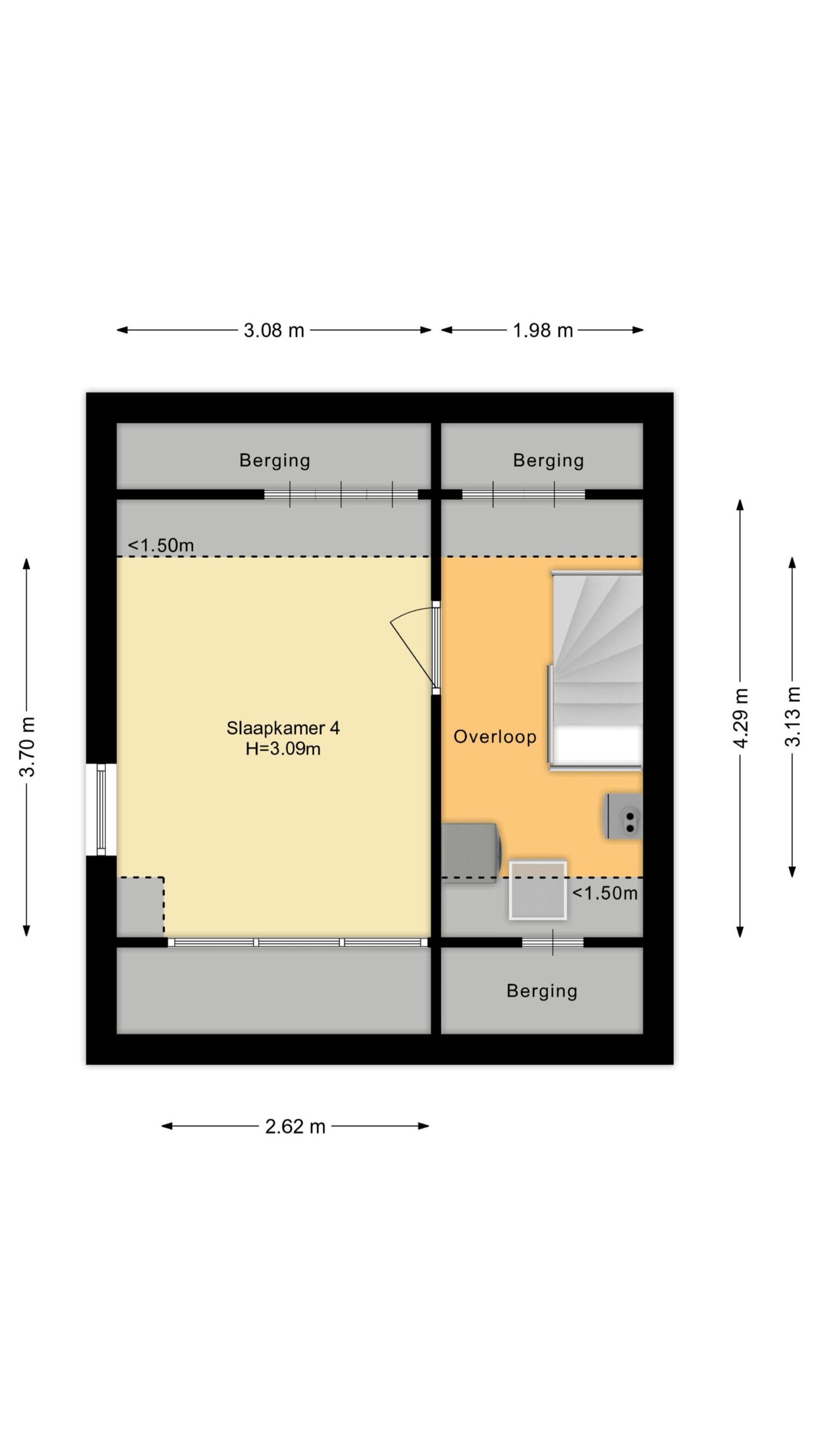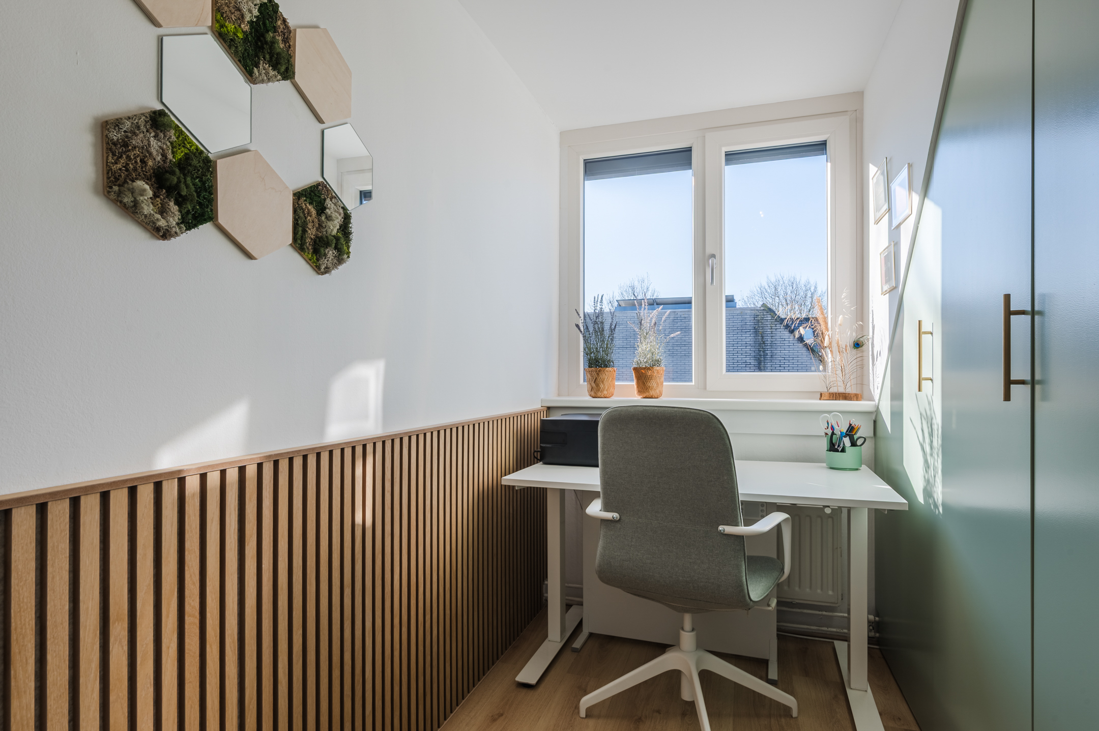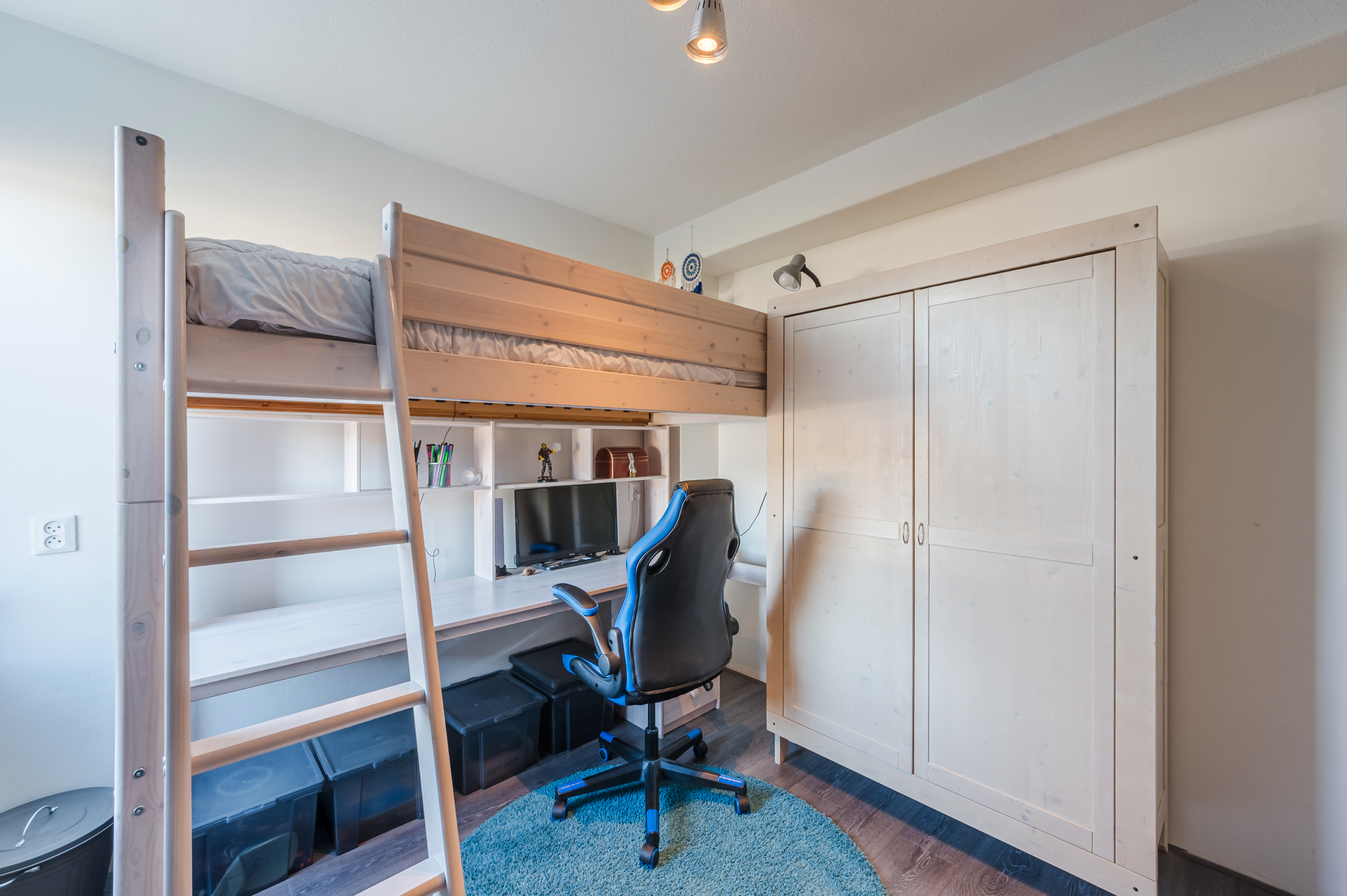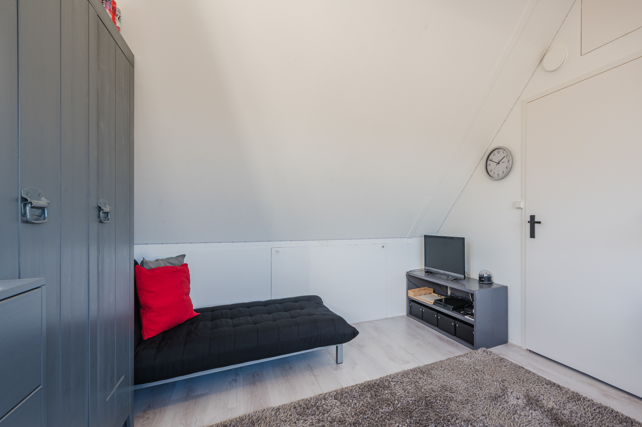 Via de vaste trap op de eerste verdieping bereiken we de ruime tweede verdieping met overloop en 4e slaapkamer. De aansluitingen voor de witgoedopstelling bevinden zich op de overloop en er is onder het schuine dak veel bergruimte achter knieschotten aanwezig.