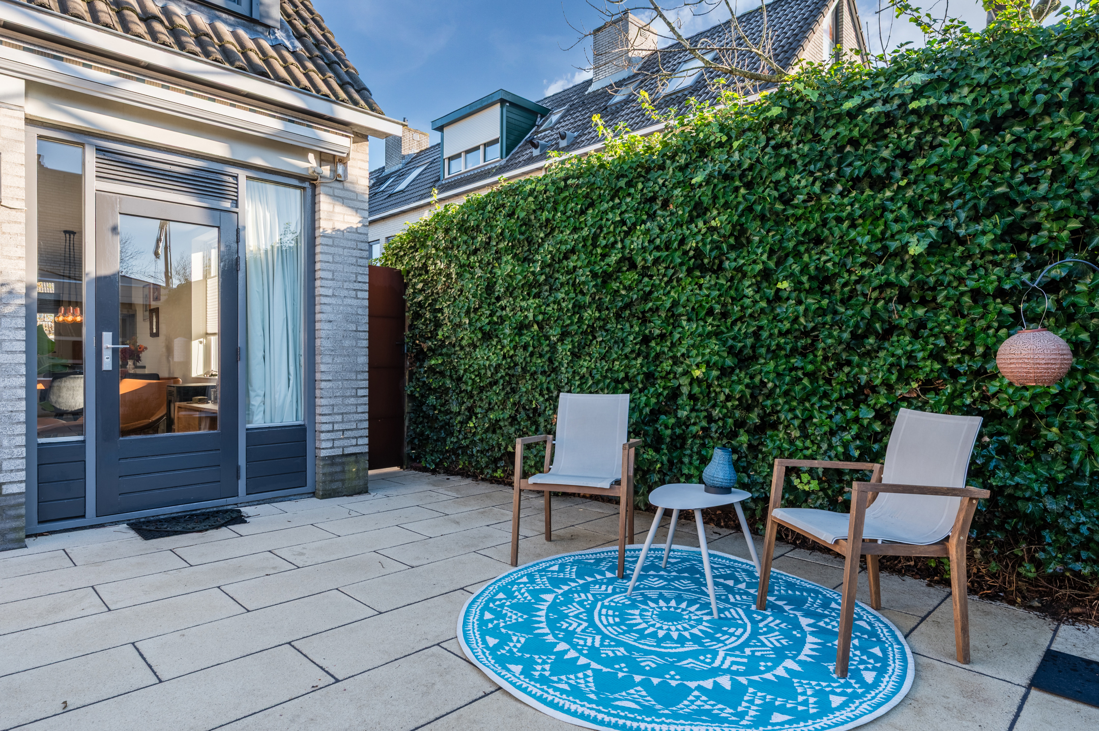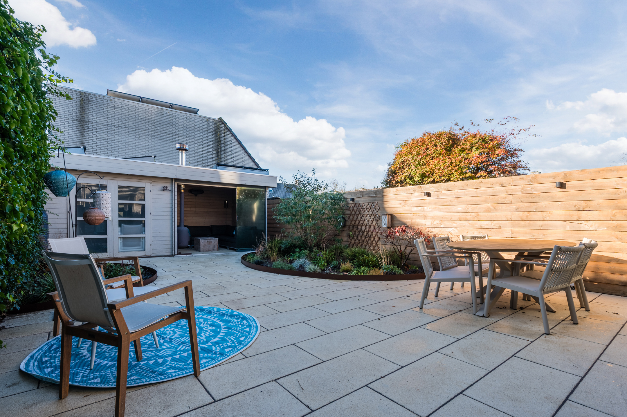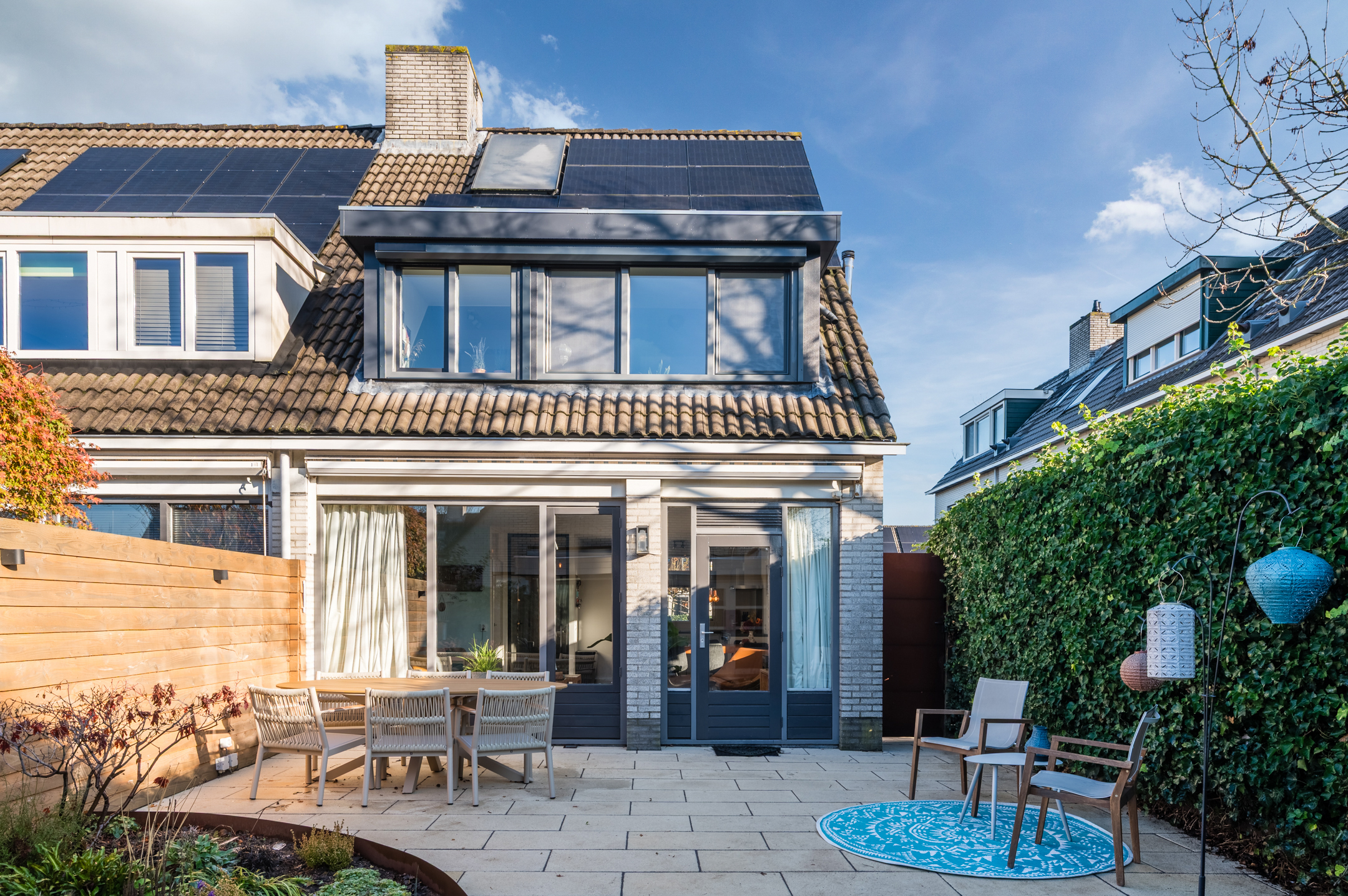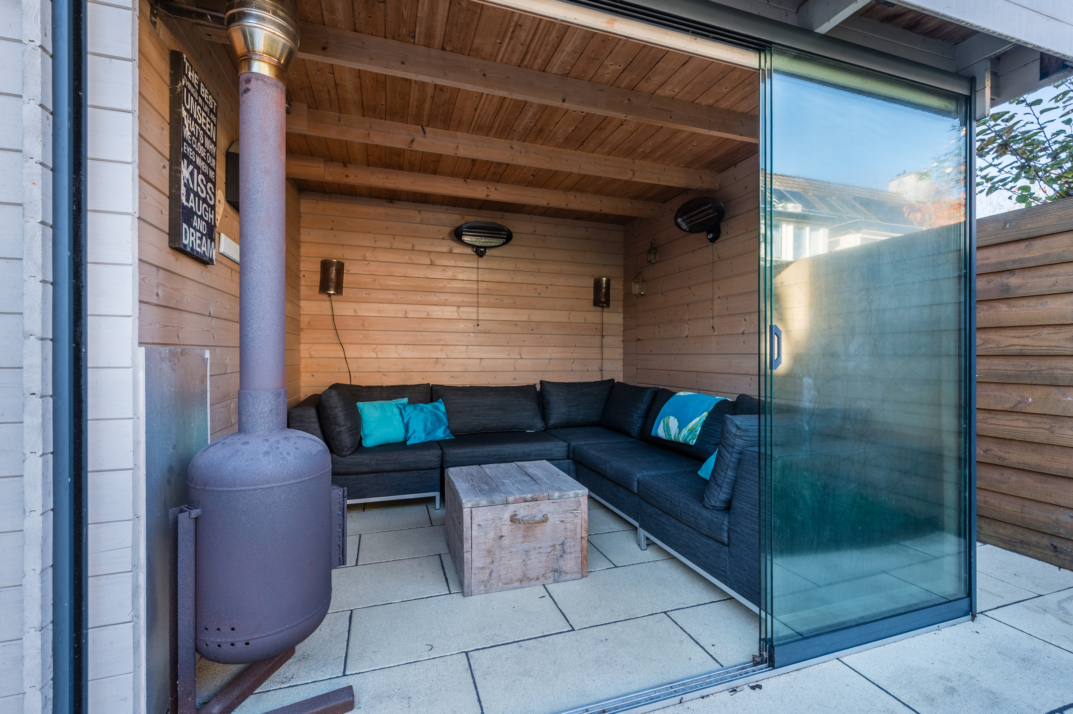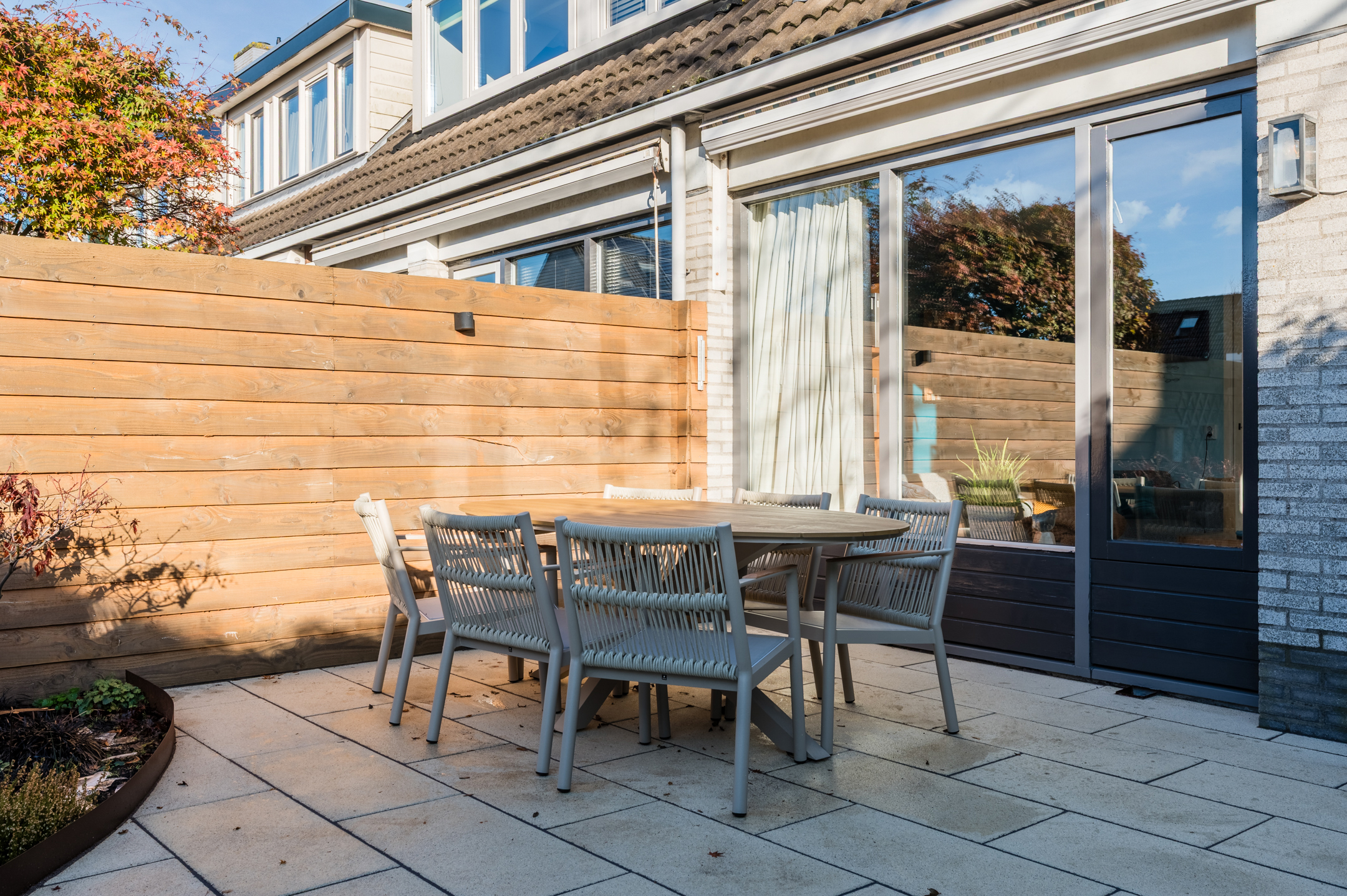De grote tuin is gelegen op het zonnige zuidwesten en omdat dit een hoekwoning is, profiteer je van een extra ruim hoekperceel. De tuin is fraai aangelegd met een groot betegeld terras, een groene border en groene hagen. Achterin de tuin staat een luxe tuinkamer met afsluitbare glazen pui en houtkachel. Geschakeld aan deze tuinkamer zit een handige berging.