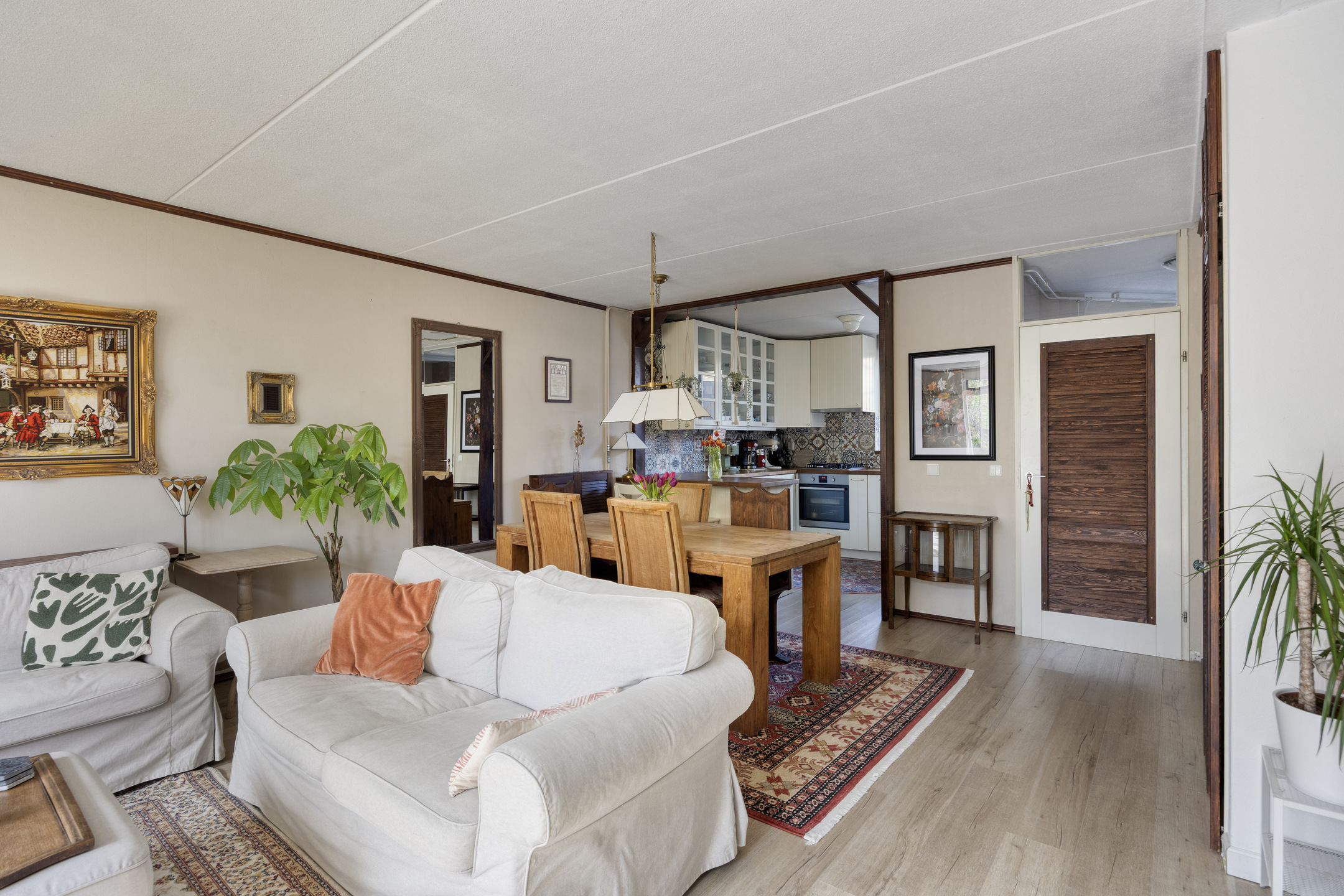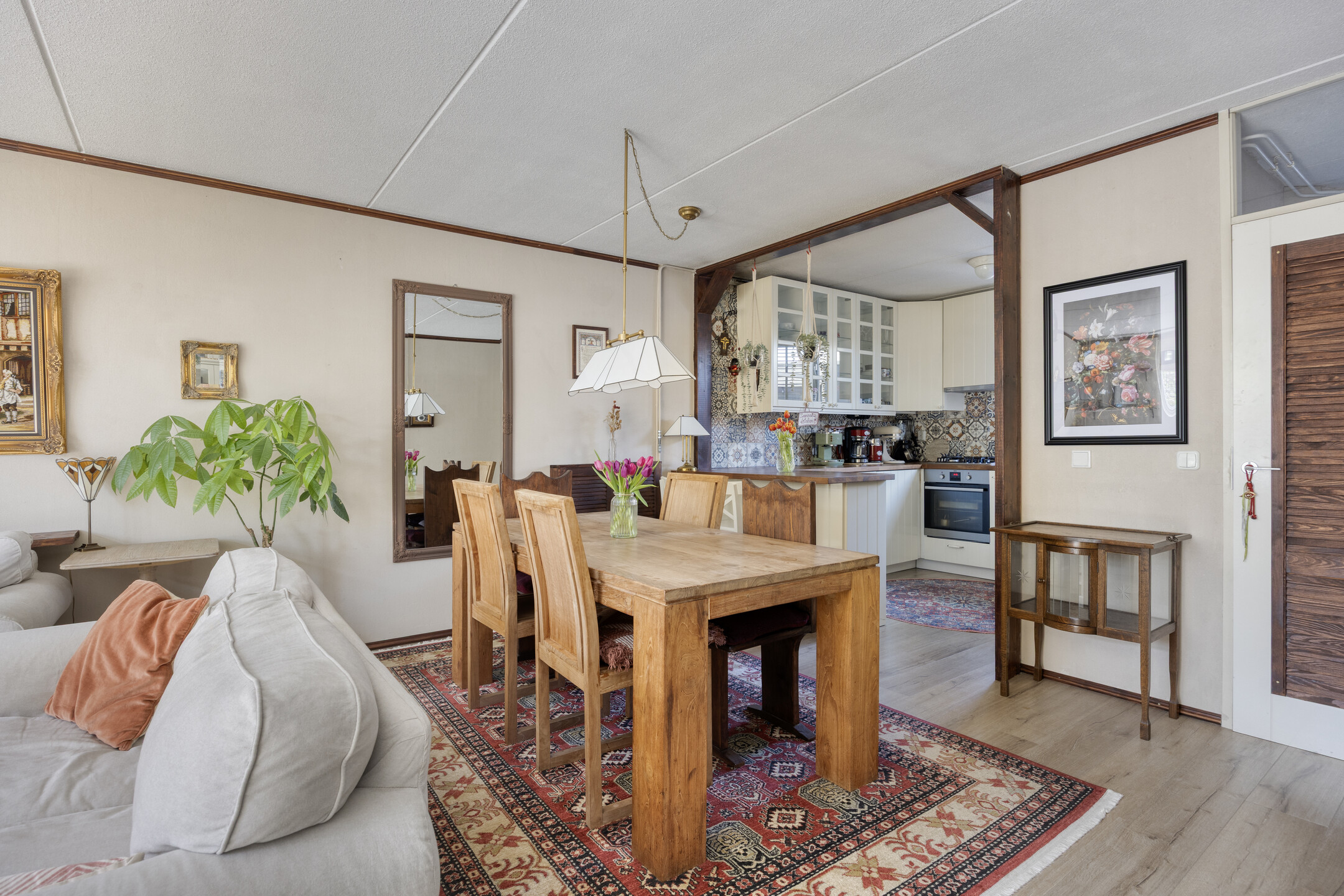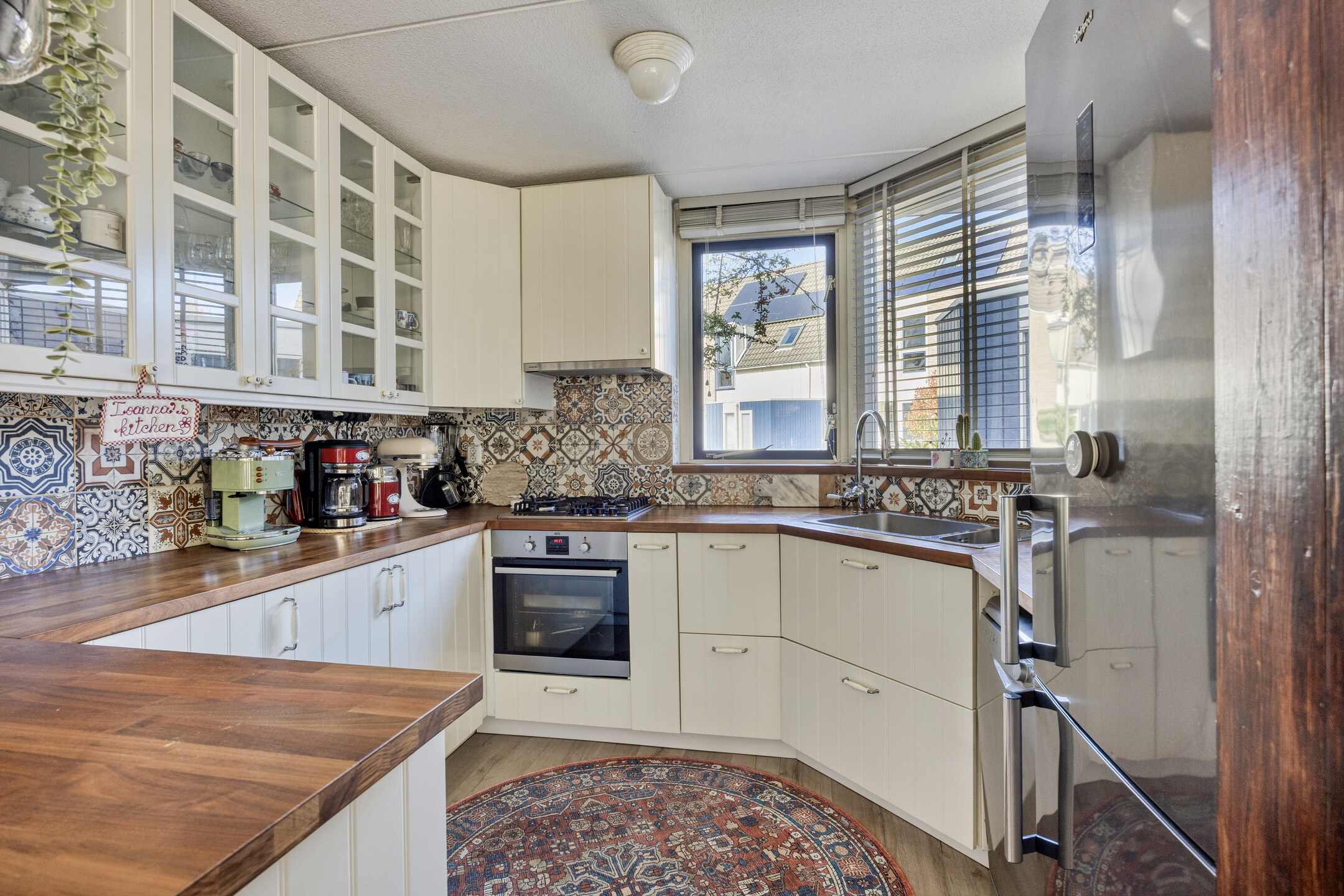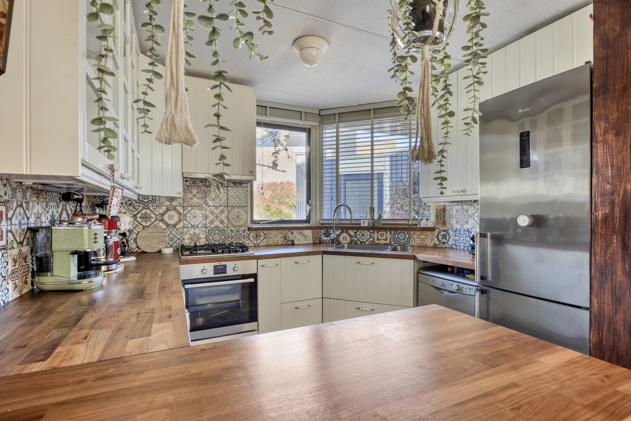 De keuken ligt aan de voorzijde en is uitgevoerd in een U-opstelling, voorzien van diverse inbouwapparatuur (gaskookplaat, afzuigkap en oven). Vanuit het raam heb je zicht op de straat.