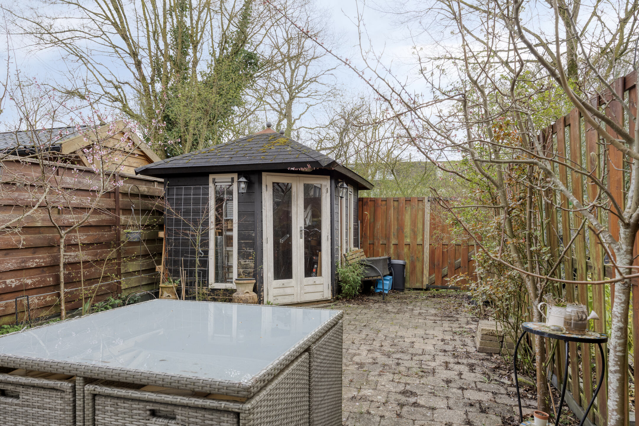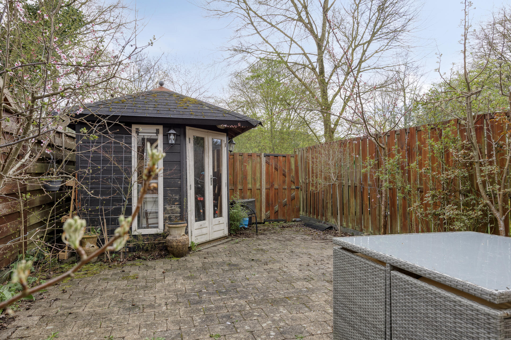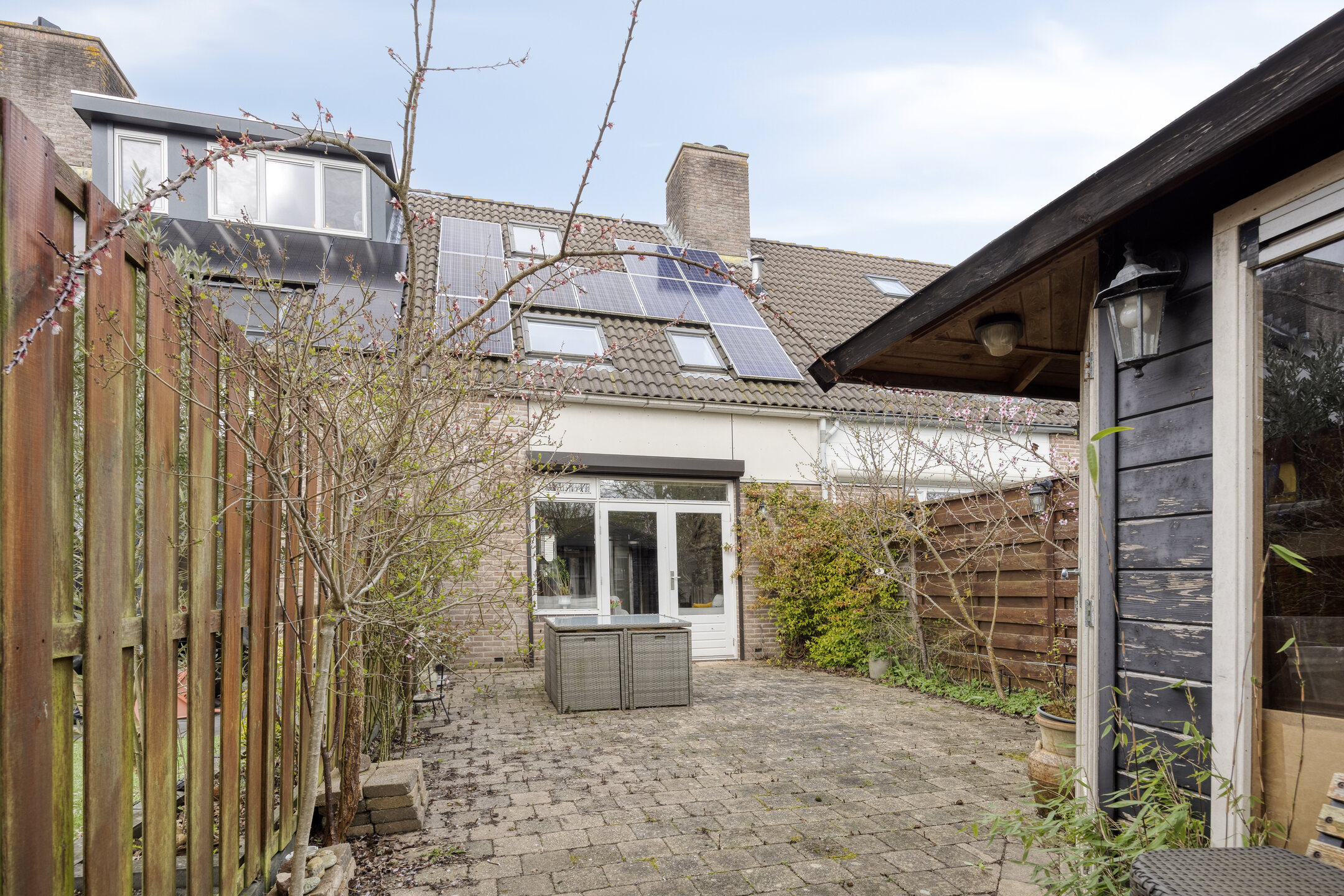 De achtertuin is ruim en grotendeels bestraat, waardoor je hier een gezellige zitplek kunt creƫren. Achterin staat een vrijstaande berging en er is een praktische achterom aanwezig.