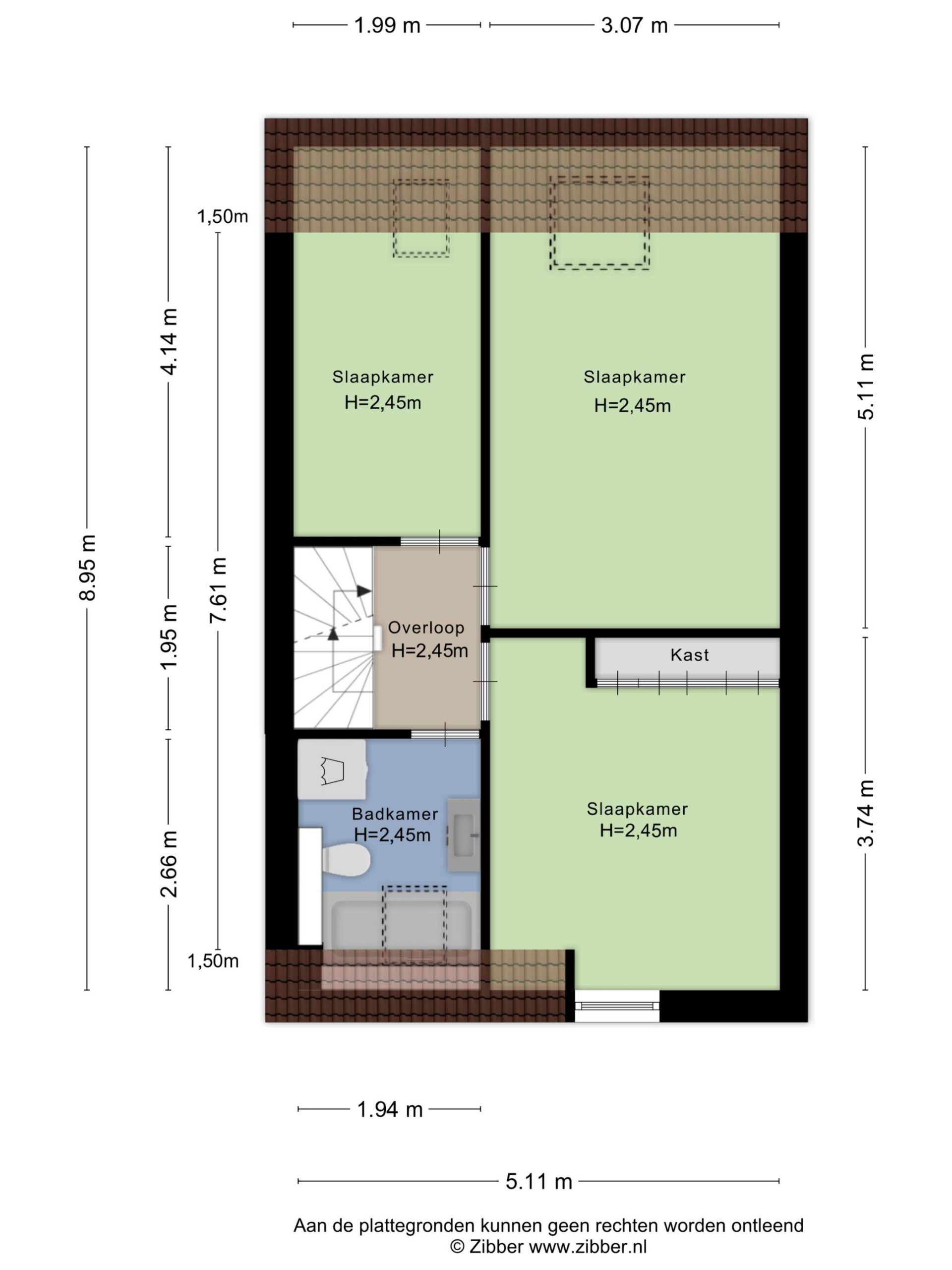 Eenmaal op de overloop heb je toegang tot drie slaapkamers en de badkamer. De slaapkamers (1,99 x 4,14 + 3,07 x 3,74 + 3,07 x 5,11 m) zijn netjes afgewerkt, hebben daglichttoetreding en zijn goed in te richten als slaap-, werk- of kinderkamer. De moderne badkamer is voorzien van een ligbad met douchemogelijkheid, wastafelmeubel en wandcloset. Hier zijn tevens de witgoedaansluitingen gesitueerd, en dankzij het dakraam is er natuurlijke ventilatie aanwezig.