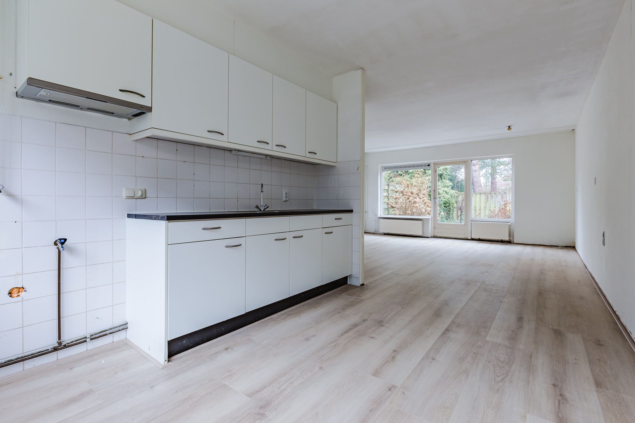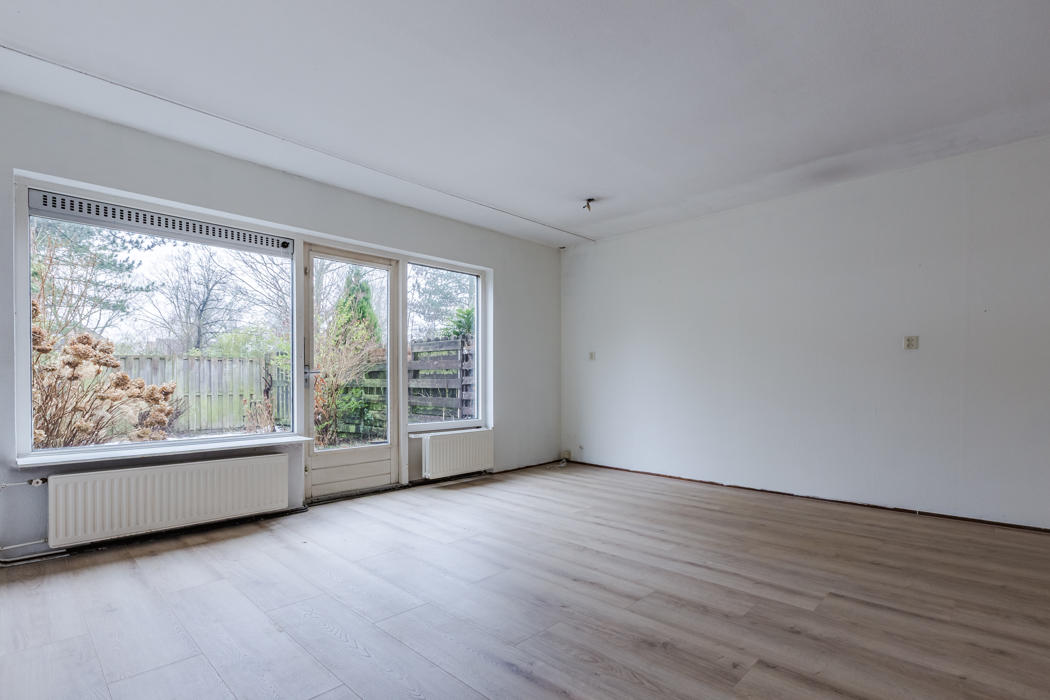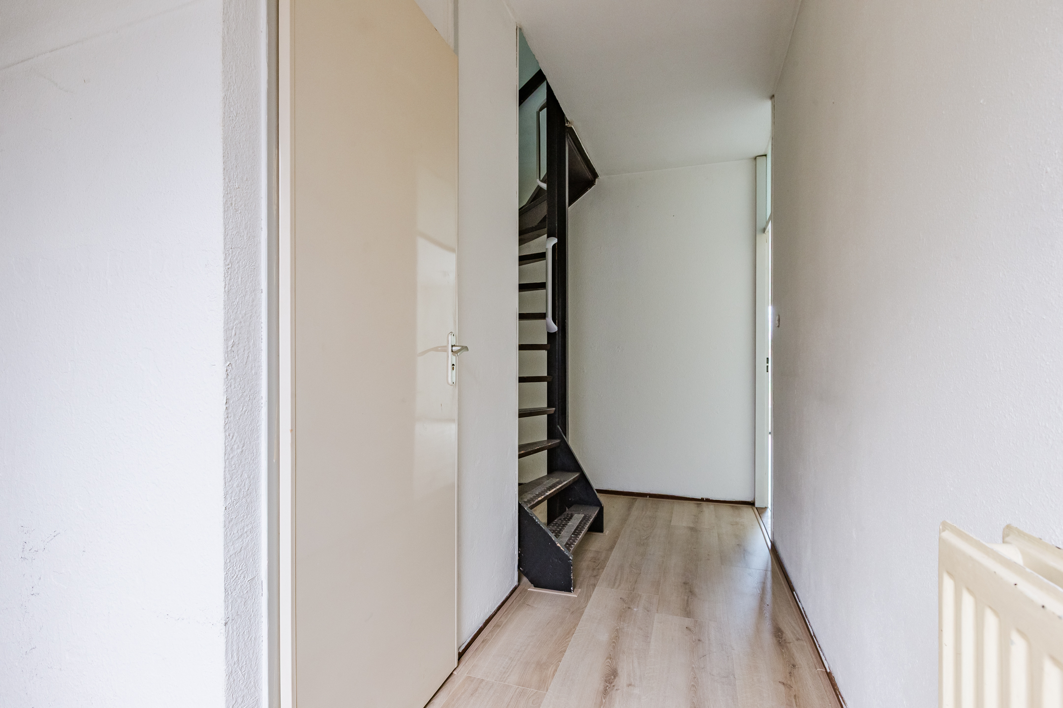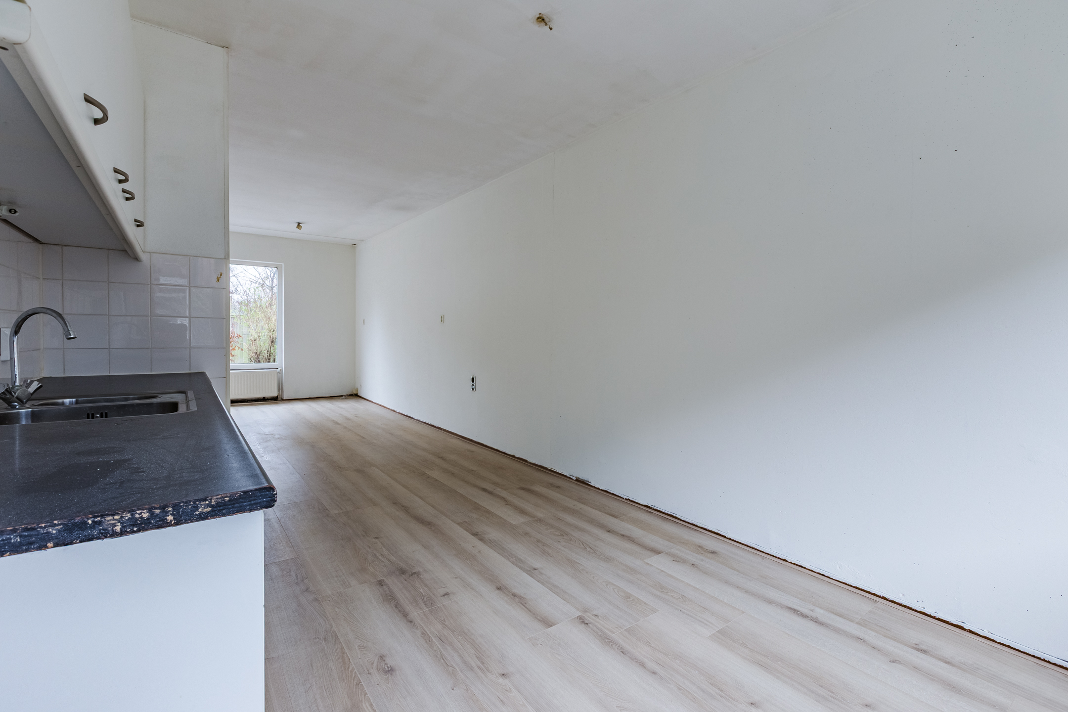 Bij binnenkomst in de woning tref je een hal met meterkast, een toilet en de trap naar de eerste verdieping. Vanuit de hal loop je door naar de lichte woonkamer, die is voorzien van grote raampartijen en een deur naar de tuin. De open keuken is eenvoudig en biedt de basisvoorzieningen, waardoor je deze volledig naar eigen wens kunt inrichten.