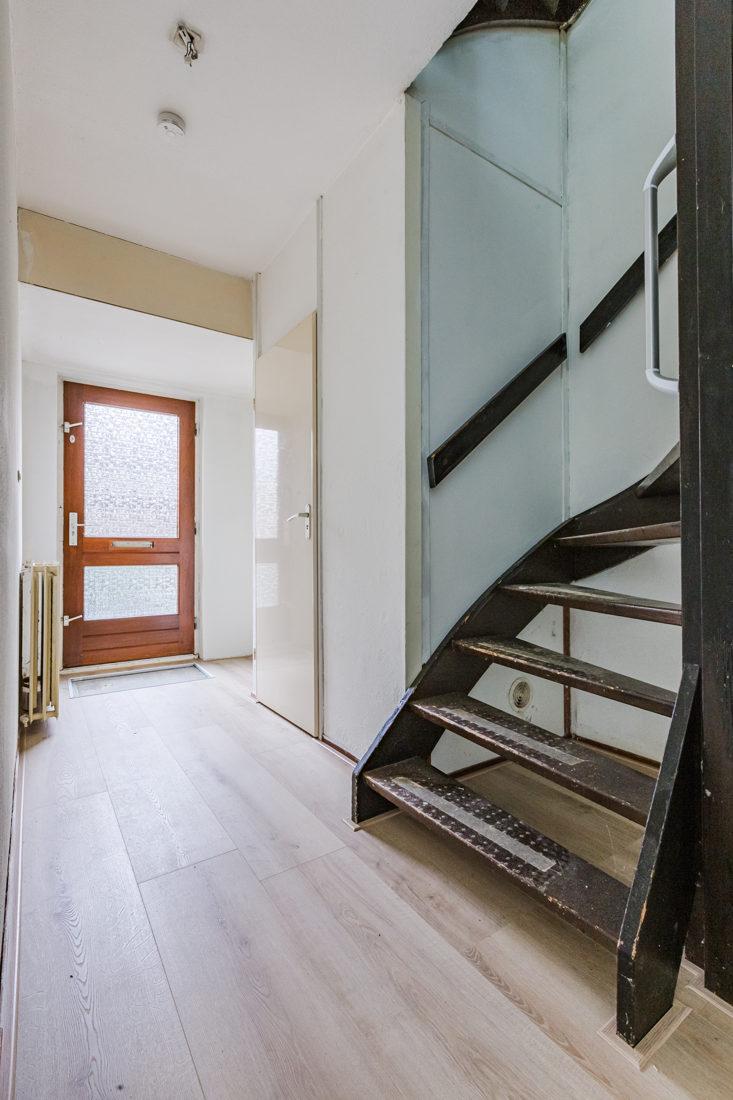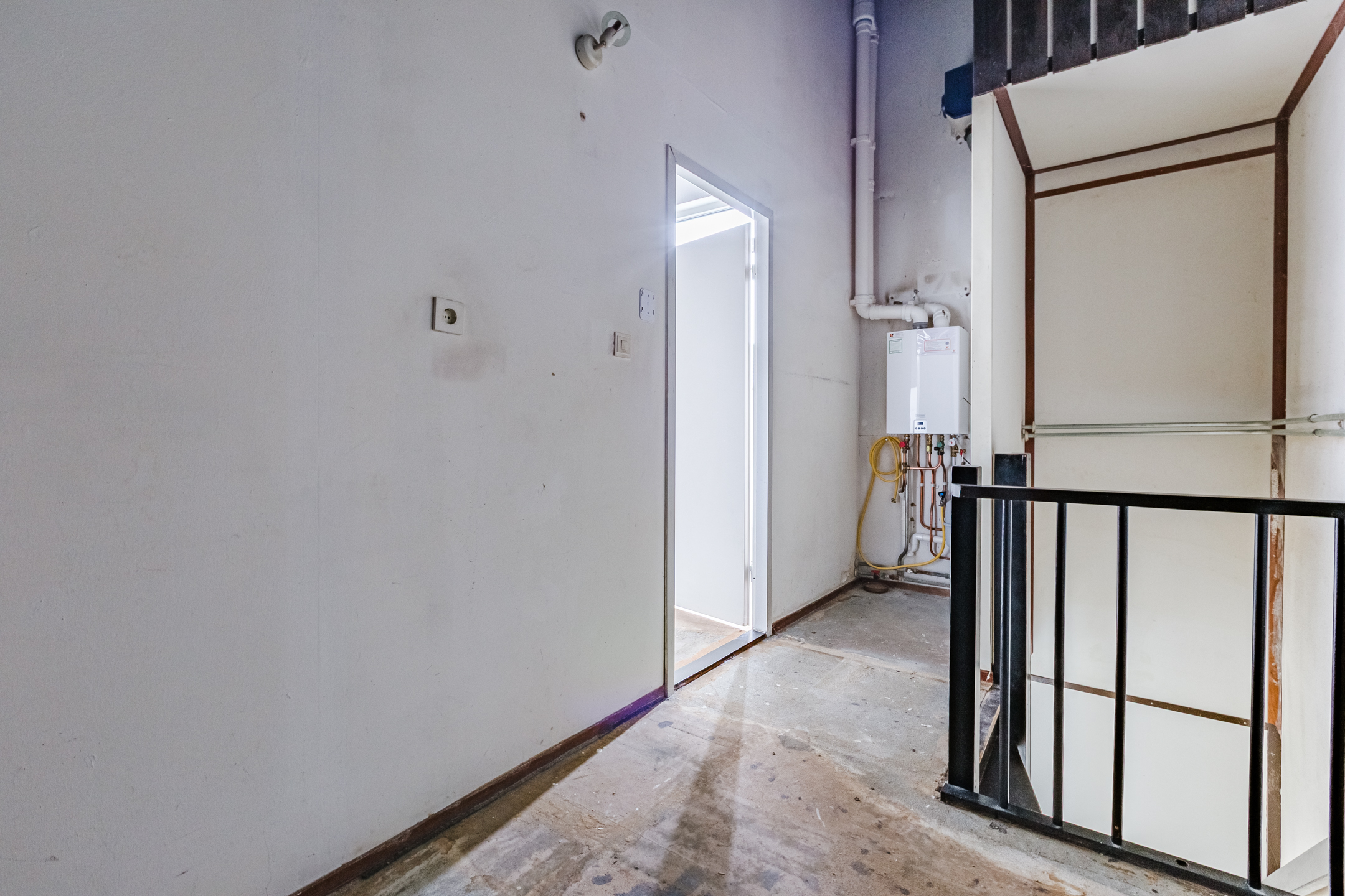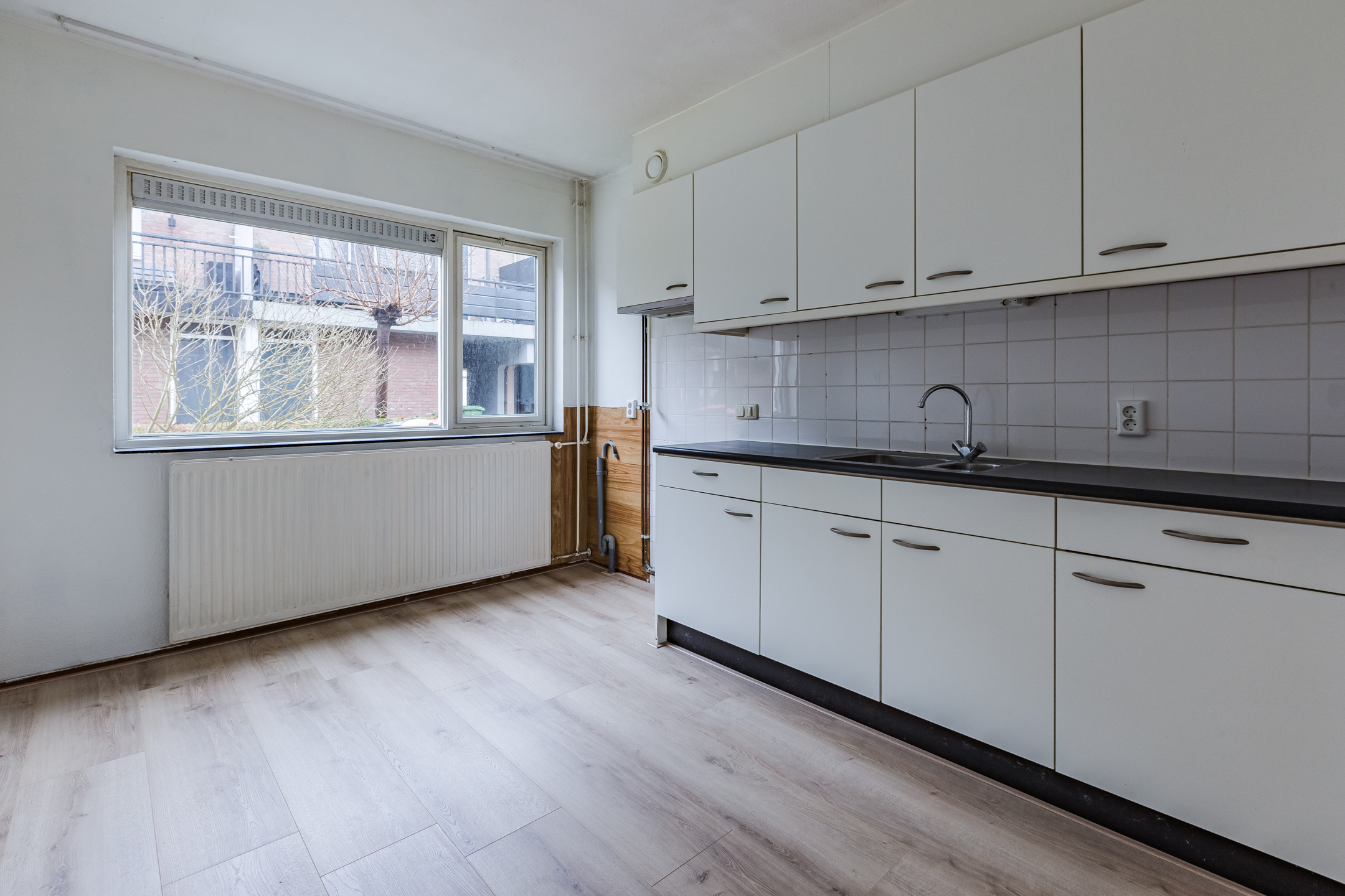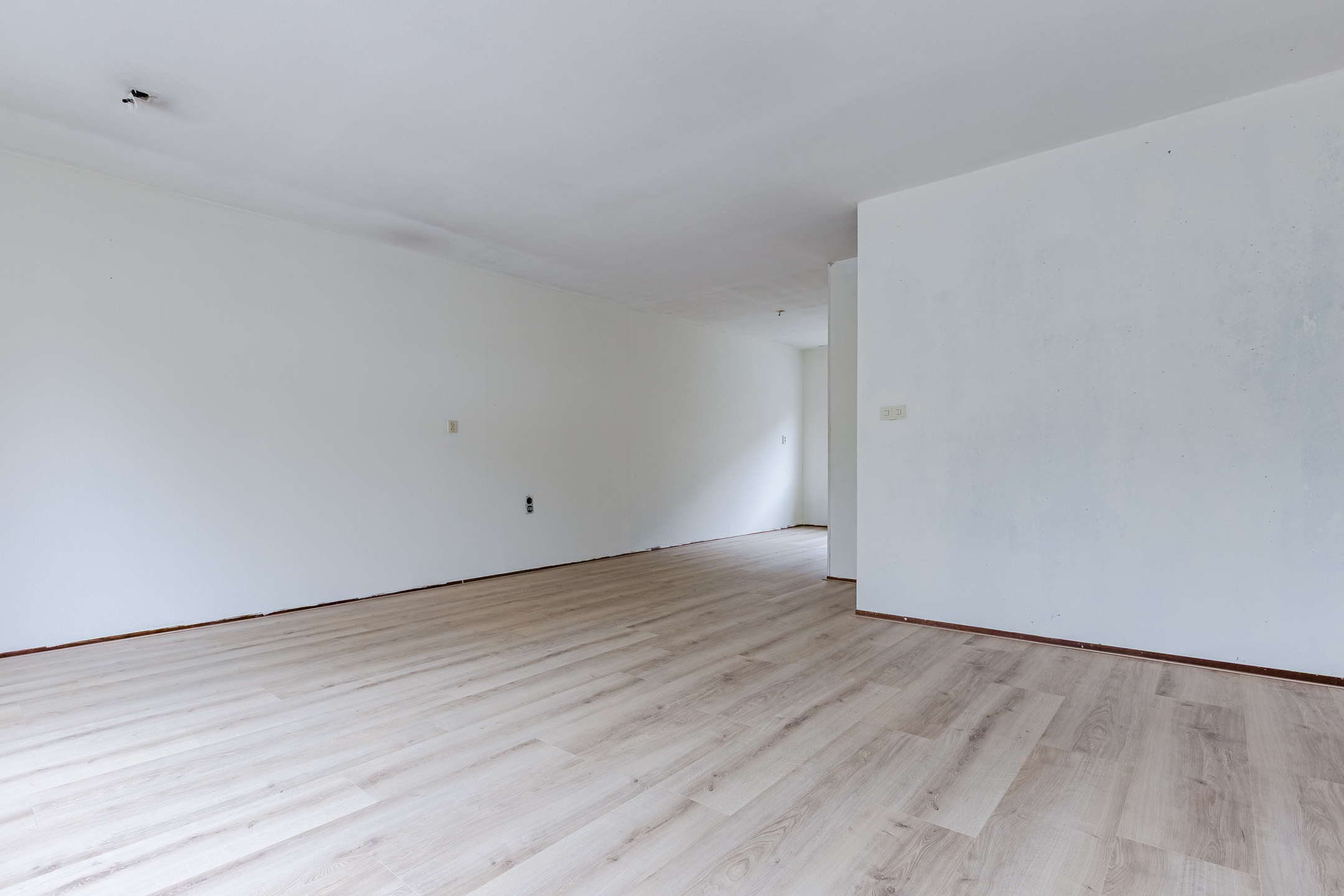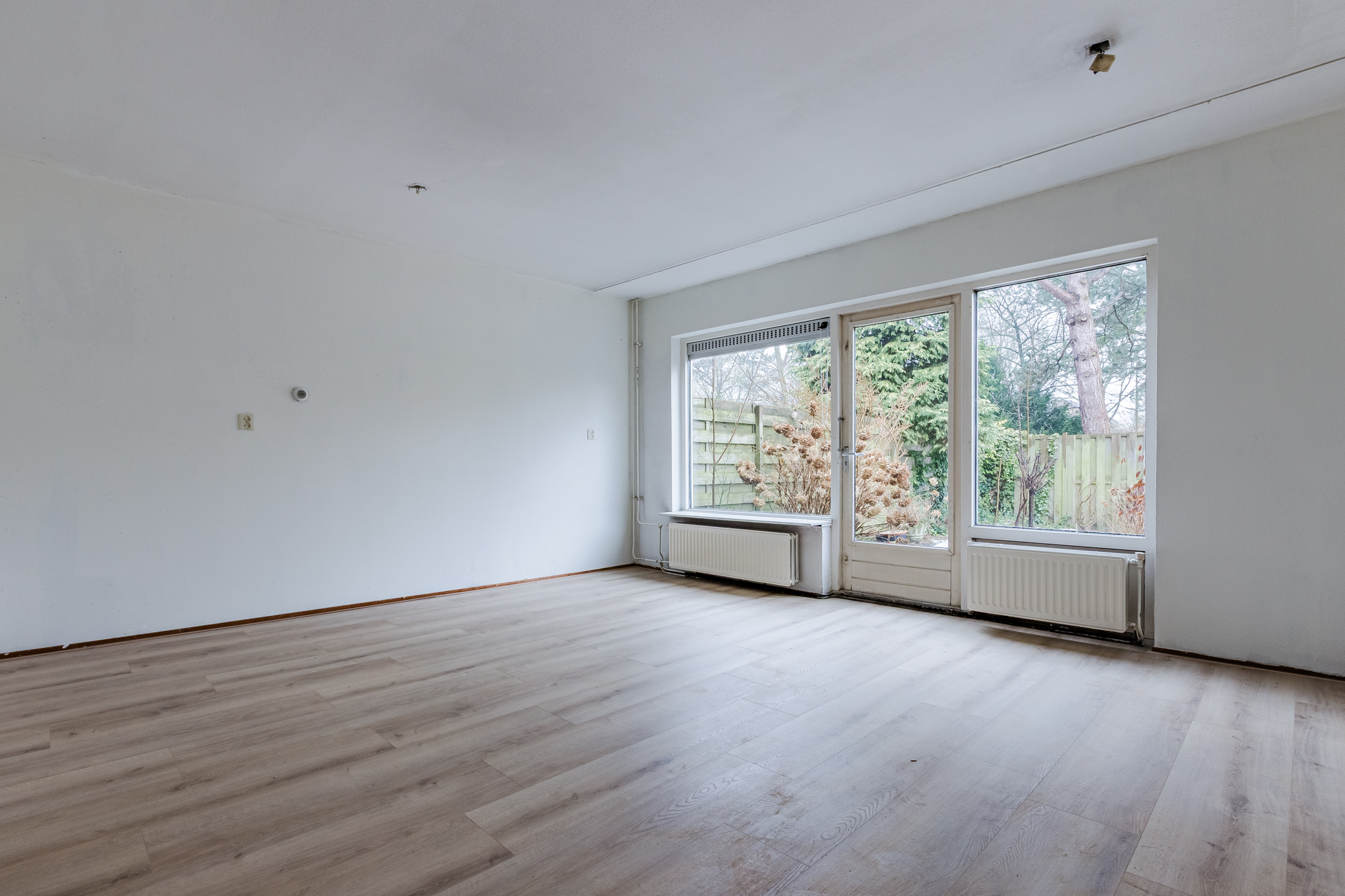 Bij binnenkomst in de woning tref je een hal met meterkast, een toilet en de trap naar de eerste verdieping. Vanuit de hal loop je door naar de lichte woonkamer, die is voorzien van grote raampartijen en een deur naar de tuin. De open keuken is eenvoudig en biedt de basisvoorzieningen, waardoor je deze volledig naar eigen wens kunt inrichten.