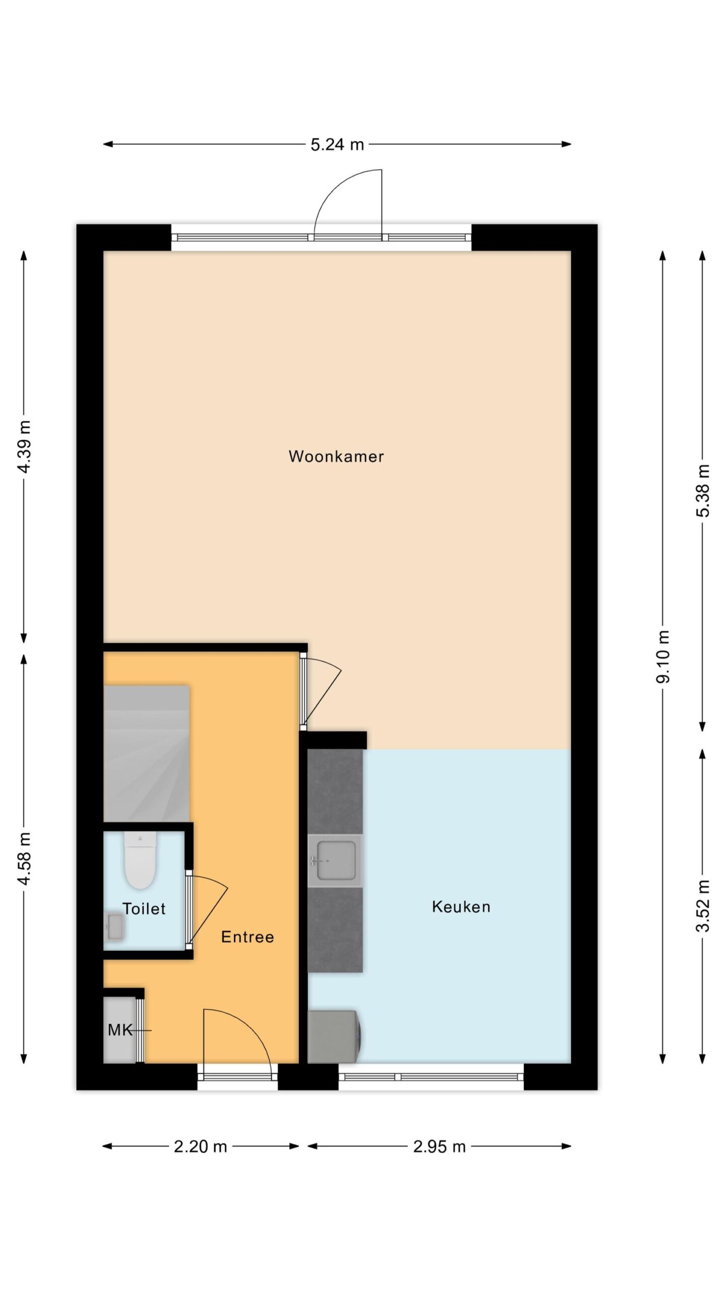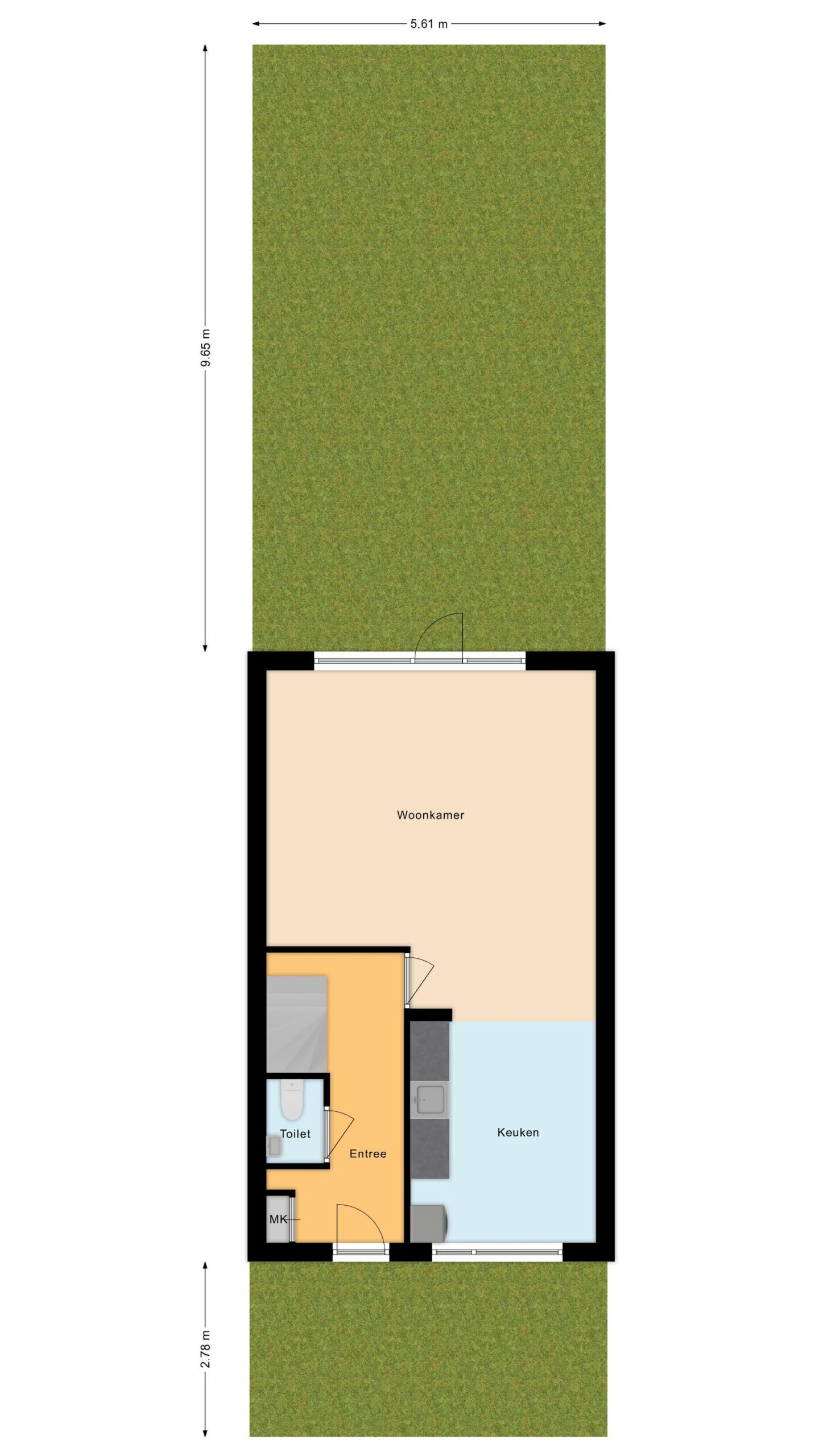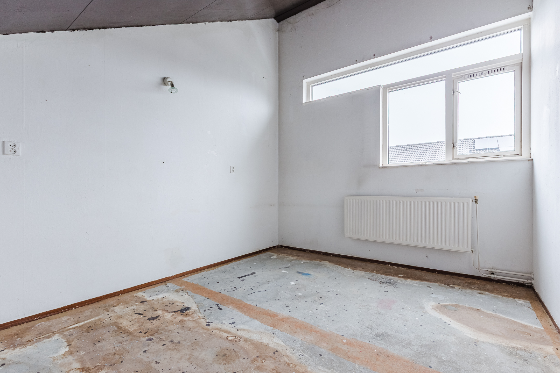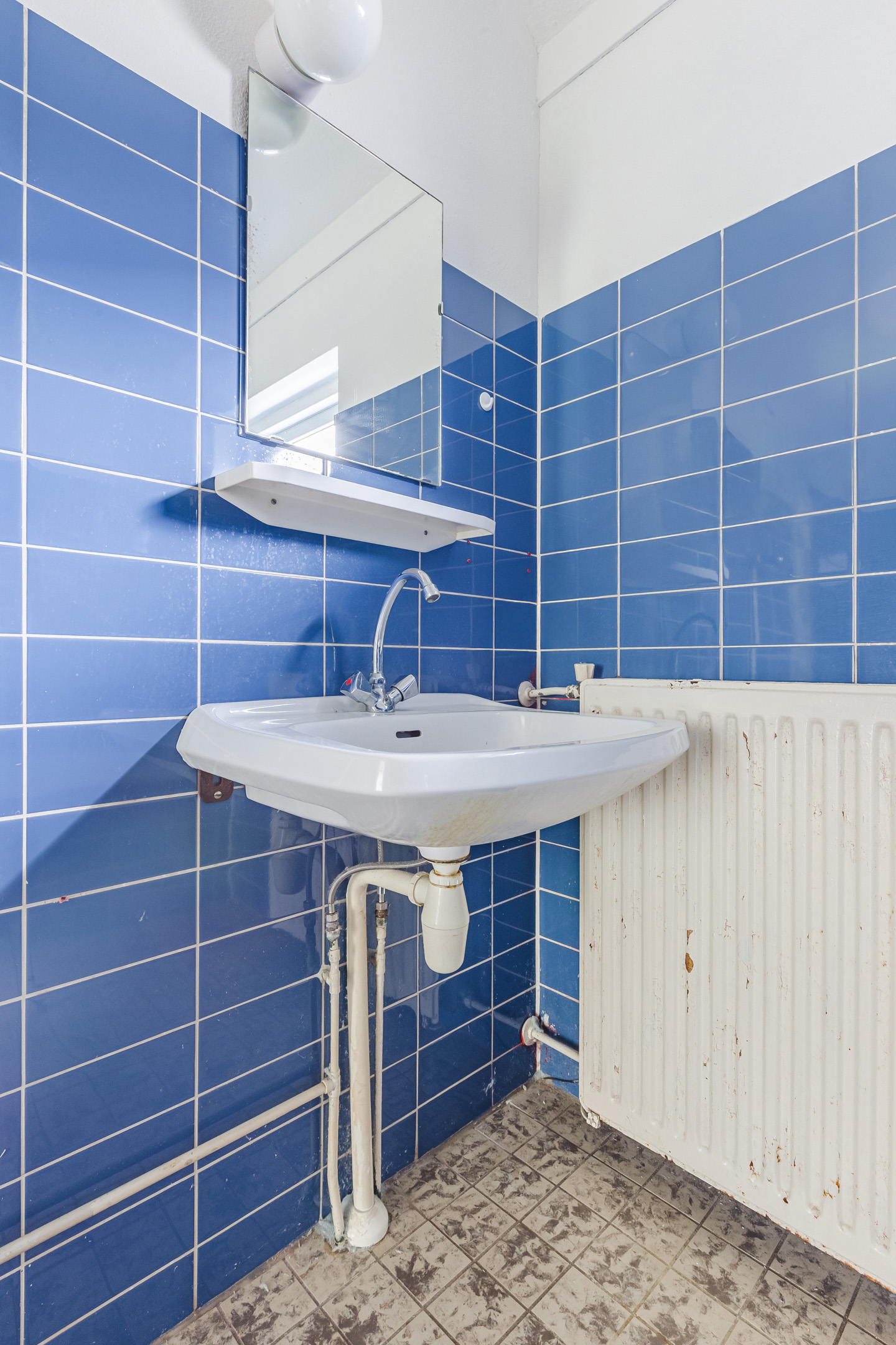 Bij binnenkomst in de woning tref je een hal met meterkast, een toilet en de trap naar de eerste verdieping. Vanuit de hal loop je door naar de lichte woonkamer, die is voorzien van grote raampartijen en een deur naar de tuin. De open keuken is eenvoudig en biedt de basisvoorzieningen, waardoor je deze volledig naar eigen wens kunt inrichten.