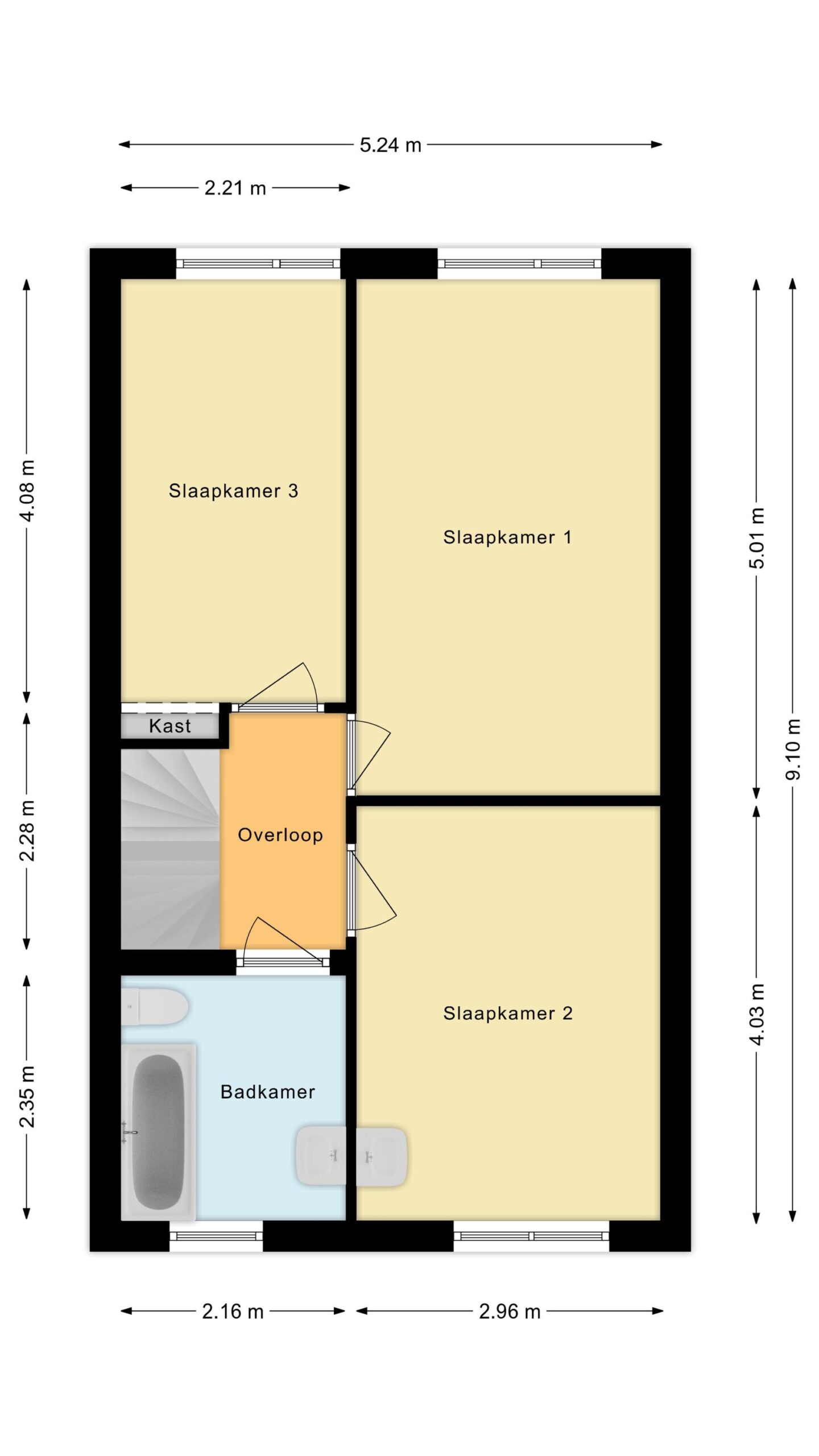 Op de eerste verdieping bevindt zich een overloop met toegang tot drie ruime slaapkamers, de badkamer en de trap naar de zolder. Allen met rechte gevels dus geen ruimteverlies. Iedere vierkante meter is een daadwerkelijk bruikbare leefruimte. De badkamer is voorzien van een bad, wastafel en toilet. Deze is ook nog geheel naar eigen smaak in te richten!
