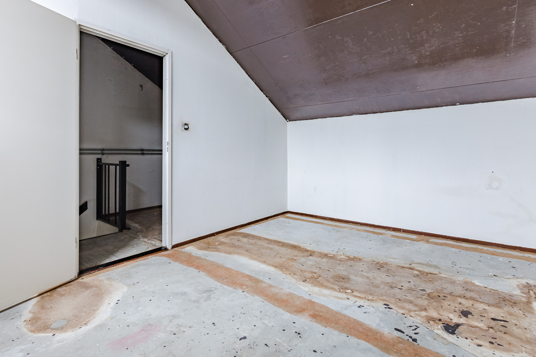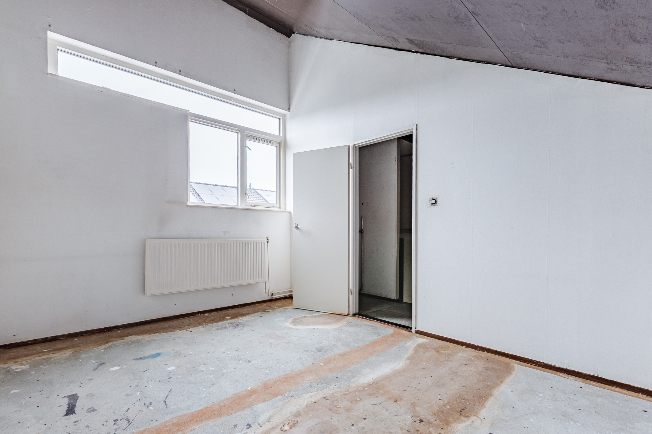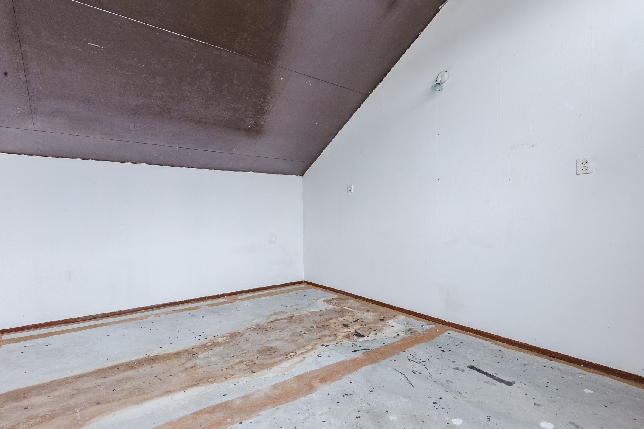 Op de zolder bevindt zich een overloop met toegang tot een riante slaapkamer met grote raampartijen. Deze benadrukken het ruimtelijke effect nog eens extra.
