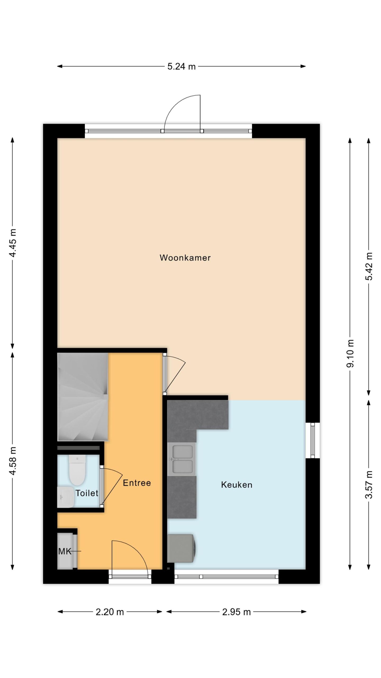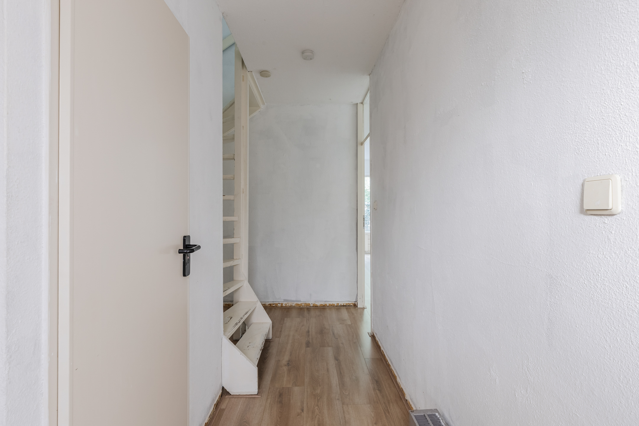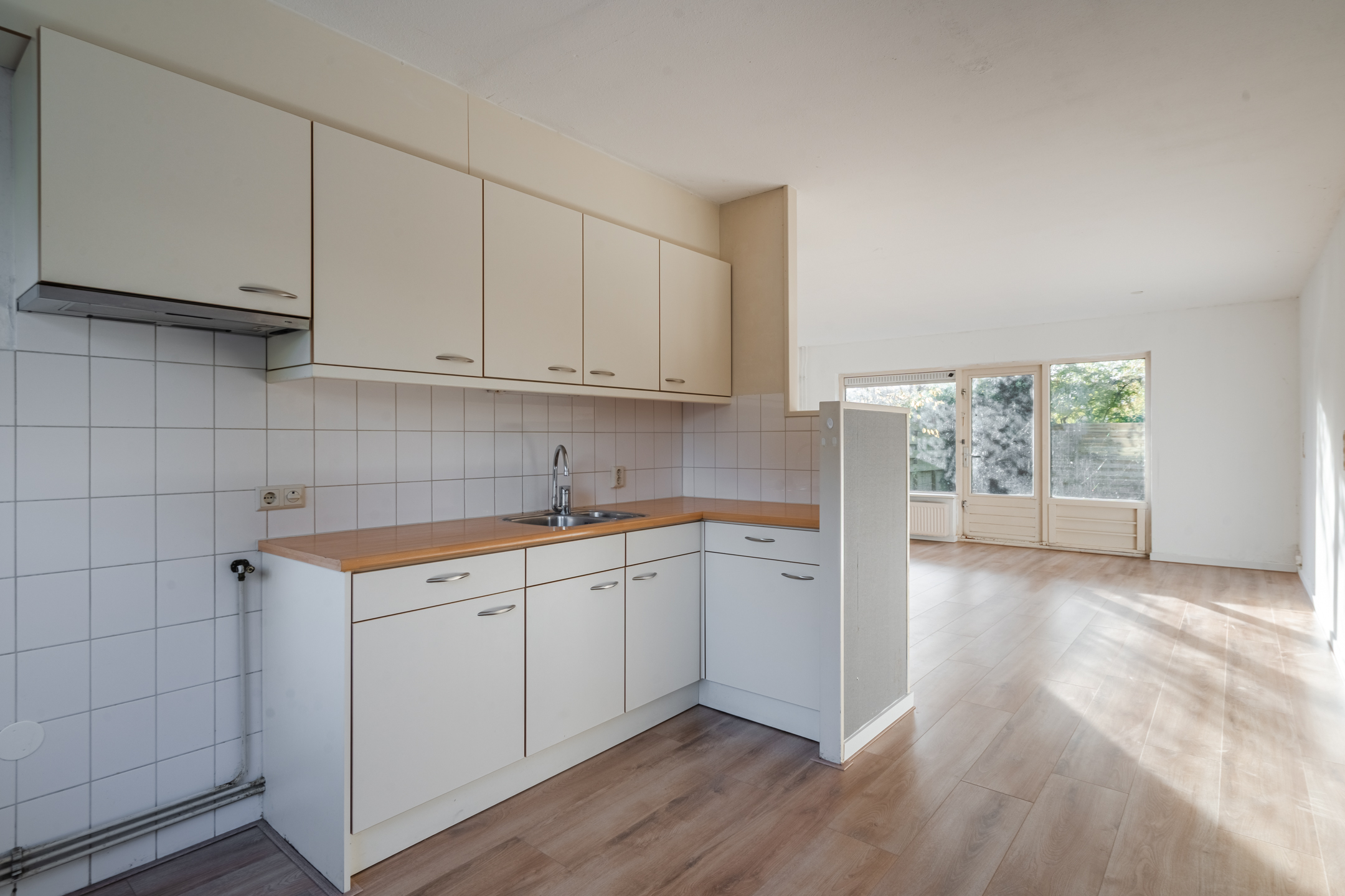 Bij binnenkomst in de woning tref je een hal met meterkast, een toilet en de trap naar de eerste verdieping. Vanuit de hal loop je door naar de lichte woonkamer, die is voorzien van grote raampartijen en een deur naar de tuin. De open keuken is eenvoudig en biedt de basisvoorzieningen, waardoor je deze volledig naar eigen wens kunt inrichten.