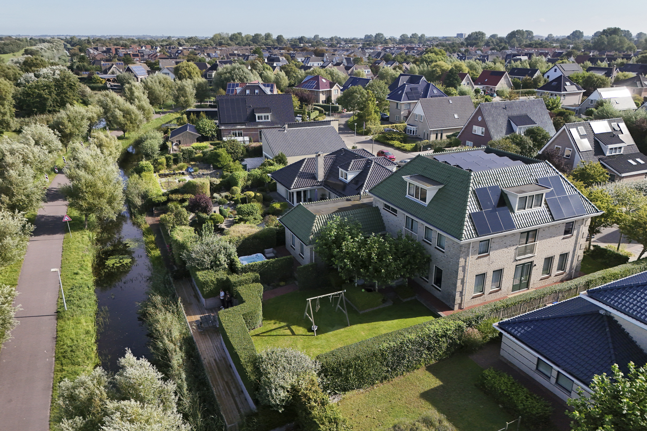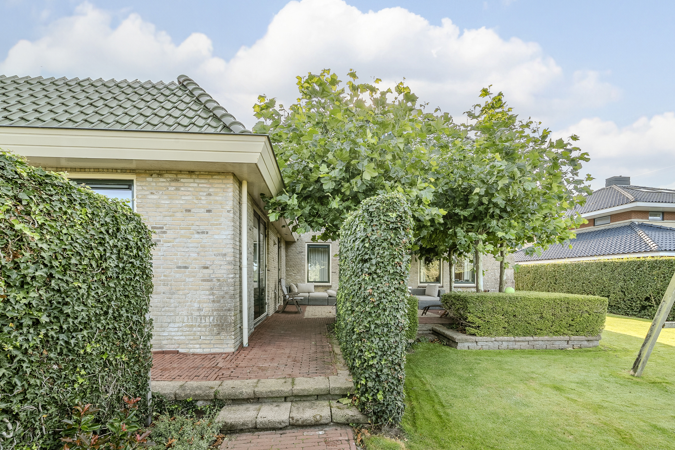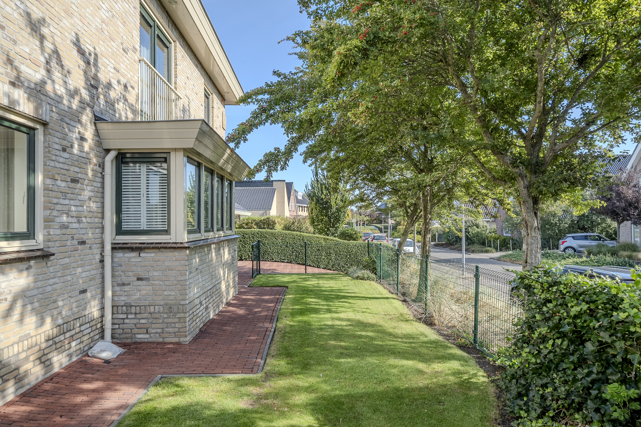 This house has a beautiful garden that runs almost completely around the house. The backyard faces west and borders a ditch with the golf course behind it. Furthermore, this is a remarkably sheltered garden, where you can enjoy plenty of privacy. In the front yard, you can easily park your car on your own driveway.