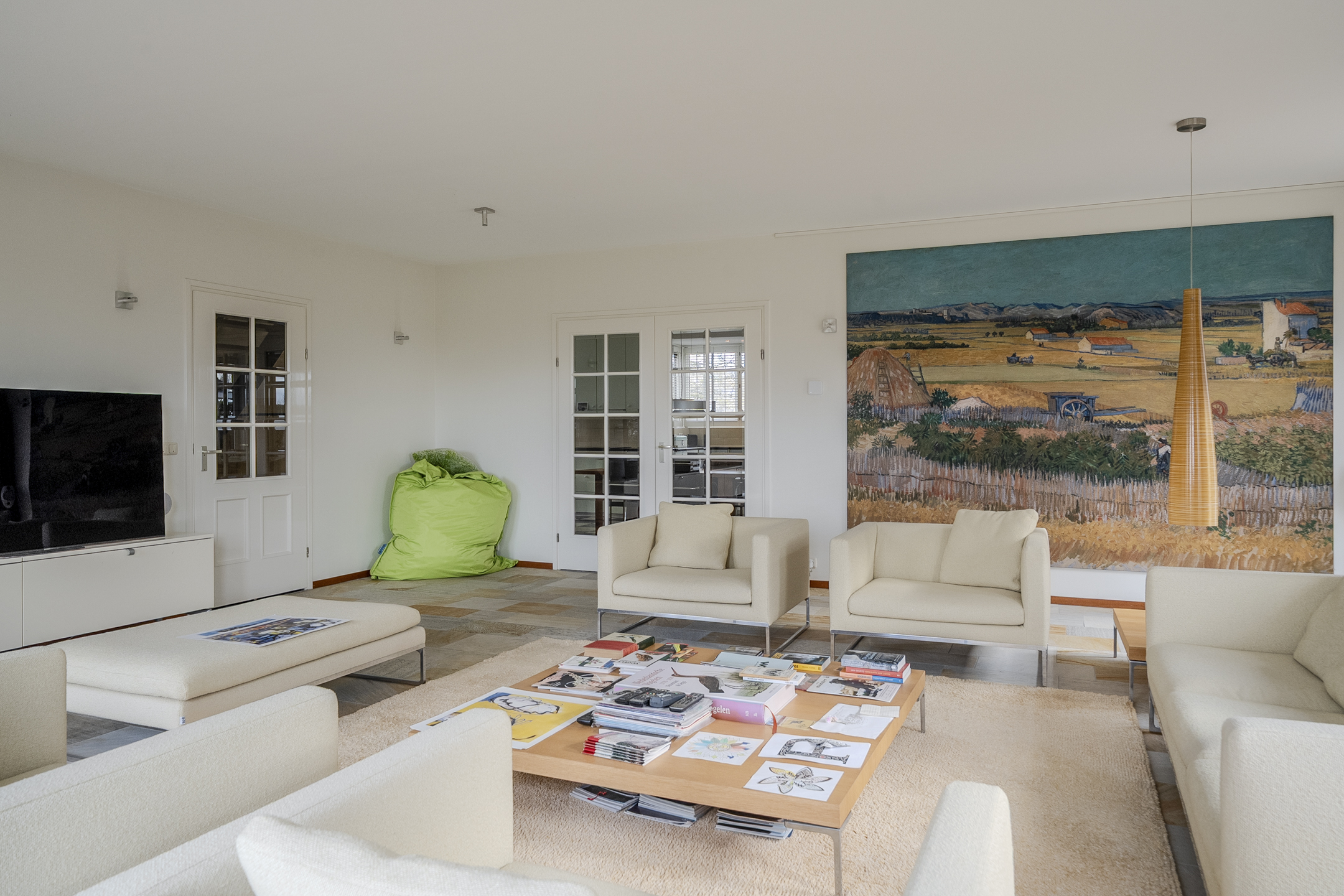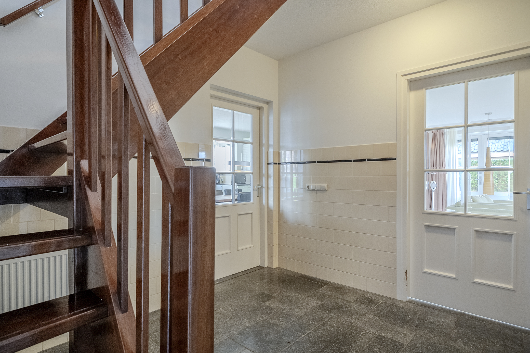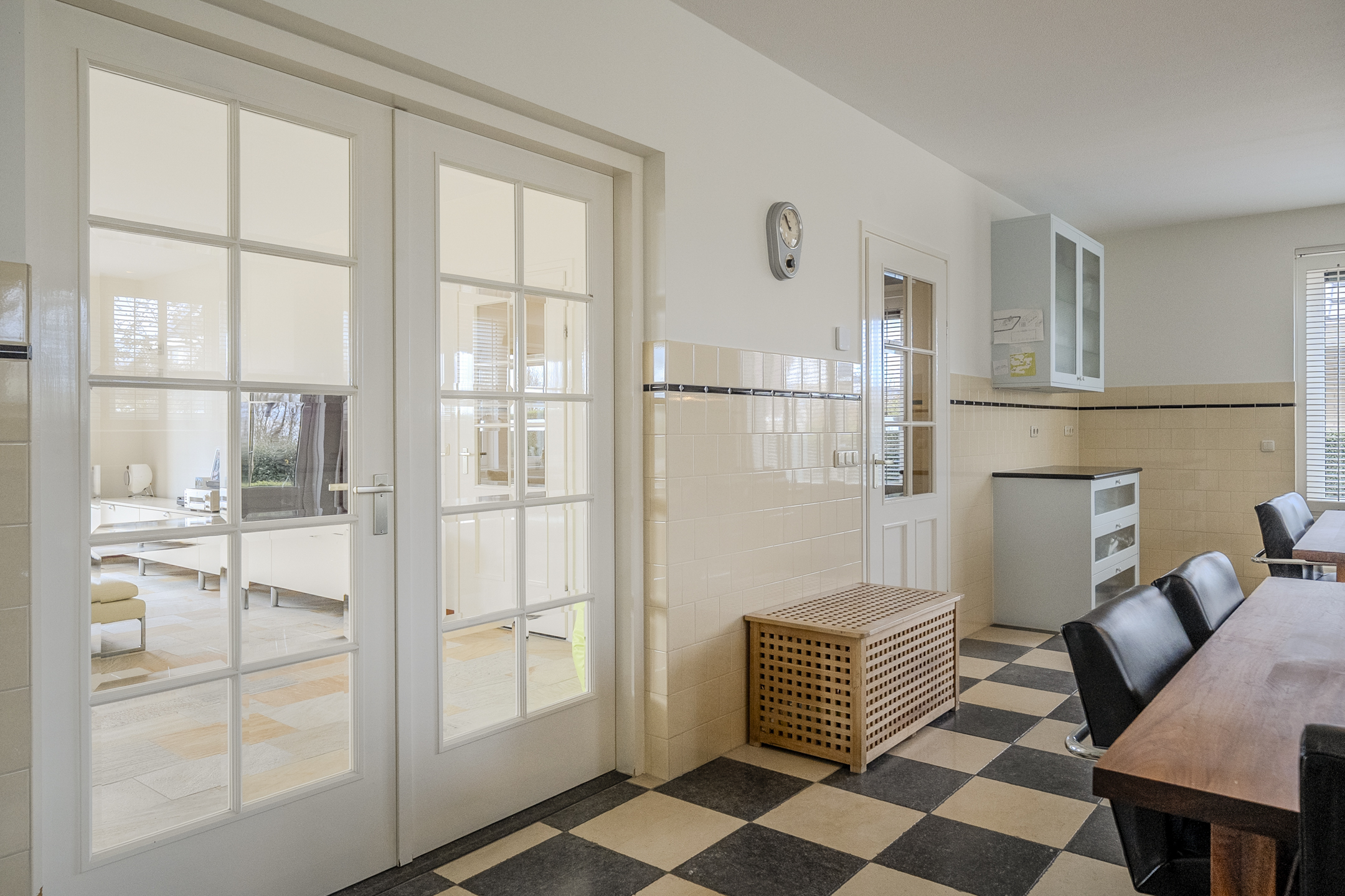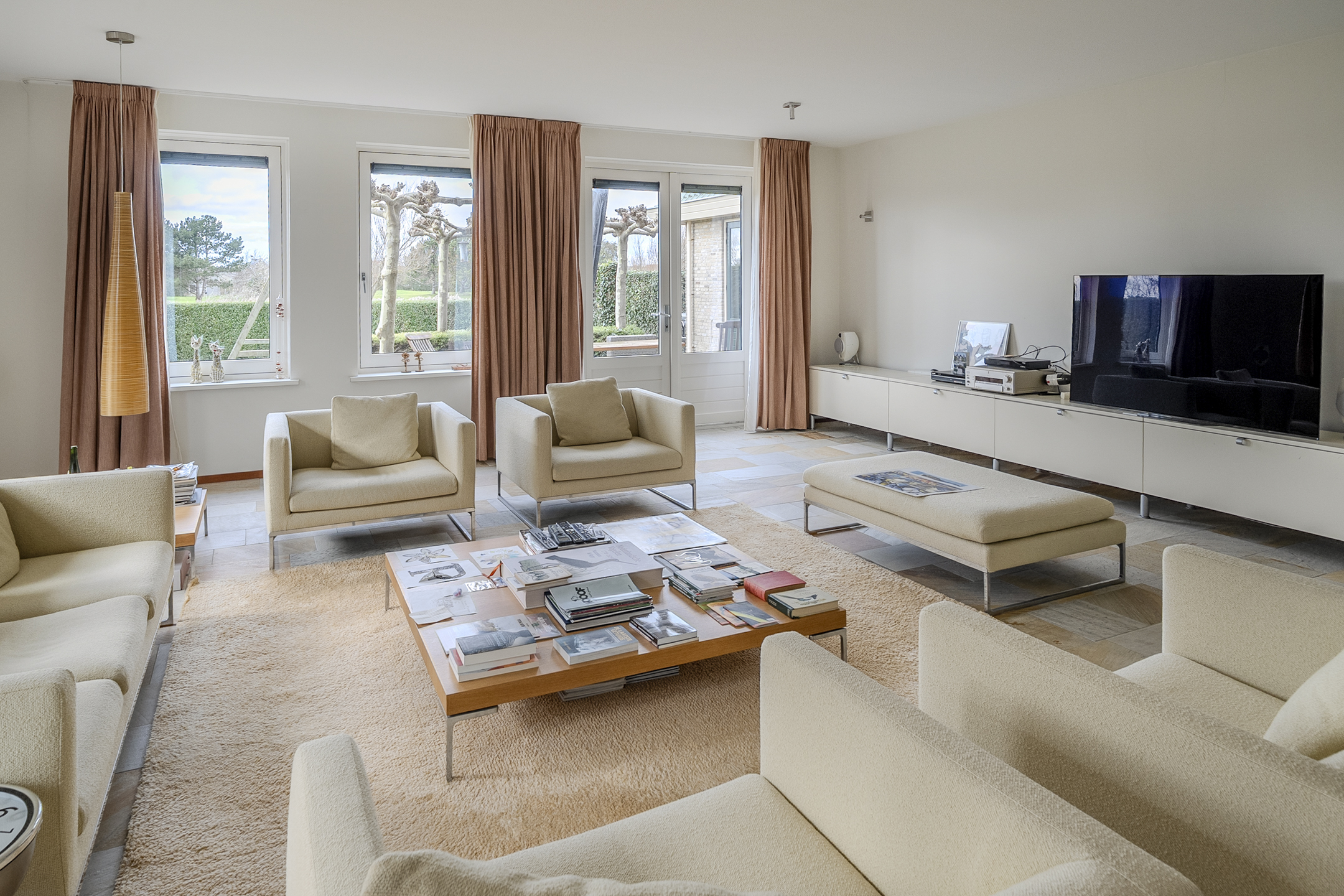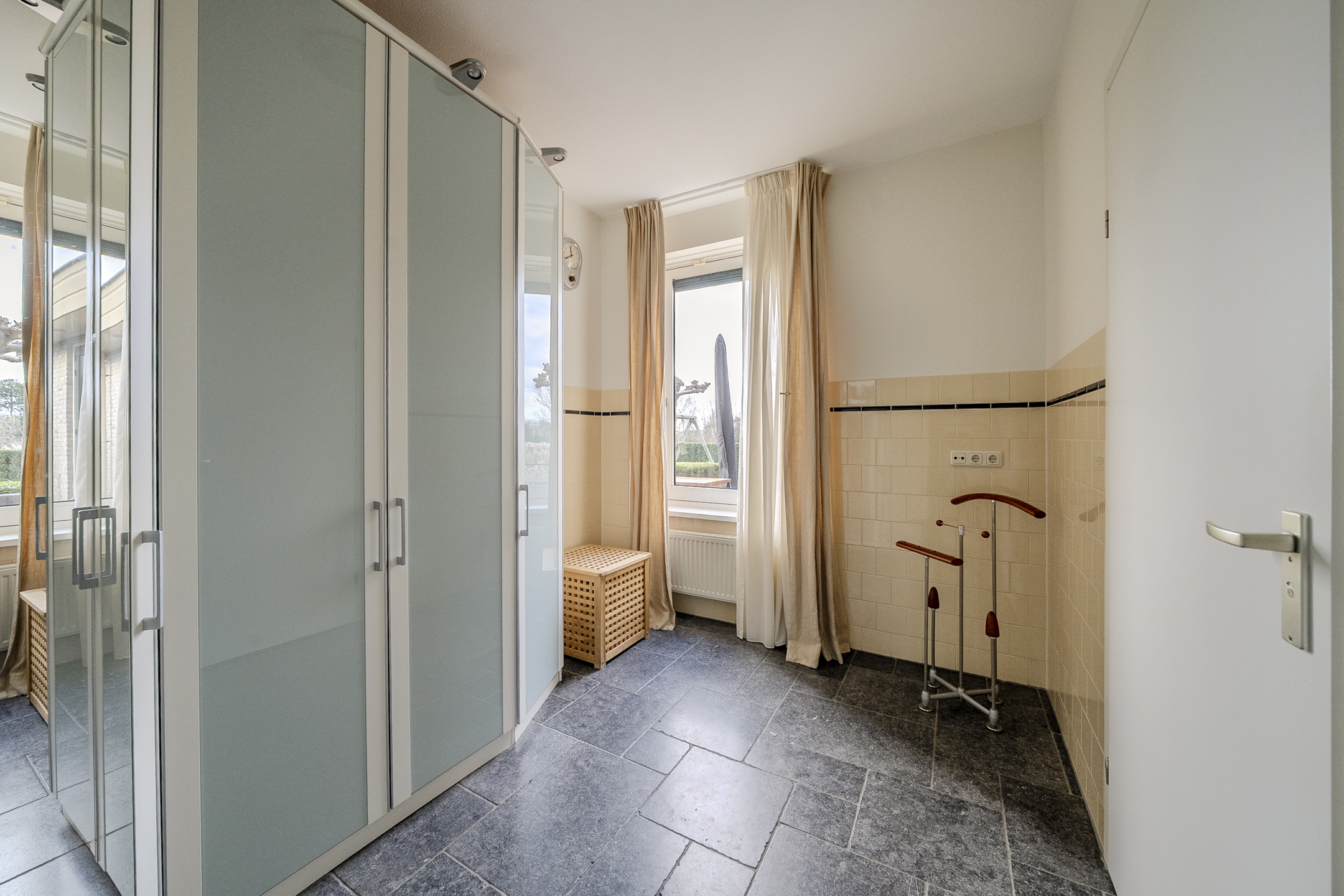 Vanuit de entree heb je ook toegang tot zowel de woonkamer als de keuken. De woonkamer is bijzonder sfeervol, riant van omvang en uitgerust met een stijlvolle tegelvloer met, net als over de rest van de benedenverdieping, vloerverwarming.