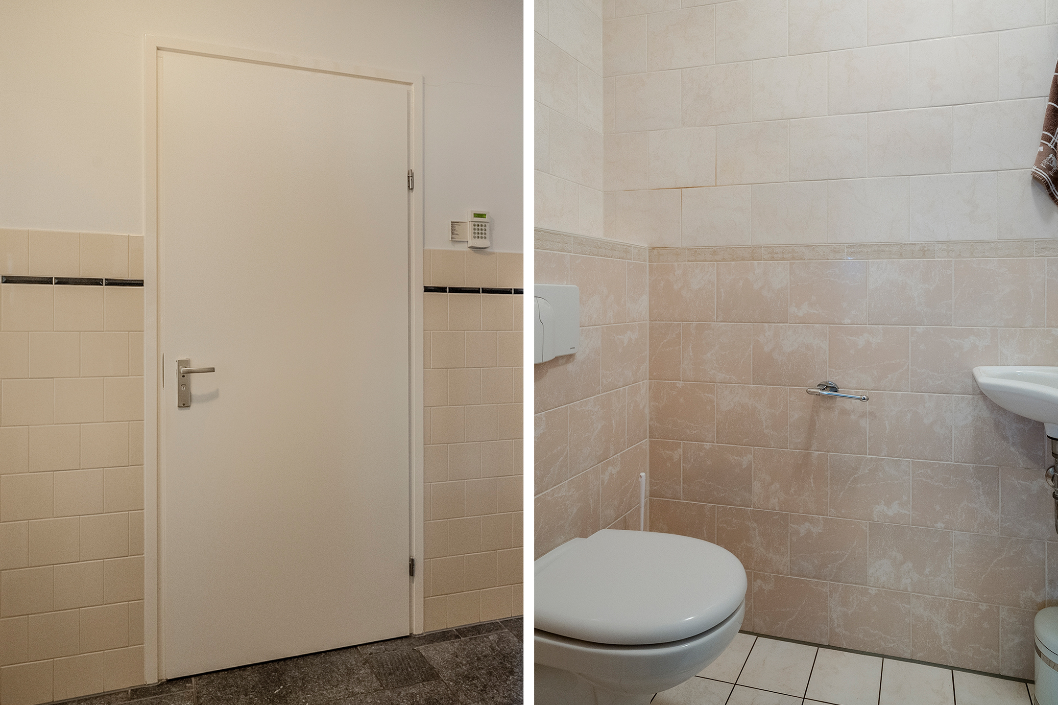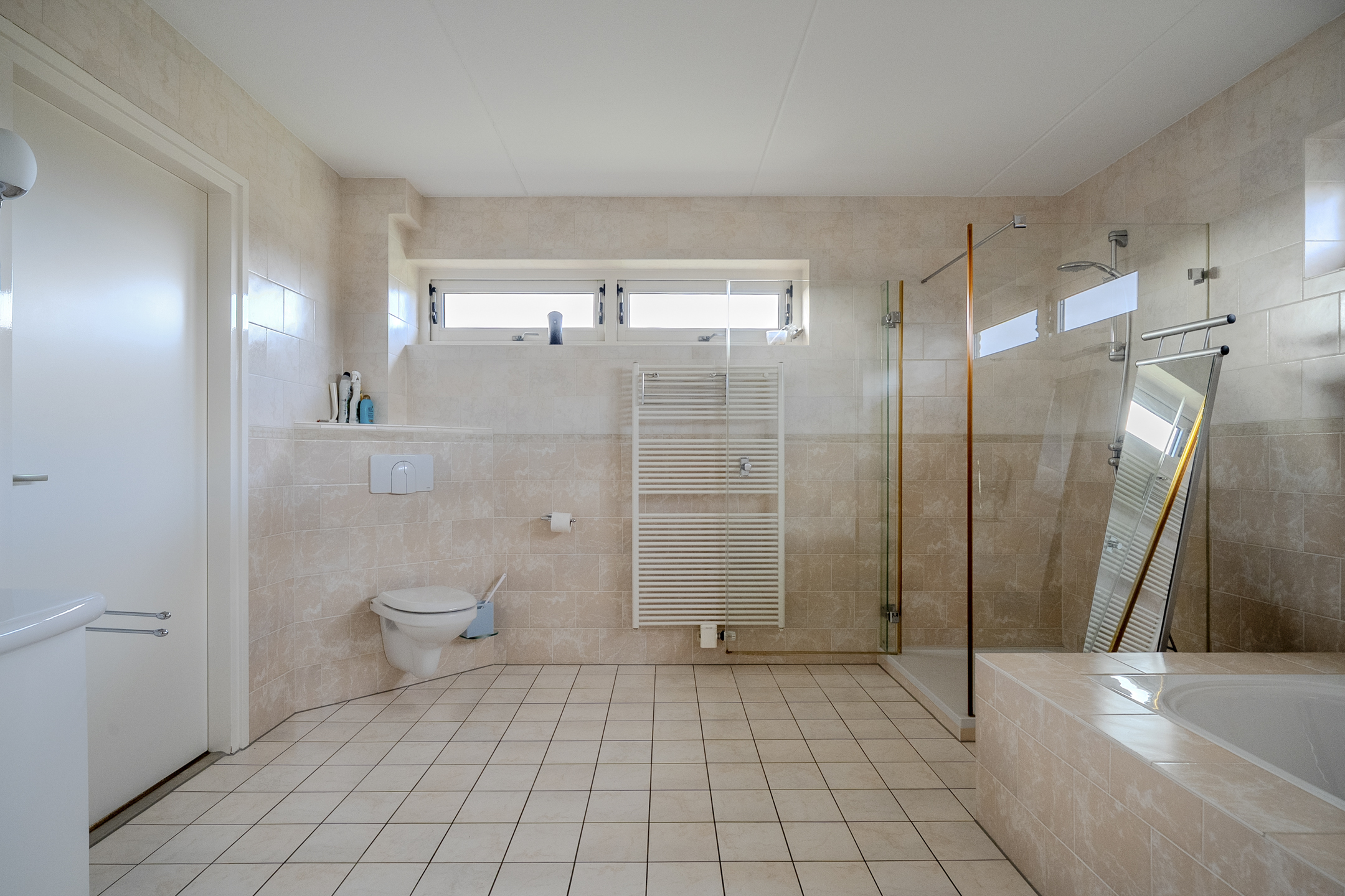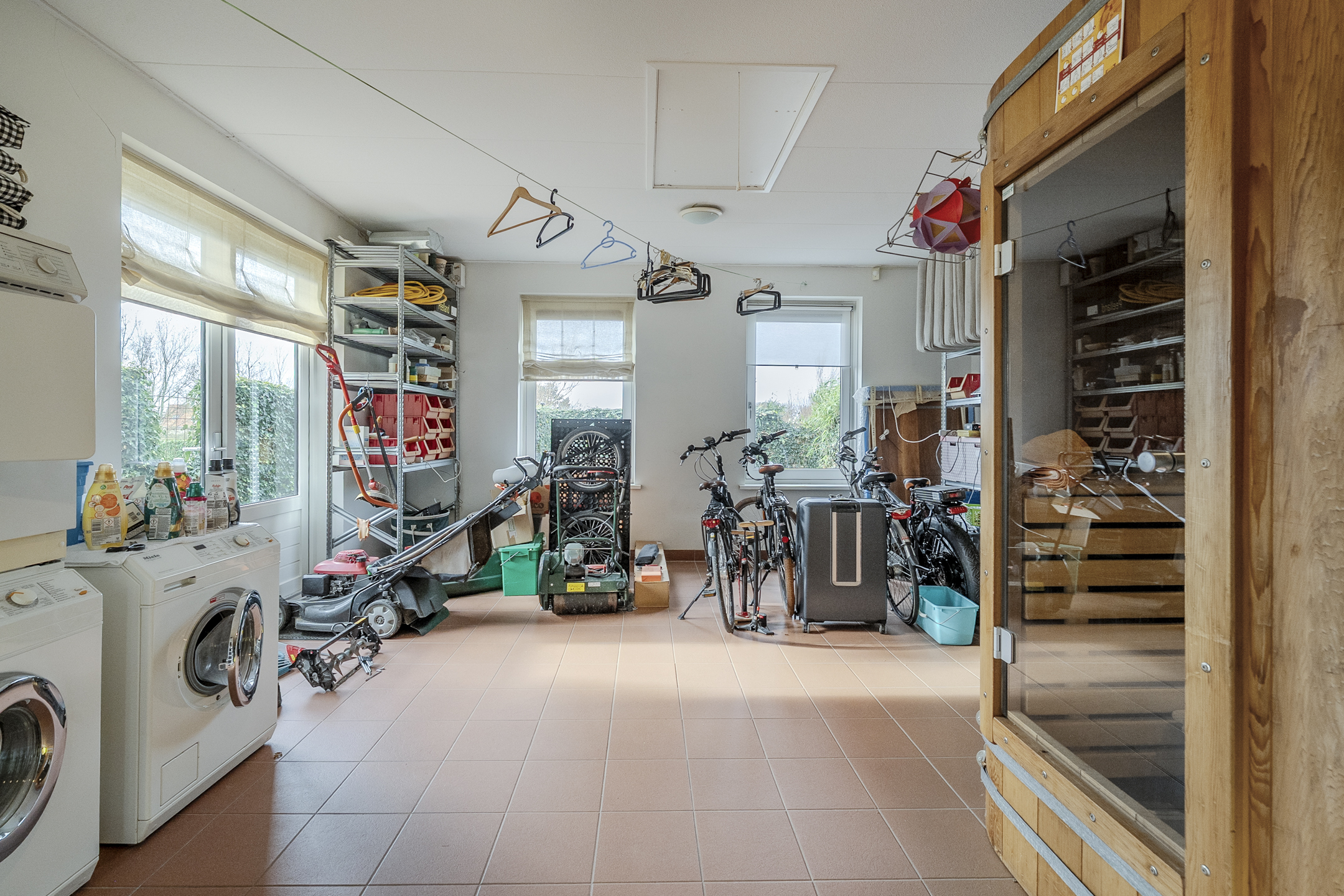 Upon entering through the front door, you first arrive in a spacious entrance hall with a meter cupboard, toilet, and staircase. Next to this is another hall from which you can access the first bathroom (with walk-in shower and washbasin) and a large garage. The garage, which has full underfloor heating, offers almost 50 m² of storage space and includes a sink and connections for washing appliances. Above the garage is a large storage attic.