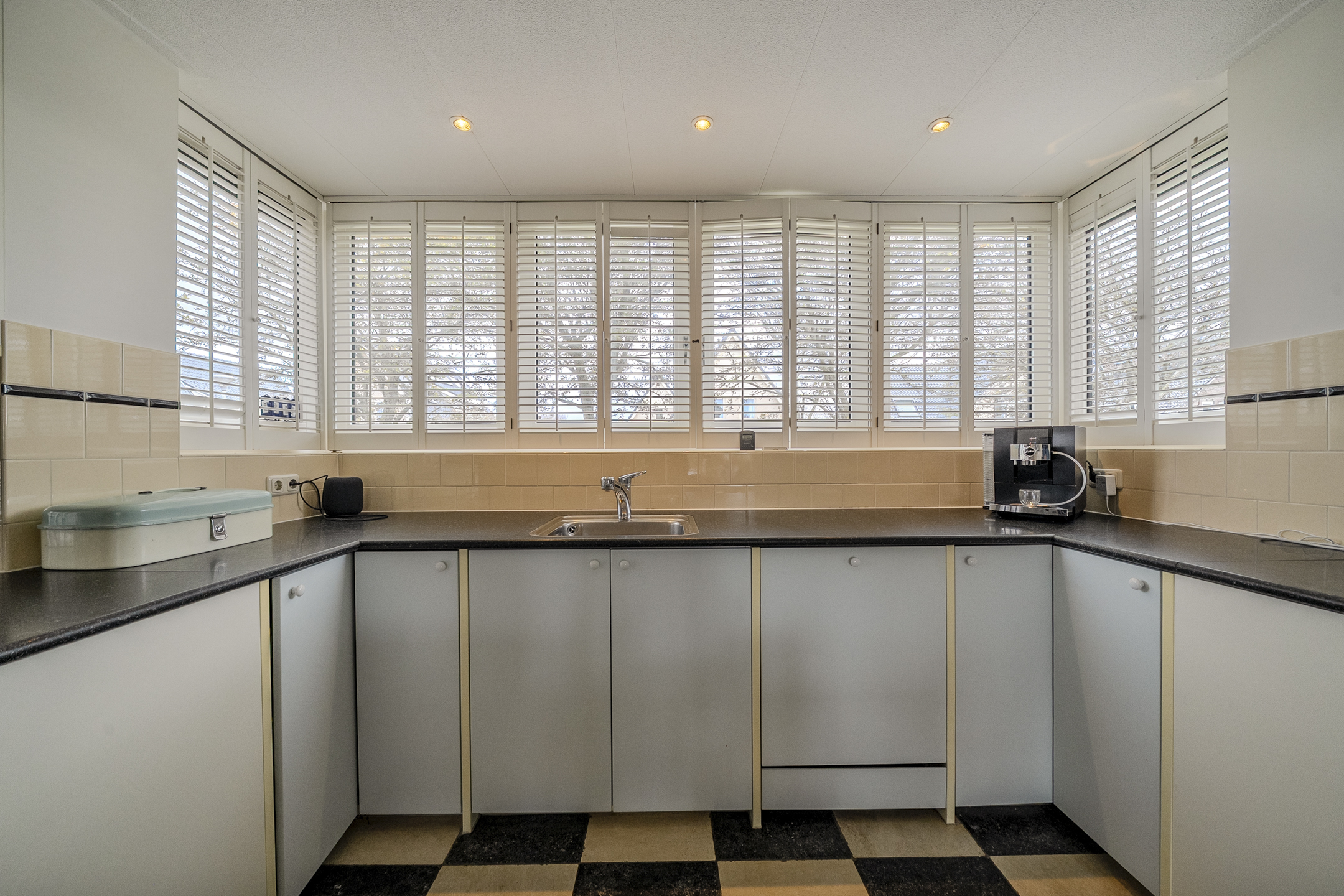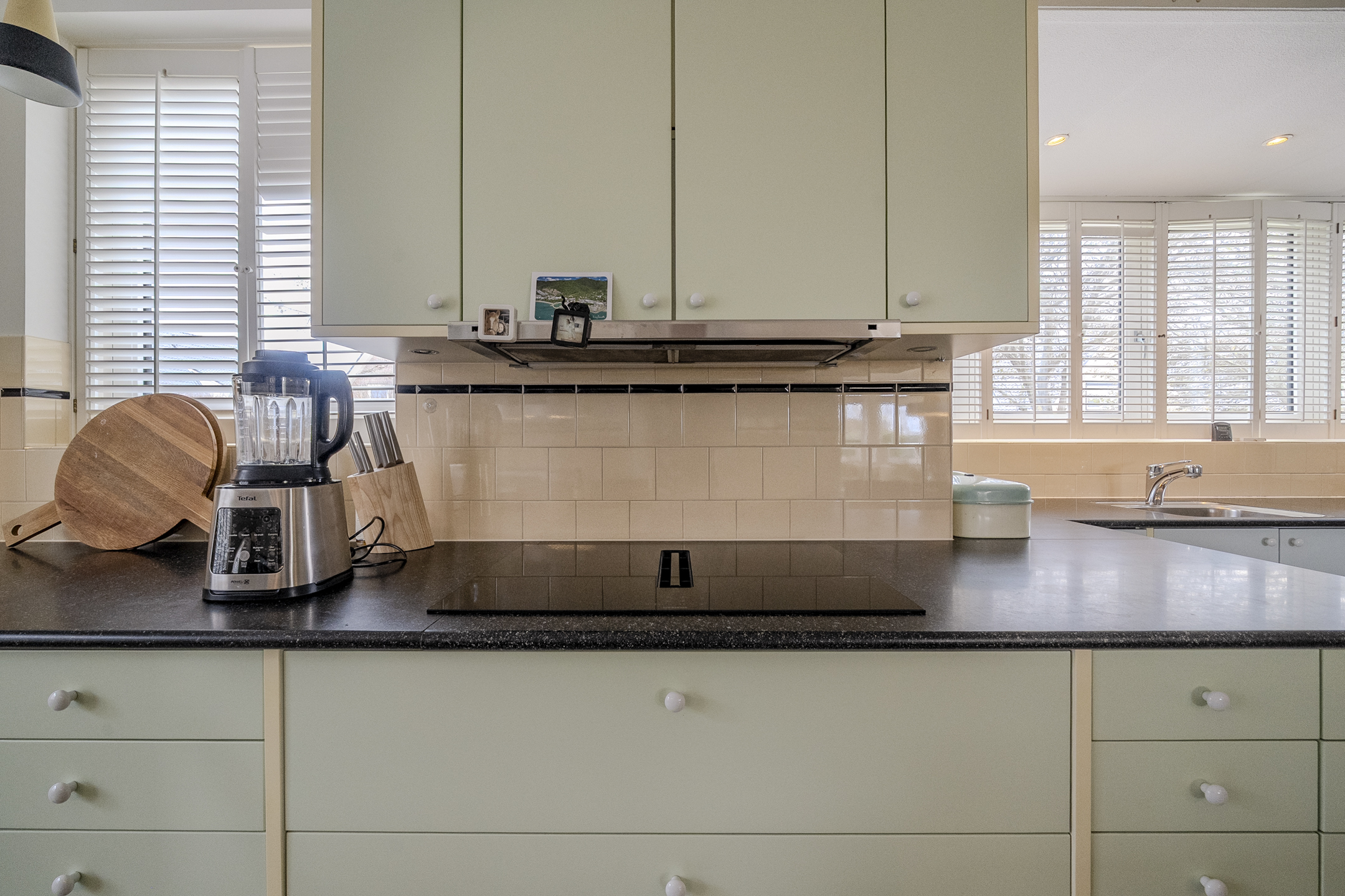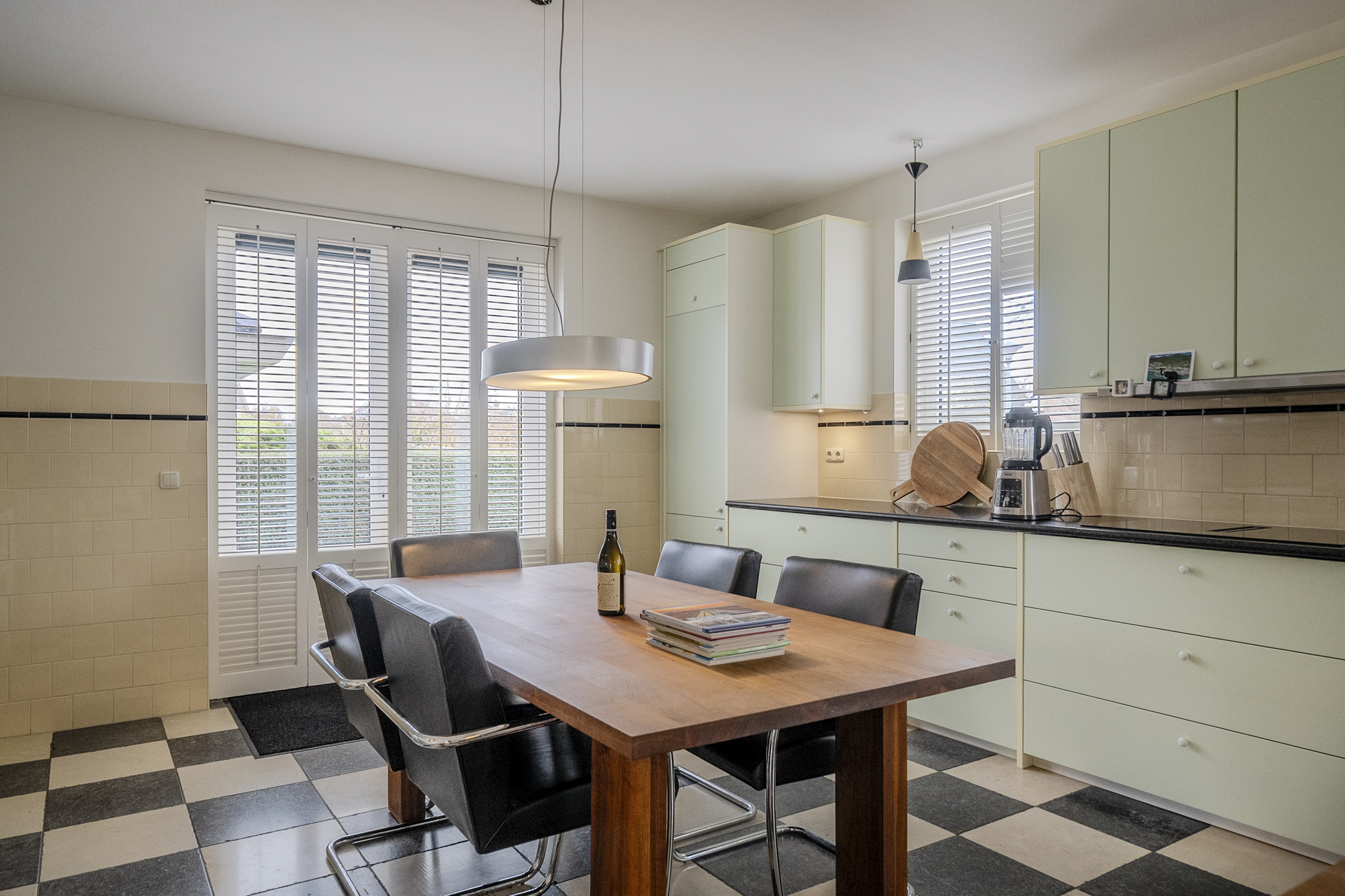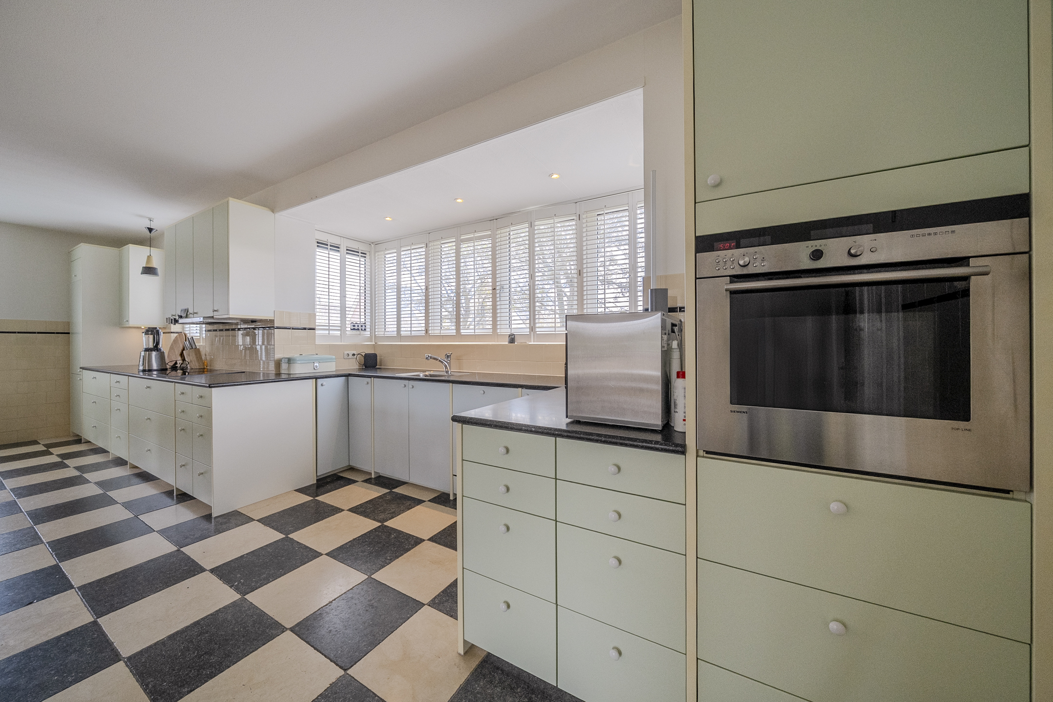 De keukeninrichting is langs de lange zijde van de woonkeuken aangebracht; ook langs het fraaie erkerraam aan de straatkant. Inbouwapparatuur is volop aanwezig. Denk hierbij aan een hoogwaardige vaatwasser, inductiekookplaat, koelkast en combioven (van de merken Miele, Liebherr, Bosch en Bora).