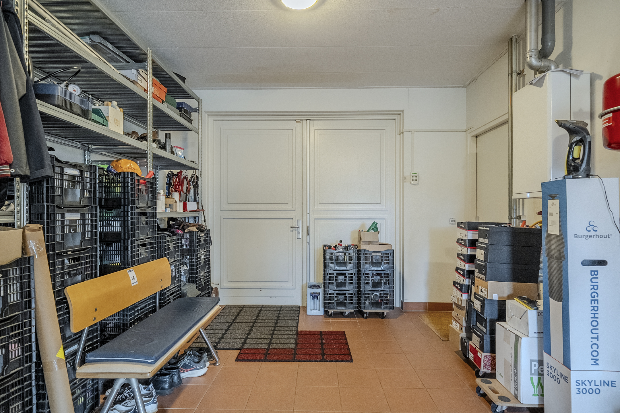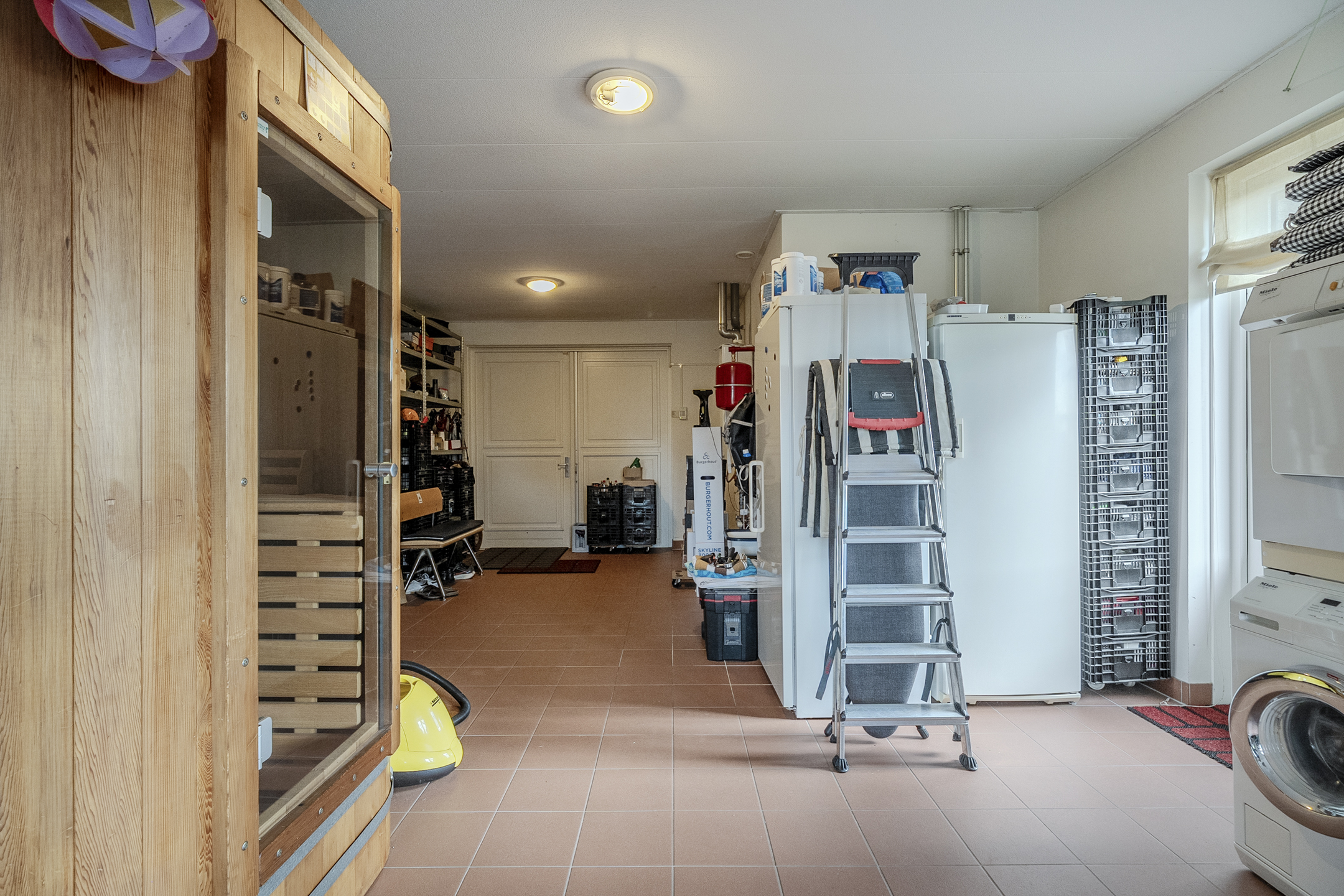 Na binnenkomst via de voordeur beland je eerst in een ruime entree met meterkast, toiletruimte en trapopgang. Hiernaast ligt nog een hal waarvandaan je de eerste badkamer (met inloopdouche en wastafelmeubel) en een grote garage bereikt. De garage met volledige vloerverwarming is goed voor bijna 50 m2 aan opslagruimte en bevat een wastafel en aansluitpunten voor wasapparatuur. Boven de garage bevindt zich nog een grote opbergzolder.