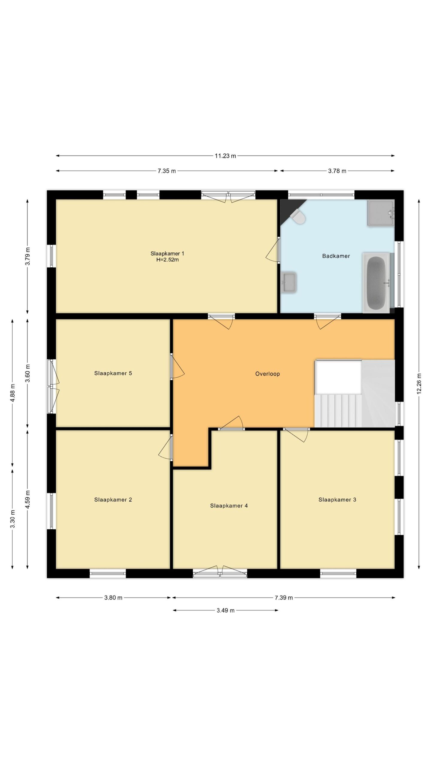 Op de eerste verdieping kom je op een ruime overloop. Hiervandaan zijn maar liefst vijf volwaardige slaapkamers bereikbaar, allemaal van flinke omvang. Hiervan zijn drie van de kamers verrijkt met een Frans balkon. Tevens tref je hier de tweede badkamer van het huis. Het gaat hier om een compleet uitgeruste badkamer met vloerverwarming, een groot ligbad, een comfortabele inloopdouche, een wastafelmeubel en een vrij hangend closet.