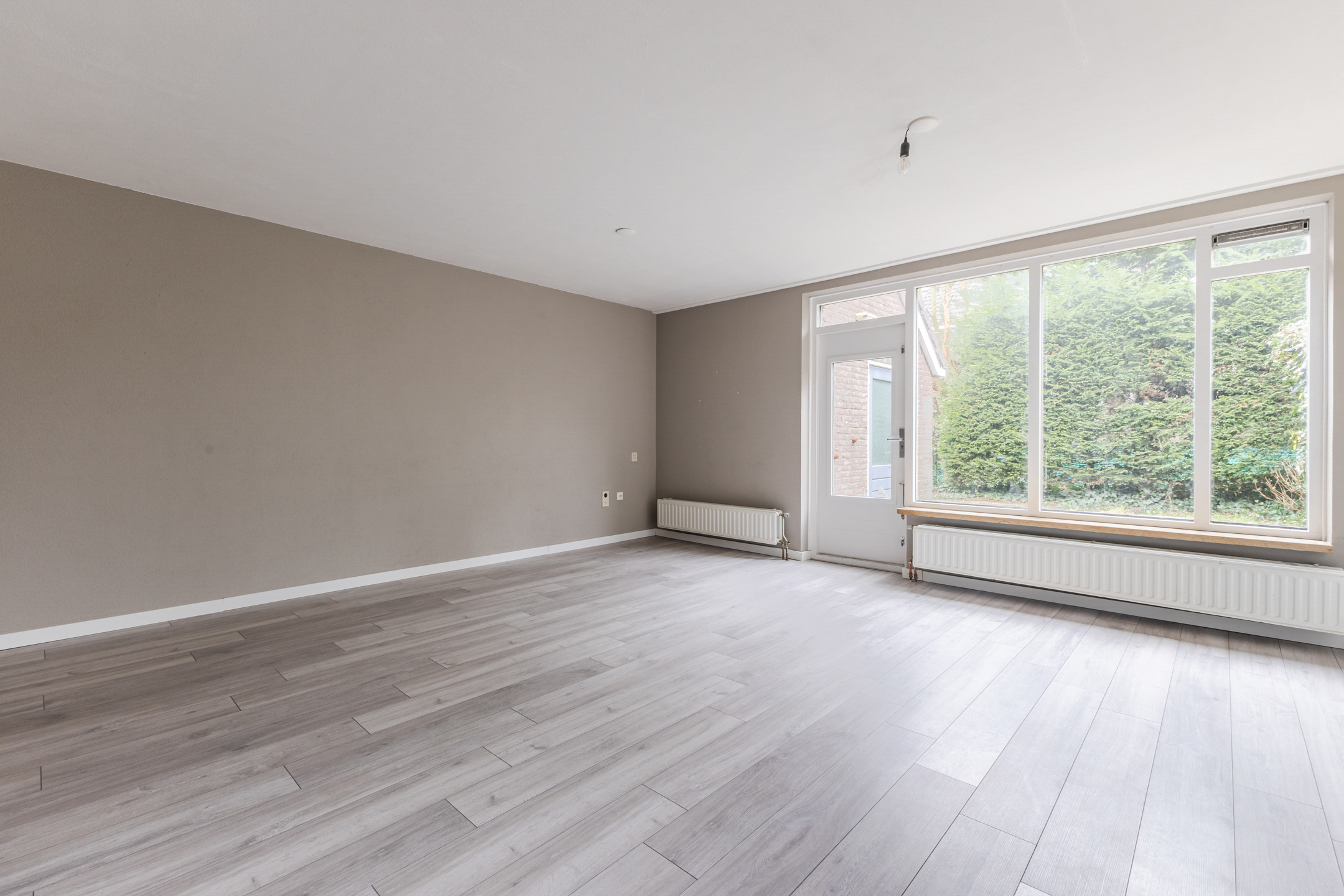De lichte ruime woonkamer is tuingericht en voorzien van een tuindeur naar de zonnige besloten tuin met aangebouwde stenen berging.