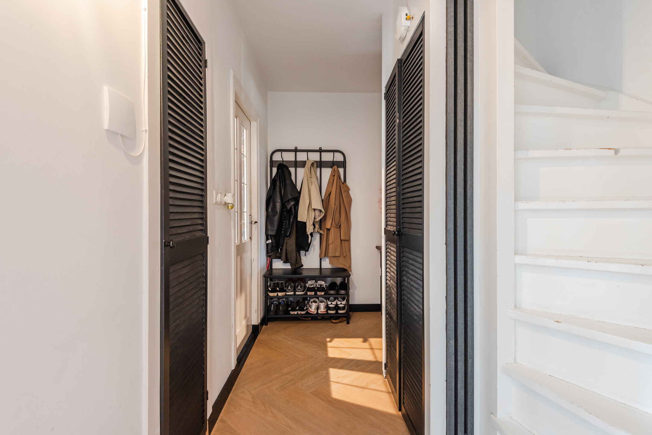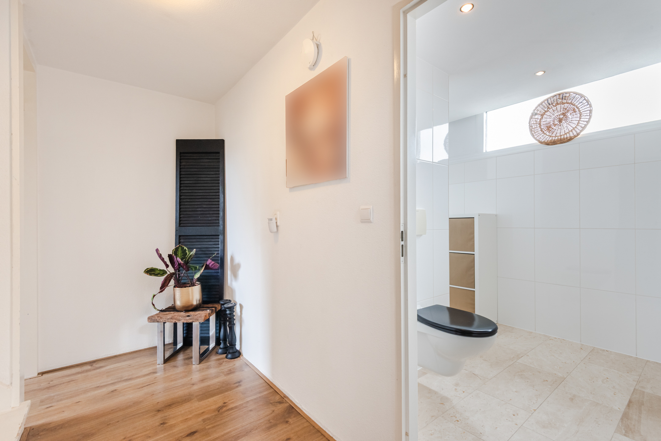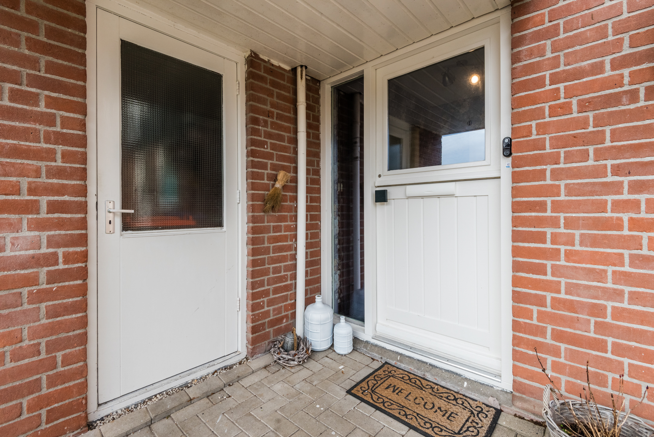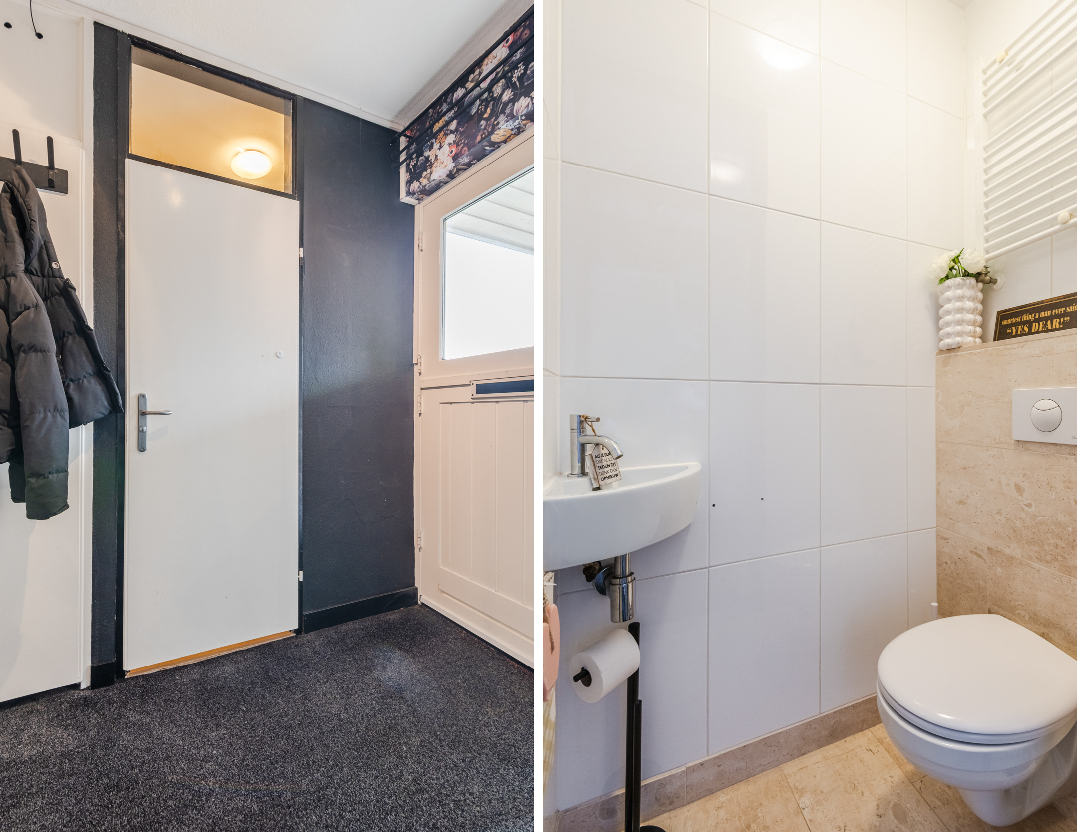 Via de betegelde voortuin met ruime oprit richting de garage (ca. 8 meter lang), komen we aan bij de voordeur van de woning. Achter de voordeur vinden we de entree met garderobe, meterkast, toilet met wandcloset, fonteintje en geheel betegelde wanden, inpandige toegang tot de garage en toegang tot een extra hal met voorraadkast, trapkast, trapopgang naar de eerste verdieping en de toegang tot de woonkamer met open keuken.