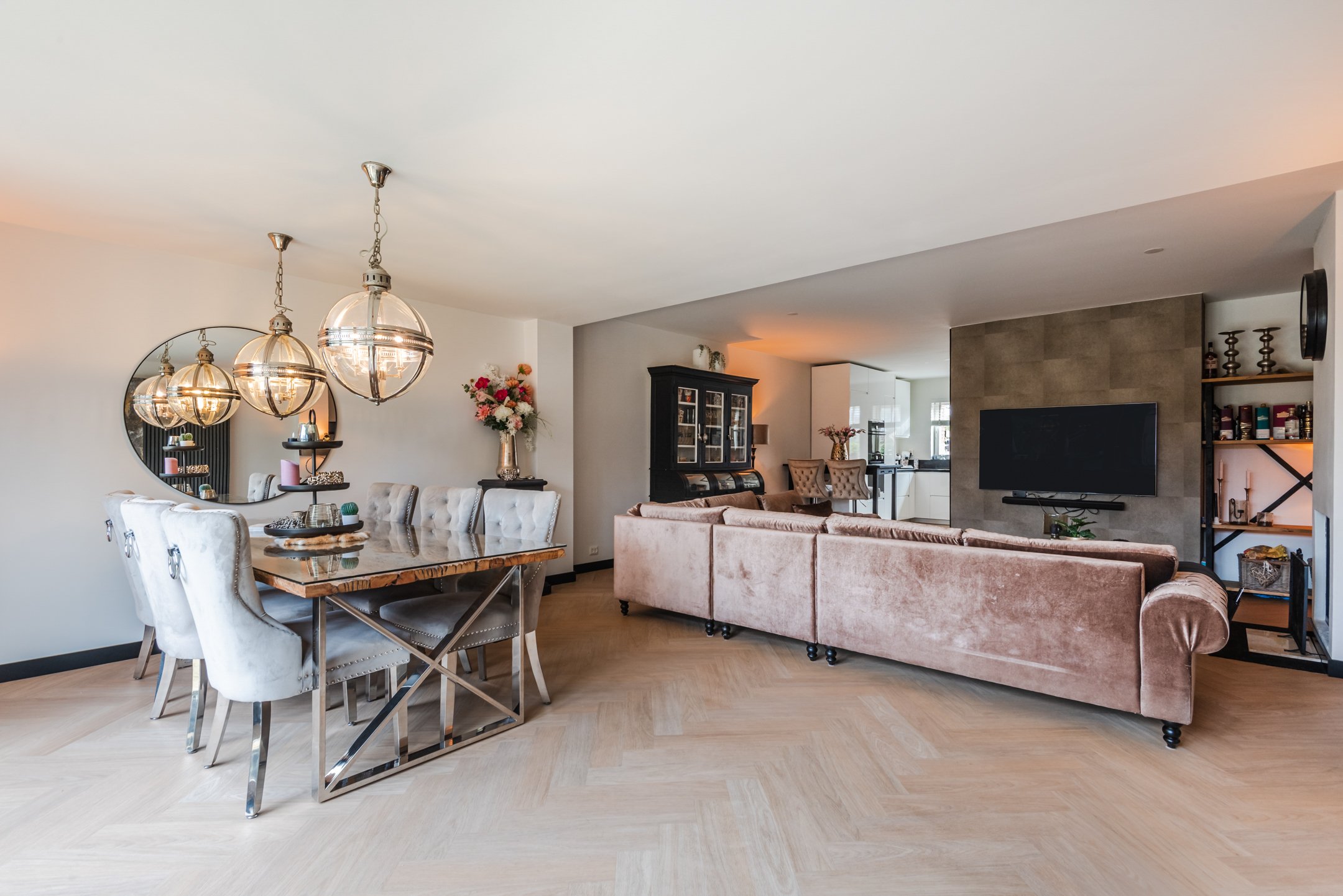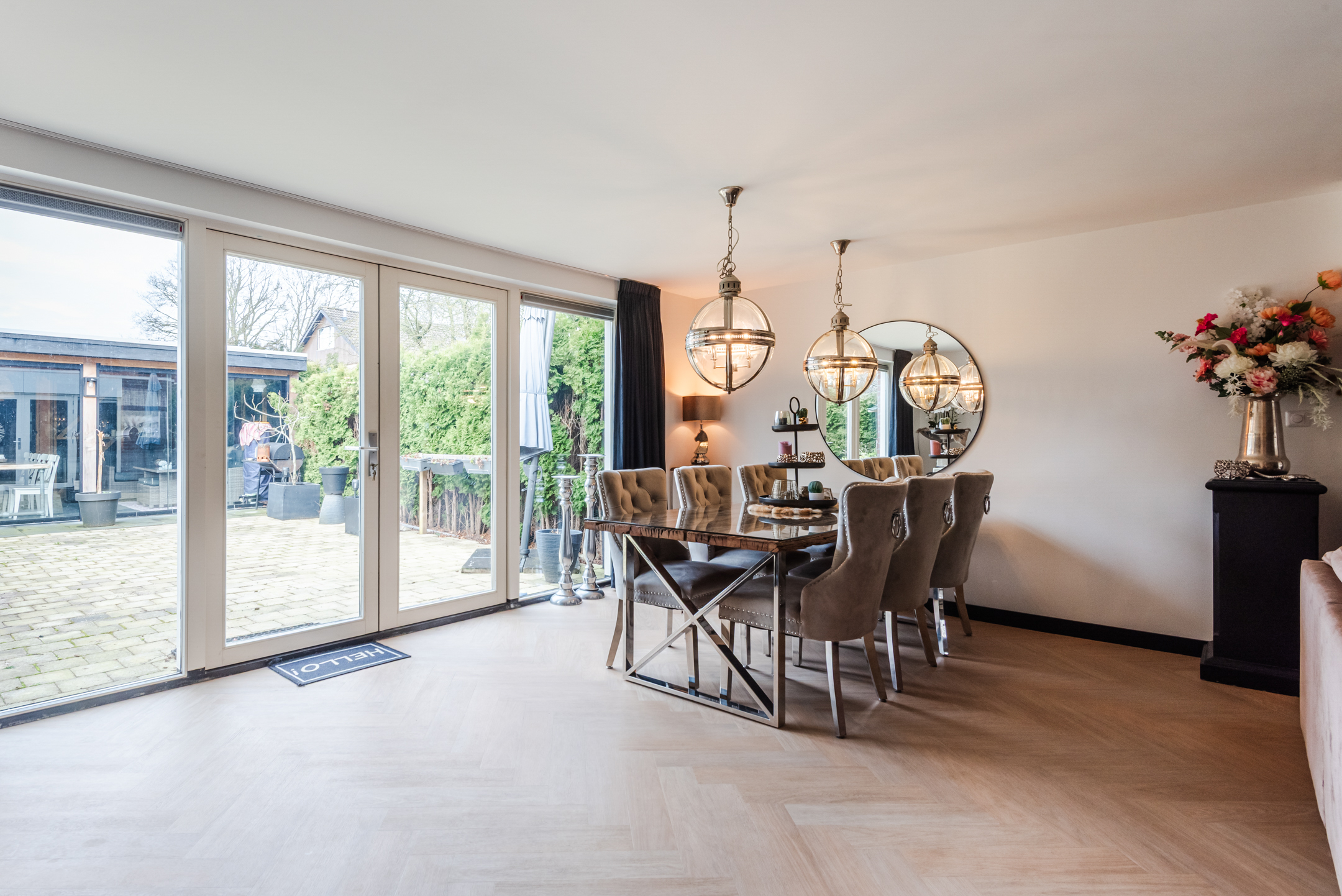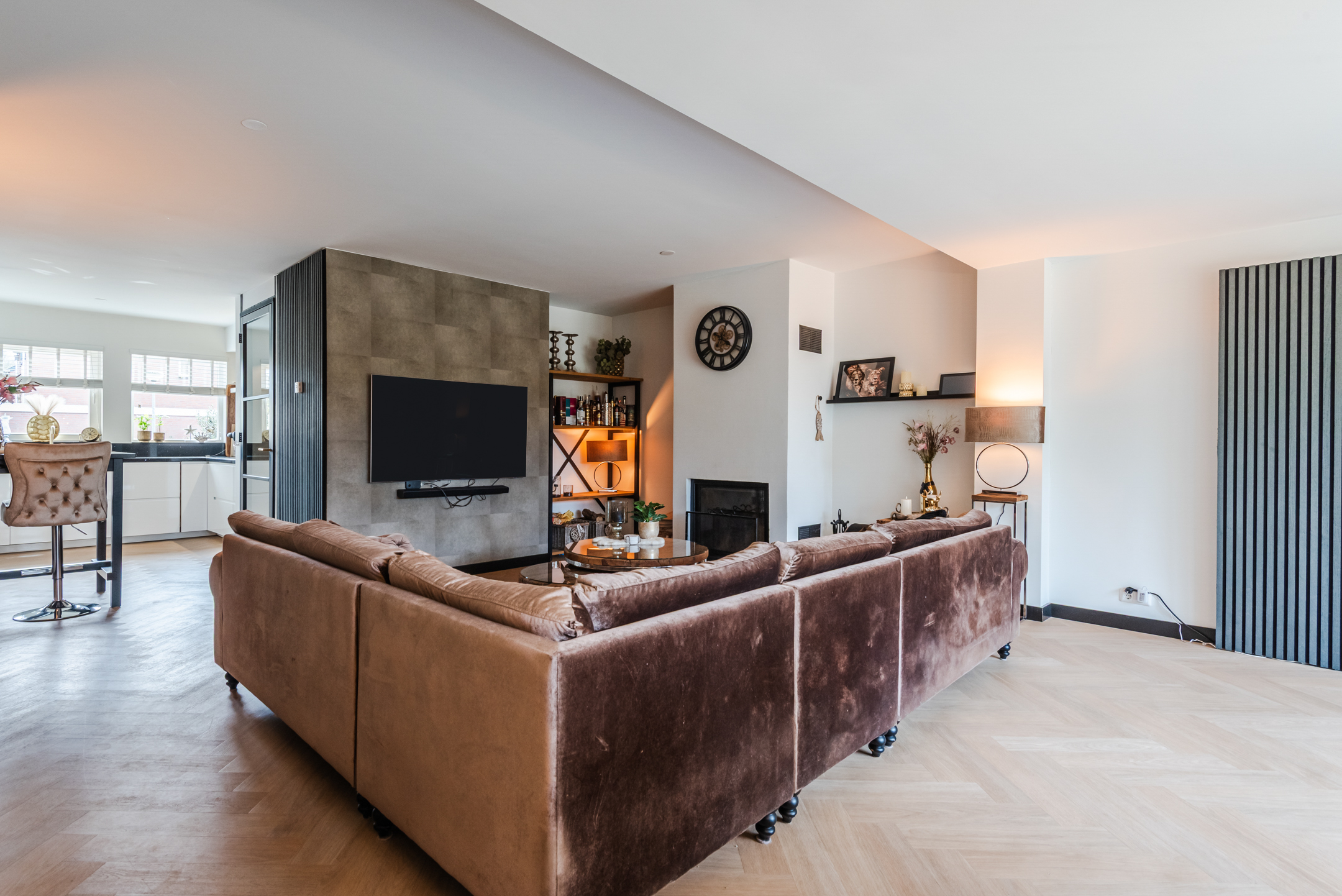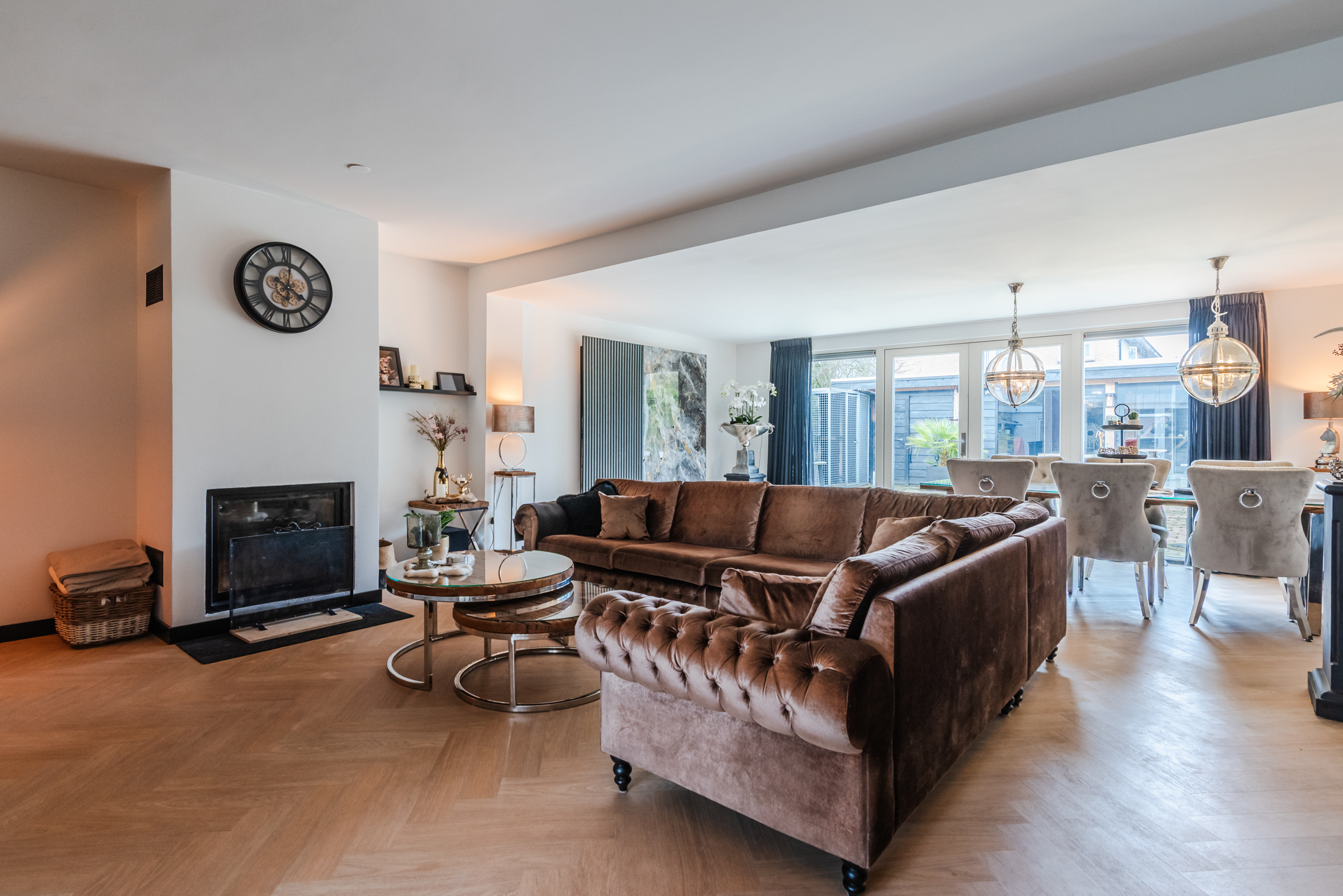 De ruime woonkamer is tuingericht, met ca. 4 meter uitgebouwd, geniet van een grote hoeveelheid lichtinval en is strak afgewerkt met een PVC-laminaatvloer en vloerverwarming. Openslaande deuren bieden toegang tot de tuin en de gezellige open haard is een fijne sfeermaker.