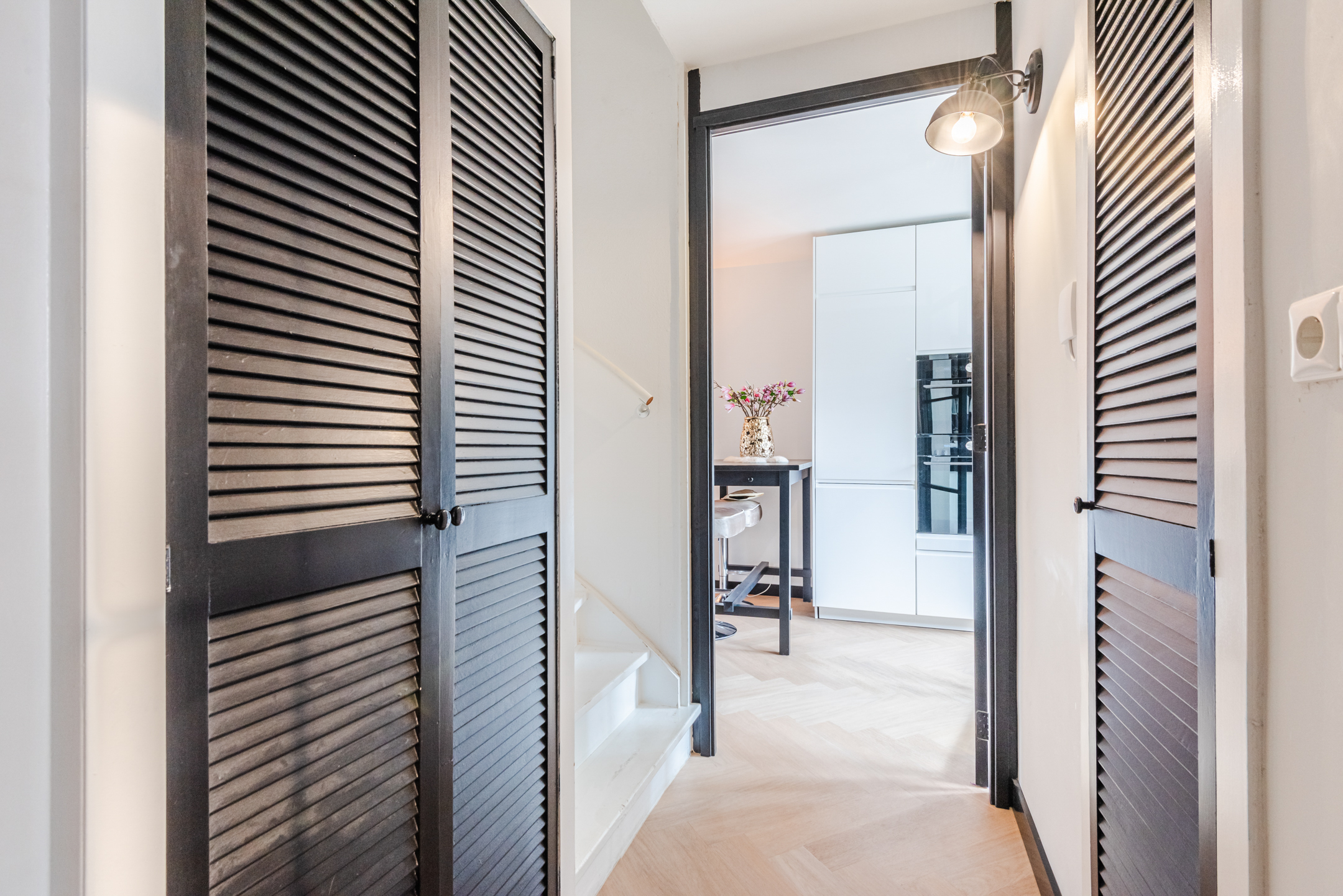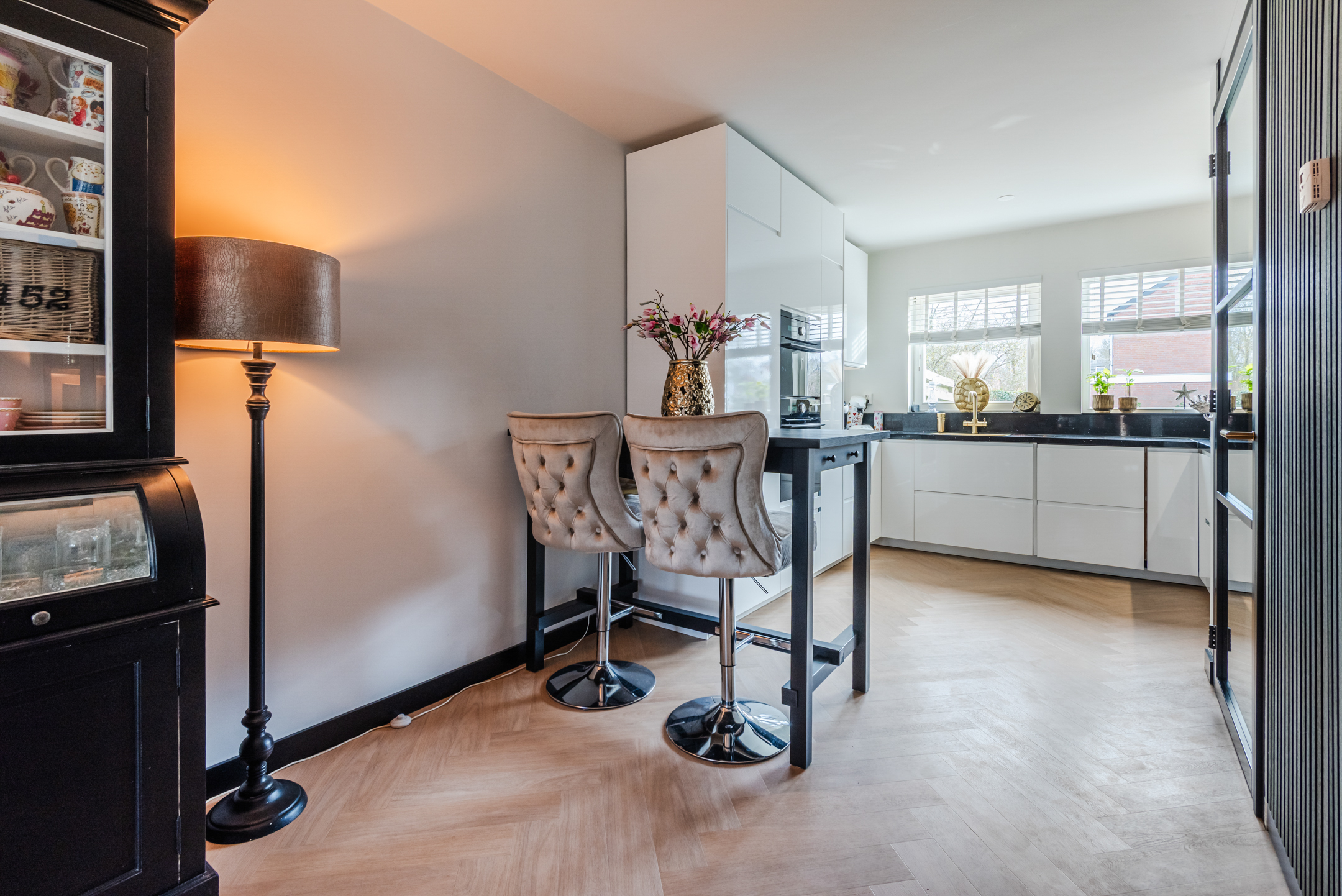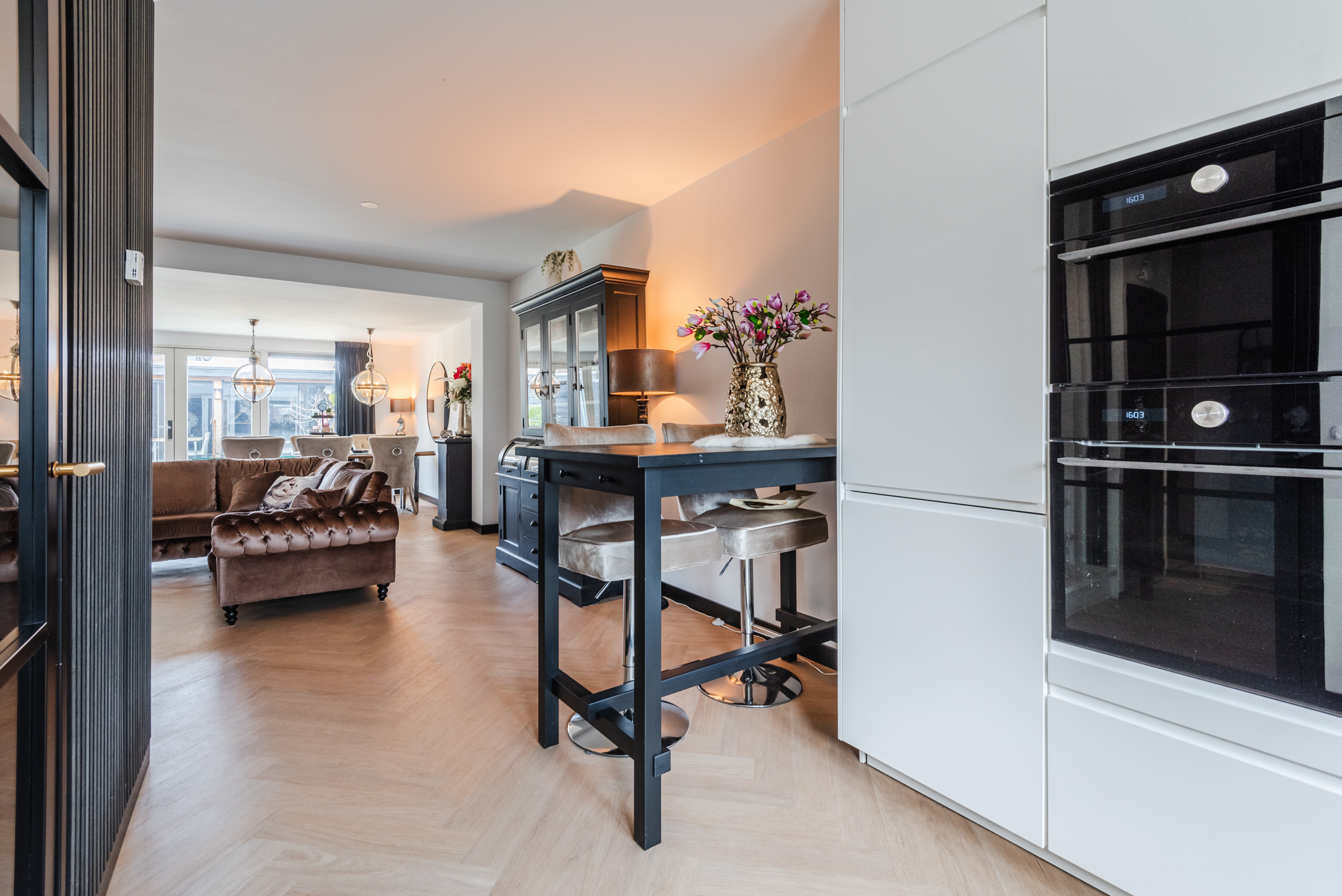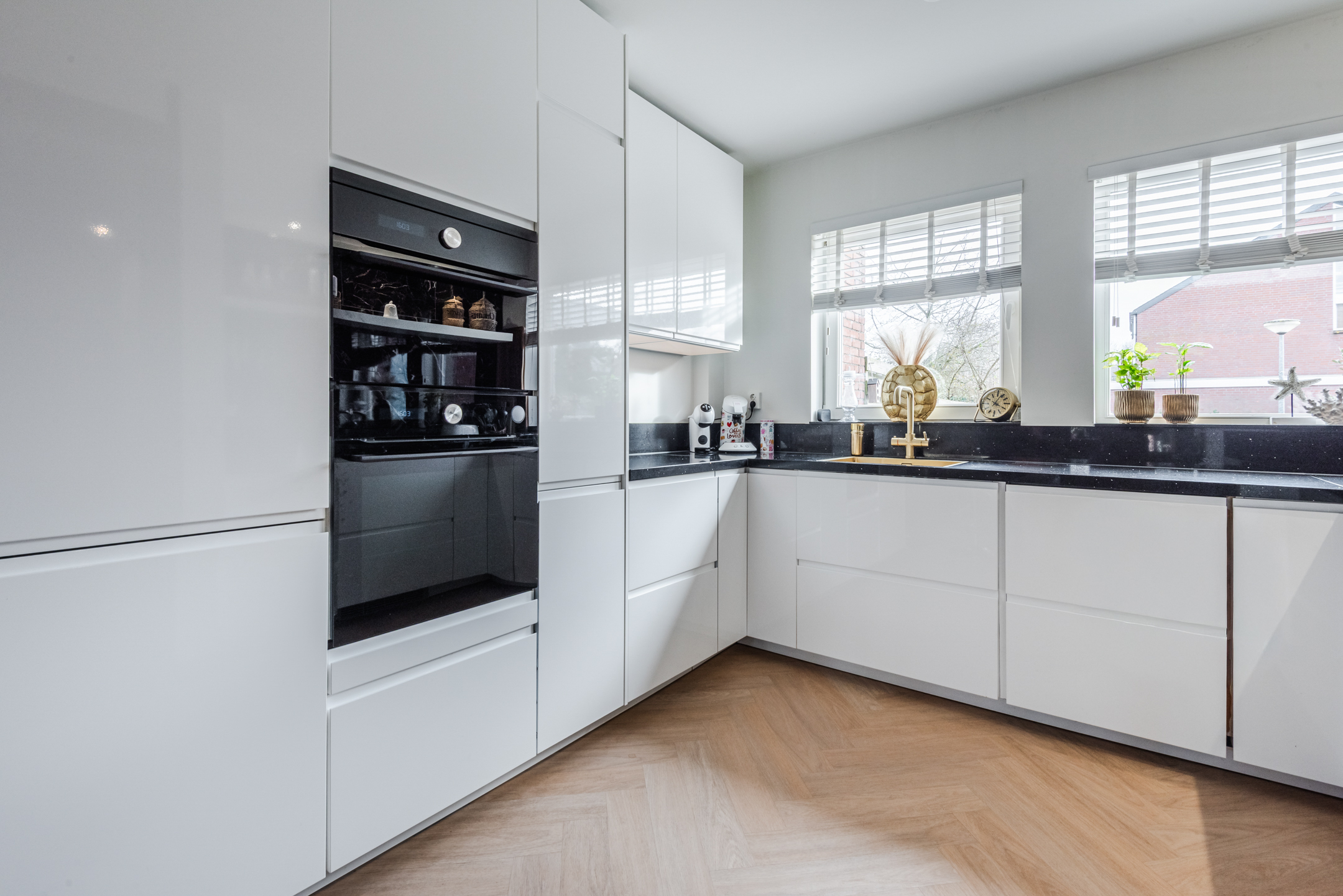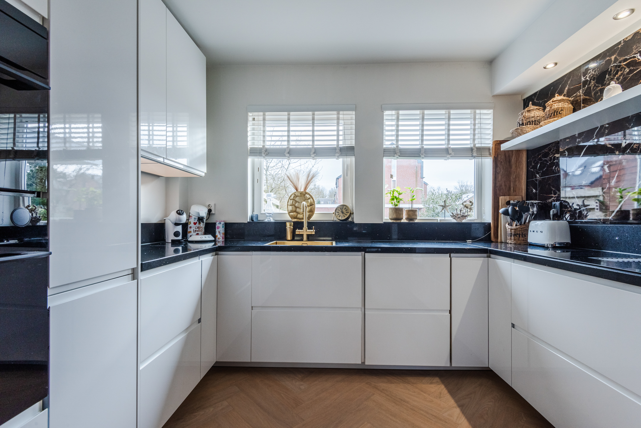 De moderne open keuken bevindt zich aan de voorzijde van het huis, in een U-vorm en is voorzien van stijlvolle greeploze witte fronten. De keuken is voorzien van een inductiekookplaat met afzuiging, koel-/vriescombinatie, combioven/magnetron, quooker en een vaatwasser.